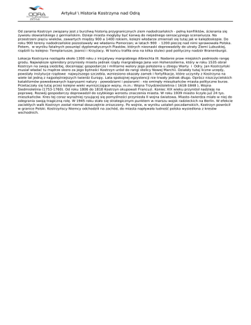 Artykuł \ Historia Kostrzyna nad Odrą Od zarania Kostrzyn związany jest z burzliwą historią przygranicznych ziem nadodrzańskich - pełną konfliktów, ścierania się żywiołu słowiańskiego z germańskim. Dzieje miasta mogłyby być kanwą do niejednego sensacyjnego scenariusza. Na przestrzeni pięciu wieków, zawartych między 900 a 1400 rokiem, kolejni włodarze zmieniali się tutaj jak w kalejdoskopie. Do roku 900 tereny nadodrzańskie pozostawały we władaniu Pomorzan; w latach 900 - 1200 pieczę nad nimi sprawowała Polska. Potem, w wyniku fatalnych posunięć dyplomatycznych Piastów, których niesnaski doprowadziły do utraty Ziemi Lubuskiej, rządzili tu kolejno: Templariusze, Joanici i Krzyżacy. W końcu trafiła ona na kilka stuleci pod polityczny nadzór Branenburgii. Lokacja Kostrzyna nastąpiła około 1300 roku z inicjatywy margrabiego Albrechta III. Nadanie praw miejskich podniosło rangę grodu. Największe splendory przyniosły miastu jednak rządy margrabiego Jana von Hohenzollerna, który w roku 1535 obrał Kostrzyn na swoją siedzibę, doceniając gospodarcze i militarne walory jego położenia u zbiegu Warty i Odry. Jan Kostrzyński musiał władać tu mądrze skoro za jego bytności Kostrzyn urósł do rangi stolicy Nowej Marchii. Działały tutaj liczne urzędy, powstały instytucje rządowe najwyższego szczebla, wzniesiono okazały zamek i fortyfikacje, które uczyniły z Kostrzyna na wiele lat jedną z najpotężniejszych twierdz Europy. Lata spokojnej egzystencji nie trwały jednak długo. Oprócz niszczycielskich kataklizmów powodowanych kaprysami natury - powodziami i pożarami - nie ominęły mieszkańców miasta polityczne burze. Przetaczały się tutaj przez kolejne wieki wyniszczające wojny, m.in.: Wojna Trzydziestoletnia ( 1618-1848 ), Wojna Siedmioletnia (1753-1760). Od roku 1806 do 1818 Kostrzyn okupowali Francuzi. Koniec XIX wieku przyniósł nadzieję na poprawę. Rozwój gospodarczy doprowadził do szybkiego wzrostu znaczenia miasta. W roku 1939 miasto liczyło już 24 tys. mieszkańców. Kres tej coraz wyraźniej rysującej się pomyślności przyniosła II wojna światowa. Miasto–twierdza miało w niej do odegrania swoją tragiczną rolę. W 1945 roku stało się strategicznym punktem w marszu wojsk radzieckich na Berlin. W efekcie zaciekłych walk Kostrzyn został niemal doszczętnie zniszczony. Po wojnie, w wyniku ustaleń poczdamskich, Kostrzyn powrócił w granice Polski. Kostrzyńscy Niemcy odchodzili na zachód, do miasta napływała ludność polska wysiedlona z kresów wschodnich. Powered by TCPDF (www.tcpdf.org)