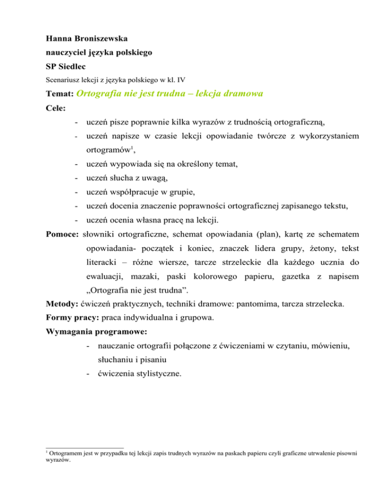Hanna Broniszewska nauczyciel języka polskiego SP Siedlec Scenariusz lekcji z języka polskiego w kl. IV Temat: Ortografia nie jest trudna – lekcja dramowa Cele: - uczeń pisze poprawnie kilka wyrazów z trudnością ortograficzną, - uczeń napisze w czasie lekcji opowiadanie twórcze z wykorzystaniem ortogramów1, - uczeń wypowiada się na określony temat, - uczeń słucha z uwagą, - uczeń współpracuje w grupie, - uczeń docenia znaczenie poprawności ortograficznej zapisanego tekstu, - uczeń ocenia własna pracę na lekcji. Pomoce: słowniki ortograficzne, schemat opowiadania (plan), kartę ze schematem opowiadania- początek i koniec, znaczek lidera grupy, żetony, tekst literacki – różne wiersze, tarcze strzeleckie dla każdego ucznia do ewaluacji, mazaki, paski kolorowego papieru, gazetka z napisem „Ortografia nie jest trudna”. Metody: ćwiczeń praktycznych, techniki dramowe: pantomima, tarcza strzelecka. Formy pracy: praca indywidualna i grupowa. Wymagania programowe: - nauczanie ortografii połączone z ćwiczeniami w czytaniu, mówieniu, słuchaniu i pisaniu - ćwiczenia stylistyczne. 1 Ortogramem jest w przypadku tej lekcji zapis trudnych wyrazów na paskach papieru czyli graficzne utrwalenie pisowni wyrazów. PRZEBIEG LEKCJI 1. Powitanie. 2. Opowiadanie o nastroju, w jakim uczniowie przyszli na lekcję (chętni lub wybrani) – element integrujący grupę. 3. Podział na zespoły – dzieci losują żetony z pudełka, następnie zajmują miejsce w grupach. 4. Wybór lidera, przypięcie znaczka. 5. Zapis tematu do zeszytu. 6. Rozdanie kopert w kolorze grupy z zamieszczonymi w nich zadaniami i tekstami wierszy. 7. Zapoznanie w grupach z tekstem literackim. 8. Prezentacja tekstu na forum klasy – czyta wyznaczona osoba z grupy, może nią być lider. 9. Wyszukiwanie w tekście trudnych wyrazów i zapisanie ich na paskach papieru, starannie, tak, by można było zawiesić je na gazetce. 10.Grupa wybiera wśród tych wyrazów 3, ich zdaniem najtrudniejsze i przygotowuje pantomimę. 11.Prezentacja pantomimiczna wyrazów (jedna osoba lub cała grupa), pozostali uczniowie odgadują wyraz. 12.Pisanie opowiadania twórczego z użyciem tych trudnych wyrazów. Uczniowie otrzymują plan opowiadania oraz kartę z jego proponowanym początkiem i zakończeniem. Przypomnienie o akapitach. Plan: 1. Zawiązanie akcji. (Co się wydarzyło? Gdzie? Kiedy?) 2. Rozwój akcji. (Co było potem? Jak? Jak długo?) 3. Punkt kulminacyjny. (Punkt przełomowy, wydarzenie najważniejsze, wytworzenie jakiegoś pomysłu.) 4. Spadek akcji. (Realizacja pomysłu. Uspokajanie akcji, zmierzanie do zakończenia.) 5. Rozwiązanie. (Jak zakończyła się przygoda?) Schemat opowiadania: Biegł chłopczyk polną ścieżką ..... ...... To było bar -dzo dobre dziecko. 13. Prezentowanie przez grupy opowiadania, czyta lider lub inna osoba z grupy. 14. Nauczyciel ocenia ustnie opowiadania, a następnie zabiera prace, by przeanalizować je dokładnie. 15.Podsumowanie lekcji w postaci gazetki, upięcie na gazetce opracowanego słownictwa. ORTOGRAFIA Różowy NIE JEST TRUDNA 16.Ewaluacja zajęć. Uczniowie oceniają sposób przeprowadzenia zajęć i swoją pracę metodą tarczy strzeleckiej. a) ocena zajęć – każda grupa posiada kartę z tarczą do oceny zajęć, grupa ocenia lekcję jako grupa, zaznaczając kropkami na tarczy swoje spostrzeżenia. pomoce nauczyciel atmosfera koleżanki/koledzy b) uczniowie oceniają swoją pracę na kartkach indywidualnie wiedza koncentracja uwagi zaangażowanie współpraca z innymi 17.Zakończenie zajęć, podziękowanie za pracę, czynności organizacyjno – porządkowe.