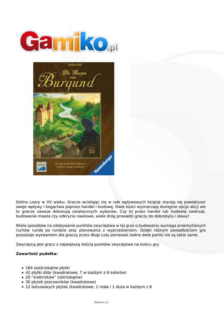 Dolina Loary w XV wieku. Gracze wcielając się w role wpływowych książąt starają się powiększać swoje wpływy i bogactwa poprzez handel i budowę. Dwie kości wyznaczają dostępne opcje akcji ale to gracze zawsze dokonują ostatecznych wyborów. Czy to przez handel lub hodowlę zwierząt, budowanie miasta czy odkrycia naukowe, wiele dróg prowadzi graczy do dobrobytu i sławy! Wiele sposobów na zdobywanie punktów zwycięstwa w tej grze o budowaniu wymaga przemyślanych ruchów runda po rundzie oraz planowania z wyprzedzeniem. Dzięki różnym posiadłościom gra pozostaje wyzwaniem dla graczy przez długi czas ponieważ żadne dwie partie nie są takie same. Zwycięzcą jest gracz z największą ilością punktów zwycięstwa na końcu gry. Zawartość pudełka: 164 sześciokątne płytki 42 płytki dóbr (kwadratowe, 7 w każdym z 6 kolorów) 20 “srebrników” (ośmiokątne) 30 płytek pracowników (kwadratowe) 12 bonusowych płytek (kwadratowe, 1 mała i 1 duża w każdym z 6 Strona 1 z 3 kolorów) 4 płytki punktów zwycięstwa (z 100/200 punktów w każdym z 4 kolorów graczy) 8 znaczników graczy (po 2 w każdym z 4 kolorów graczy) 9 kości (po 2 w każdym z 4 kolorów graczy oraz 1 biała) 1 plansza do gry 6 plansz graczy (dwustronne, 4x z numerem 1, po 1 o numerach 2-9) Wiek od 12 lat Liczba graczy 2-4 Czas gry ok. 90 minut Instrukcja polska (do pobrania) Wydanie międzynarodowe Producent Alea Projektant Stefan Feld Strona 2 z 3 Strona 3 z 3