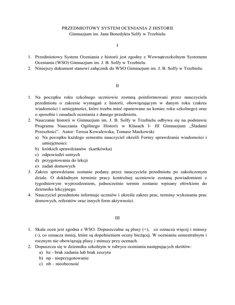 PRZEDMIOTOWY SYSTEM OCENIANIA Z HISTORII Gimnazjum im. Jana Benedykta Solfy w Trzebielu I 1. Przedmiotowy System Oceniania z historii jest zgodny z Wewnątrzszkolnym Systemem Oceniania (WSO) Gimnazjum im. J. B. Solfy w Trzebielu. 2. Niniejszy dokument stanowi załącznik do WSO Gimnazjum im. J. B. Solfy w Trzebielu. II 1. Na początku roku szkolnego uczniowie zostaną poinformowani przez nauczyciela przedmiotu o zakresie wymagań z historii, obowiązującym w danym roku (zakres wiadomości i umiejętności, które trzeba mieć opanowane na koniec roku szkolnego) oraz o sposobie i zasadach oceniania z danego przedmiotu. 2. Nauczanie historii w Gimnazjum im. J. B. Solfy w Trzebielu odbywa się na podstawie Programu Nauczania Ogólnego Historii w Klasach I- III Gimnazjum „Śladami Przeszłości”. Autor: Teresa Kowalewska, Tomasz Mackowski a) Na początku każdego semestru nauczyciel określi Formy sprawdzania wiadomości i umiejętności: b) krótkich sprawdzianów (kartkówka) c) odpowiedzi ustnych d) przygotowania do lekcji e) zadań domowych 3. Zakres sprawdzianu zostanie podany przez nauczyciela przedmiotu po zakończonym dziale. O dokładnym terminie pracy kontrolnej uczniowie zostaną powiadomieni z tygodniowym wyprzedzeniem, jednocześnie termin zostanie wpisany ołówkiem do dziennika lekcyjnego. 4. Nauczyciel przedmiotu informuje uczniów i określa zakres prac, terminy wykonania prac domowych, referatów oraz innych form aktywności. III 1. Skala ocen jest zgodna z WSO. Dopuszczalne są plusy (+), co oznacza więcej i minusy (-), co oznacza mniej, które są dopełnieniem oceny bieżącej. W ocenianiu semestralnym i rocznym nie obowiązują plusy i minusy przy ocenach. 2. Dopuszcza się w dzienniku szkolnym w rubryce oceniania następujących skrótów: a) bz - brak zadania lub brak zeszytu b) np - nieprzygotowanie c) nb – nieobecność 3. Ustala się następującą ilość ocen dla przedmiotów realizowanych w wymiarze tygodniowym: jedna godzina tygodniowo – minimum trzy oceny w semestrze, dwie godziny tygodniowo – minimum cztery oceny w semestrze (historia), trzy godziny tygodniowo – minimum pięć ocen w semestrze, cztery i więcej godzin tygodniowo – minimum sześć ocen w semestrze 4. Ocenianiu towarzyszą systematycznie dokonywane formy sprawdzania wiedzy i umiejętności takie jak: a) ocenianie bieżące: - odpowiedzi ustne – nauczyciel uzasadnia krótko ocenę wypowiedzi ucznia, podając informacje dotyczące umiejętności poprawnie opanowanych, a także przedstawiając braki w wiadomościach i umiejętnościach oraz sposoby ich uzupełnienia. - testy, - zadania domowe, - kartkówki (nauczyciel ma prawo sprawdzić przygotowanie się ucznia do lekcji, wykorzystując w tym celu materiał z trzech ostatnich tematów), - sprawdzian na zakończenie działu (nauczyciel ustala datę sprawdzianu – wpisując zapowiedź w dzienniku ołówkiem – zachowując wymóg nieprzekraczania trzech sprawdzianów w tygodniu dla ucznia). Pod sprawdzoną pracą znajduje się krótka recenzja pracy, która zawiera istotne informacje dotyczące wiadomości i umiejętności, które uczeń opanował oraz wypisane braki, które należy uzupełnić. b) ocenianie sumujące: - test lub kontrolne prace pisemne, których celem jest sprawdzenie wiedzy z całego semestru lub roku (odbywa się w terminie wyznaczonym przez nauczyciela), - należy przestrzegać następujących ustaleń: jeden test w dniu dla ucznia, test przeprowadza się na tej samej godzinie lekcyjnej, w tym samym dniu, we wszystkich oddziałach danej klasy. 5. W całym cyklu kształcenia może nastąpić sprawdzenie wyników nauczania wyznaczone przez dyrektora gimnazjum. 6. Ustala się następujące kryteria oceny śródrocznej i rocznej: a) stopień celujący (6) otrzymuje uczeń, który : - został laureatem lub finalistą konkursów przedmiotowych o zasięgu wojewódzkim i ponad wojewódzkim - opanował pełny zakres wiadomości i umiejętności przewidzianych programem nauczania oraz: - wiedzę przedmiotową integruje z wiedzą z innych przedmiotów - twórczo i samodzielnie rozwija własne uzdolnienia i zainteresowania - proponuje rozwiązania oryginalne - bierze udział i osiąga sukcesy w konkursach przedmiotowych b) stopień bardzo dobry (5) otrzymuje uczeń, który spełnia wymagania dopełniające: - złożone, trudne, ważne do opanowania, - wymagające korzystania z różnych źródeł, - umożliwiające rozwiązywanie problemów, - pośrednio użyteczne w życiu pozaszkolnym, - oznaczające pełne opanowanie wiadomości i umiejętności podstawowych i ponadpodstawowych, przewidzianych w realizowanym przez nauczyciela programie nauczania. c) stopień dobry (4) otrzymuje uczeń, który spełnia wymagania rozszerzające: - istotne w strukturze przedmiotu, - bardziej złożone, mniej przystępne aniżeli elementy treści zaliczane do wymagań podstawowych, - przydatne, ale nie niezbędne w opanowaniu treści z danego przedmiotu i innych przedmiotów szkolnych, - o zakresie przekraczającym wymagania zawarte w podstawie programowej, - wymagające umiejętności stosowania wiadomości w sytuacjach typowych wg wzorów (przykładów) znanych z lekcji i podręcznika, - użyteczne w szkolnej i pozaszkolnej działalności. d) stopień dostateczny (3) otrzymuje uczeń, który spełnia wymagania podstawowe: - najważniejsze w uczeniu się danego przedmiotu, - łatwe dla ucznia nawet mało zdolnego, - o niewielkim stopniu złożoności, a więc przystępne, - często powtarzające się w programie nauczania, - dające się wykorzystać w sytuacjach szkolnych i pozaszkolnych, - określone programem nauczania na poziomie nieprzekraczającym wymagań zawartych w podstawie programowej, - dotyczące głównie prostych, uniwersalnych umiejętności, w najmniejszym zakresie wiadomości, e) stopień dopuszczający (2) otrzymuje uczeń, który spełnia wymagania konieczne: - niezbędne w uczeniu się danego przedmiotu, - potrzebne