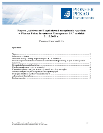 Raport „Adekwatność kapitałowa i zarządzanie ryzykiem w Pioneer Pekao Investment Management SA” na dzień 31.12.2009 r. Warszawa, 30 czerwca 2010 r. Spis treści Wstęp.......................................................................................................................................... 2 Informacje o Spółce ................................................................................................................... 2 Struktura Nowej Umowy Kapitałowej (NUK) w PPIM SA ...................................................... 3 Podział odpowiedzialności w zakresie adekwatności kapitałowej, w tym za zarządzanie ryzykiem..................................................................................................................................... 4 Strategia i planowanie kapitałowe.............................................................................................. 5 Katalog ryzyka oraz kryteria istotności...................................................................................... 6 Kapitałowe plany awaryjne, w tym płynnościowe plany awaryjne ........................................... 8 Metody zarządzania poszczególnymi rodzajami ryzyka............................................................ 8 Pozycje i składniki kapitałów nadzorowanych ........................................................................ 13 Adekwatność kapitałowa.......................................................................................................... 14 Podsumowanie ......................................................................................................................... 15 Raport „Adekwatność kapitałowa i zarządzanie ryzykiem w Pioneer Pekao Investment Management SA” na 31.12.2009 r. 1/15 Wstęp Celem raportu „Adekwatność kapitałowa i zarządzanie ryzykiem w Pioneer Pekao Investment Management SA” (dalej: PPIM SA) jest spełnienie wymogów wynikających z Rozporządzenia Ministra Finansów z dnia 26 listopada 2009 r. w sprawie upowszechniania informacji związanych z adekwatnością kapitałową (Dz. U. nr 210 poz. 1615 z dnia 11 grudnia 2009 r.) (dalej: Rozporządzenie w sprawie upowszechniania informacji). Zasady upowszechniania informacji w zakresie adekwatności kapitałowej zostały opisane w „Polityce informacyjnej PPIM SA w zakresie adekwatności kapitałowej”, która podobnie jak niniejszy raport jest opublikowana na stronie internetowej www.pioneer.com.pl. Informacje w zakresie adekwatności kapitałowej upowszechniane co najmniej raz w roku na podstawie danych wg stanu na dzień 31.12.2009 r., nie później niż w terminie 30 dni od daty zatwierdzenia rocznego sprawozdania finansowego przez Walne Zgromadzenie Akcjonariuszy Spółki (dalej: WZA). W br. WZA zatwierdzające sprawozdanie finansowe za rok 2009 odbyło się 31.05.2010 r. Podmiotem zależnym wobec PPIM SA jest Pioneer Pekao Towarzystwo Funduszy Inwestycyjnych SA (dalej: PPTFI SA). Proces wyliczania wymogów kapitałowych w PPIM SA został zaprojektowany i wdrożony zgodnie z wymogami wynikającymi z Rozporządzenia Ministra Finansów z dnia 18 listopada 2009 r. w sprawie zakresu i szczegółowych zasad wyznaczania całkowitego wymogu kapitałowego, w tym wymogów kapitałowych, dla domów maklerskich oraz określenia maksymalnej wysokości kredytów, pożyczek i wyemitowanych dłużnych papierów wartościowych w stosunku do kapitałów (Dz. U. nr 204 poz. 1571 z dnia 2 grudnia 2009 r.) (dalej: Rozporządzenie w sprawie wymogów kapitałowych) oraz Rozporządzenia Ministra Finansów z dnia 23 listopada 2009 r. w sprawie określenia szczegółowych warunków technicznych i organizacyjnych dla firm inwestycyjnych, banków, o których mowa w art. 70 ust. 2 ustawy o obrocie instrumentami finansowymi, i banków powierniczych oraz warunków szacowania przez dom maklerski kapitału wewnętrznego (Dz. U. nr 183, poz. 1538 z dnia 2 grudnia 2009 r.; dalej: Rozporządzenie w sprawie warunków technicznych i organizacyjnych). Informacje w zakresie adekwatności kapitałowej prezentowane są wg stanu prawnego obowiązującego w dniu 31.12.2009 r. Wymogi w zakresie szacowania kapitału wewnętrznego (II Filar) weszły w życie w dniu 17.06.2010 r., a więc niniejszy raport nie obejmuje informacji odnośnie procesu ICAAP (ang. Internal Capital Adequacy Assesment Process) oraz danych odnośnie wysokości kapitału wewnętrznego. Informacje o Spółce Pioneer Asset Management SA powstała dnia 22.12.1999 r. w Warszawie. PPIM SA, powstała w wyniku zmiany nazwy firmy „Pioneer Asset Management” SA w dniu 4.12.2000 r. na mocy Uchwały nr 2/8/2000 Nadzwyczajnego WZA. Zmiana nazwy została połączona z podwyższeniem kapitału w drodze emisji akcji. Akcje nowej emisji zostały objęte przez dotychczasowego akcjonariusza Pioneer International Corporation z siedzibą: 100 West Tenth Street, Wilmington, 19801 Delaware, USA oraz Bank Pekao Spółka Akcyjna z siedzibą w Warszawie przy ulicy Grzybowskiej 53/57. Dnia 1.11.2001 r., za zgodą Komisji Papierów Wartościowych i Giełd (obecnie Komisja Nadzoru Finansowego; dalej: KNF), Pioneer Global Asset Management SpA (dalej: PGAM) z siedzibą w Mediolanie (Włochy), Raport „Adekwatność kapitałowa i zarządzanie ryzykiem w Pioneer Pekao Investment Management SA” na 31.12.2009 r. 2/15 Galleria San Carlo 6, 20122 Mediolan nabył akcje Spółki należące przedtem do Pioneer International Corporation. Siedziba PPIM SA mieści się w Warszawie przy ulicy Wołoskiej 5. Na dzień 31.12.2009 r. jednostką dominującą dla PPIM SA była spółka Pioneer Global Asset Management SpA, natomiast jednostką dominującą najwyższego szczebla była spółka UniCredit SpA. PPIM SA wpisany jest do Rejestru Przedsiębiorców pod numerem KRS 0000019966. Wpisu dokonał Sąd Rejonowy w Warszawie, XX Wydział Gospodarczy Krajowego Rejestru Sądowego w dniu 19.06.2001 r. (obecnie XIII Wydział Gospodarczy Kraj