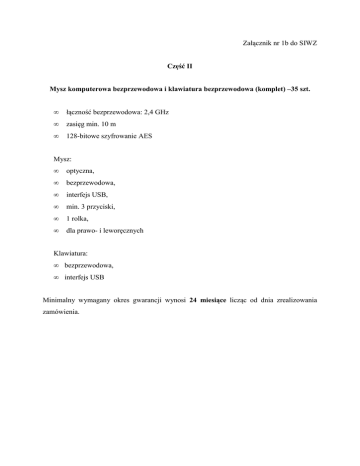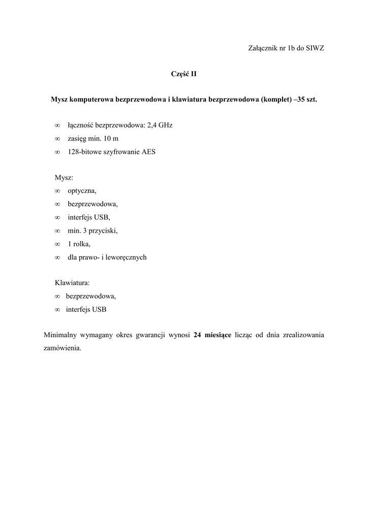 Załącznik nr 1b do SIWZ Część II Mysz komputerowa bezprzewodowa i klawiatura bezprzewodowa (komplet) –35 szt. • łączność bezprzewodowa: 2,4 GHz • zasięg min. 10 m • 128-bitowe szyfrowanie AES Mysz: • optyczna, • bezprzewodowa, • interfejs USB, • min. 3 przyciski, • 1 rolka, • dla prawo- i leworęcznych Klawiatura: • bezprzewodowa, • interfejs USB Minimalny wymagany okres gwarancji wynosi 24 miesiące licząc od dnia zrealizowania zamówienia.