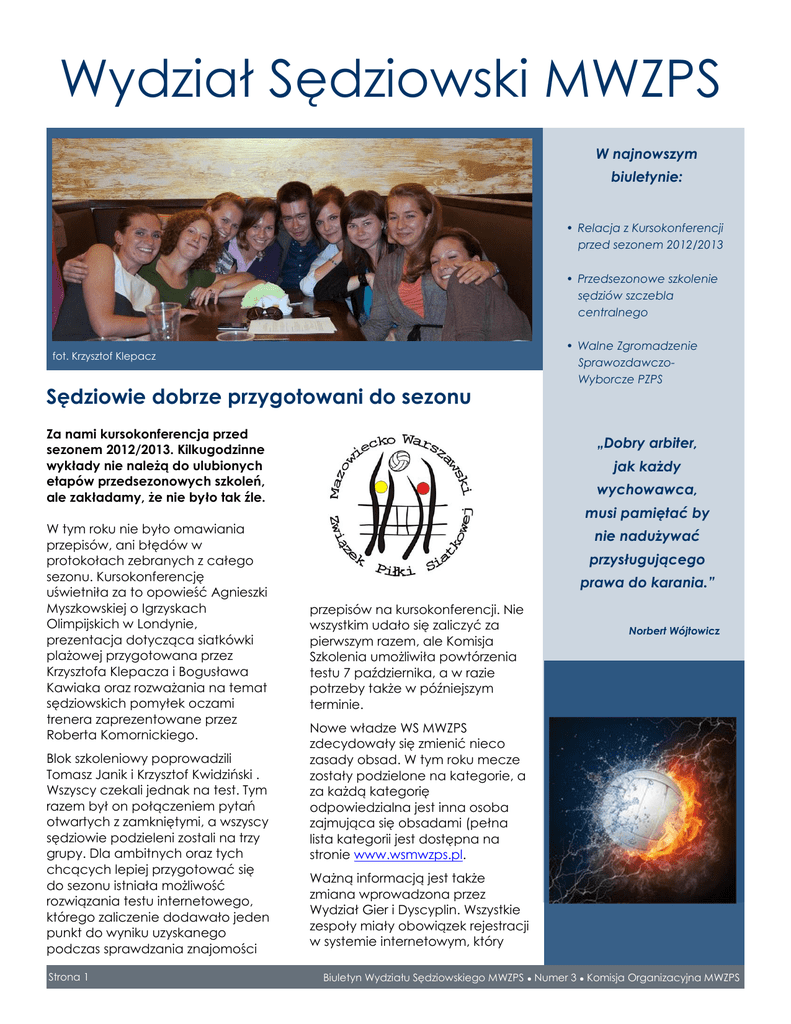 Wydział Sędziowski MWZPS W najnowszym biuletynie: • Relacja z Kursokonferencji przed sezonem 2012/2013 • Przedsezonowe szkolenie sędziów szczebla centralnego fot. Krzysztof Klepacz Sędziowie dobrze przygotowani do sezonu Za nami kursokonferencja przed sezonem 2012/2013. Kilkugodzinne wykłady nie należą do ulubionych etapów przedsezonowych szkoleń, ale zakładamy, że nie było tak źle. W tym roku nie było omawiania przepisów, ani błędów w protokołach zebranych z całego sezonu. Kursokonferencję uświetniła za to opowieść Agnieszki Myszkowskiej o Igrzyskach Olimpijskich w Londynie, prezentacja dotycząca siatkówki plażowej przygotowana przez Krzysztofa Klepacza i Bogusława Kawiaka oraz rozważania na temat sędziowskich pomyłek oczami trenera zaprezentowane przez Roberta Komornickiego. Blok szkoleniowy poprowadzili Tomasz Janik i Krzysztof Kwidziński . Wszyscy czekali jednak na test. Tym razem był on połączeniem pytań otwartych z zamkniętymi, a wszyscy sędziowie podzieleni zostali na trzy grupy. Dla ambitnych oraz tych chcących lepiej przygotować się do sezonu istniała możliwość rozwiązania testu internetowego, którego zaliczenie dodawało jeden punkt do wyniku uzyskanego podczas sprawdzania znajomości Strona 1 • Walne Zgromadzenie SprawozdawczoWyborcze PZPS „Dobry arbiter, jak każdy wychowawca, musi pamiętać by nie nadużywać przysługującego prawa do karania.” przepisów na kursokonferencji. Nie wszystkim udało się zaliczyć za pierwszym razem, ale Komisja Szkolenia umożliwiła powtórzenia testu 7 października, a w razie potrzeby także w późniejszym terminie. Norbert Wójtowicz Nowe władze WS MWZPS zdecydowały się zmienić nieco zasady obsad. W tym roku mecze zostały podzielone na kategorie, a za każdą kategorię odpowiedzialna jest inna osoba zajmująca się obsadami (pełna lista kategorii jest dostępna na stronie www.wsmwzps.pl. Ważną informacją jest także zmiana wprowadzona przez Wydział Gier i Dyscyplin. Wszystkie zespoły miały obowiązek rejestracji w systemie internetowym, który Biuletyn Wydziału Sędziowskiego MWZPS ● Numer 3 ● Komisja Organizacyjna MWZPS umożliwia generowanie listy zawodników na druku MWZPS. Taka lista oznacza, że osoby na niej umieszone zostały dopuszczone do gry na podstawie ważnych licencji. Tym samym trenerzy zamiast dotychczasowych certyfikatów mogą przedstawić sędziemu przed spotkaniem wydrukowaną listę z systemu rejestracji zawodników. Warto także zwrócić uwagę na zmieniony system kwalifikacji kandydatów na szczebel centralny. Co dwa lata odbywa się szkolenie, na które każdy z wydziałów sędziowskich wysyła swoich kandydatów. Ich wybór zależy od wewnętrznych ustaleń każdego ze związków. Wydział Sędziowski MWZPS zdecydował, że wybór kandydatów na szkolenie odbędzie się kilkuetapowo. W pierwszym etapie liczą się punkty zdobyte podczas testu z przepisów i protokołowania oraz ankieta aktywności sędziowskiej. Na tej podstawie ze zgłoszonej grupy wybierane są osoby do kolejnych dwóch etapów, podczas których kandydaci podlegają ocenie sędziów kwalifikatorów, a ich pozycja ustalana jest na podstawie rankingu. Punkty do rankingu wyliczane są na podstawie wytycznych określonych w osobnym komunikacie. Po szkoleniu zawsze należy się odpoczynek. Tym razem nie było niestety spotkania integracyjnego, które z roku na rok cieszyło się coraz mniejszym zainteresowaniem (mamy nadzieję, że w przyszłym sezonie tradycja powróci). Nie oznacza to jednak, że sędziowie zrezygnowali ze spotkań towarzyskich. Niektórzy patrząc na zdjęcie na pierwszej stronie mają nawet wyjątkowe szczęście Pomoc „dla Jarka” Nasz Kolega, Jarek Janiak cierpi na ciężką chorobę. Za pieniądze, które dotąd przekazaliście zakupiono specjalistyczny sprzęt (tzw. pionizator i wózek). Na tym potrzeby jednak się nie kończą, ponieważ Jarek potrzebuje stałej, całodobowej opieki. Dziękując za dotychczasowe wpłaty, zwracamy się z apelem o przekazywanie kolejnych środków lub namiarów do firm/instytucji, które mogłyby udzielić finansowego wsparcia. Wpłat można dokonywać na konto: 67 1140 2004 0000 3802 2340 4218 z dopiskiem "dla Jarka". Równie istotne jest w tej sytuacji także utrzymywanie kontaktu z naszym Kolegą. Prosimy, byście pisali do Niego na adres: [email protected]. fot. Krzysztof Klepacz Strona 2 Biuletyn Wydziału Sędziowskiego MWZPS ● Numer 3 ● Komisja Organizacyjna MWZPS Przedpełski pokieruje Związkiem przez kolejne cztery lata Zarząd PZPS na lata 2012-2016: Fot. PZPS.pl/Wiesław Kozieł Dotychczasowy prezes Polskiego Związku Piłki Siatkowej Mirosław Przedpełski dalej będzie kierował związkiem. Będzie to jego trzecia kadencja. Wyboru dokonali delegaci 8 października 2012 r. podczas Walnego Zgromadzenia Sprawozdawczo-Wyborczego Delegatów PZPS. O stanowisko ubiegało się trzech kandydatów: Artur Popko, Waldemar Bartelik oraz Mirosław Przedpełski. Popko podczas obrad złożył rezygnację z kandydowania. W głosowaniu Mirosław Przedpełski uzyskał 48 głosów, a Waldemar Bartelik – 39. Józef Bartkowiak, Albert Błażewicz, Radosław Ciemięga, Robert Dworak, Krzysztof Szmydyński, Grzegorz Jeżowski, Jacek Kasprzyk, Waldemar Kobienia, Jerzy Mróz, Paweł Papke, Konrad Piechocki, Artur Popko, Witold Roman, Waldemar Sagan, Jacek Sęk, Paweł Wachowiak, Tadeusz Jasiński, Piotr Pykel, Maciej Bogusz, Grzegorz Wagner, Andrzej Lemek. Brazylijczyk nowym prezydentem, Polak we władzach FIVB Ary Graça został nowym prezydentem FIVB. Głosowanie odbyło się podczas 33. Kongresu Międzynarodowej Federacji Piłki Siatkowej w Anaheim w Stanach Zjednoczonych. Brazylijczyk zdobył 103 głosy, pokonując Douga Beala, który uzyskał 86 głosów i Australijczyka Chrisa Schachta, którego poparło 15 delegatów. Prezes PZPS Mirosław Przedpełski znalazł się w Zarządzie Administracyjnym FIVB oraz z ra
