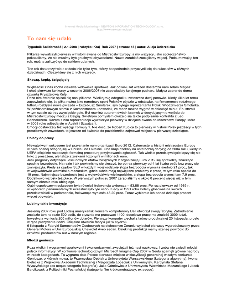 Internet Media Monitoring – NEWTON INFORMATION TECHNOLOGY, s.r.o. http://www.newtonmedia.pl To nam się udało Tygodnik Solidarność | 2.1.2008 | rubryka: Kraj Rok 2007 | strona: 18 | autor: Alicja Dzierzbicka Piłkarze wywalczyli pierwszy w historii awans do Mistrzostw Europy, a my wszyscy, jako społeczeństwo pokazaliśmy, że nie musimy być gnuśnymi obywatelami. Nawet zarabiać zaczęliśmy więcej. Podsumowując ten rok, można zaliczyć go do całkiem udanych. Ten rok dostarczył wiele radości nie tylko tym, którzy bezpośrednio przyczynili się do sukcesów w różnych dziedzinach. Cieszyliśmy się z nich wszyscy. Skaczą, kopią, ścigają się Większość z nas kocha ciekawe widowiska sportowe. Już od kilku lat wrażeń dostarcza nam Adam Małysz. I choć pierwsze konkursy w sezonie 2006/2007 nie zapowiadały kolejnego pucharu, Małysz zabrał do domu czwartą Kryształową Kulę. Poza nim świetnie spisali się nasi piłkarze. Wielką rolę odegrali tu zwłaszcza dwaj panowie. Kiedy kilka lat temu zapowiadało się, że piłka nożna jako narodowy sport Polaków pójdzie w odstawkę, na firmamencie rodzimego futbolu rozbłysła nowa gwiazda – Euzebiusz Smolarek, syn byłego reprezentanta Polski Włodzimierza Smolarka. W październikowym starciu z Kazachstanem udowodnił, że mecz można wygrać w dziewięć minut. Ebi strzelił w tym czasie aż trzy zwycięskie gole. Był również autorem dwóch bramek w decydującym o wejściu do Mistrzostw Europy meczu z Belgią. Świetnym pomysłem okazało się także podpisanie kontraktu z Leo Benhakerem. Razem z nim reprezentacja wywalczyła pierwszy w dziejach awans do Mistrzostw Europy, które w 2008 roku odbędą się w Austrii i Szwajcarii. Emocji dostarczały też wyścigi Formuły 1. Nie dość, że Robert Kubica to pierwszy w historii Polak jeżdżący w tych prestiżowych zawodach, to jeszcze od kwietnia do października zajmował miejsca w pierwszej dziesiątce. Polacy do pracy Niewątpliwym sukcesem jest przyznanie nam organizacji Euro 2012. Czternaste w historii mistrzostwa Europy w piłce nożnej odbędą się w Polsce i na Ukrainie. Oba kraje czekały na ostateczną decyzję od 2004 roku, kiedy to UEFA oficjalnie rozpoczęła formalną procedurę przyjmowania zgłoszeń. Tak wielkie przedsięwzięcie łączy się nie tylko z prestiżem, ale także z zyskami liczonymi w milionach euro. Jeśli prognozy dotyczące ilości nowych etatów związanych z organizacją Euro 2012 się sprawdzą, znacząco spadnie bezrobocie. Na razie i tak powinniśmy się cieszyć, bo po raz pierwszy od 4 lat liczba osób bez pracy się zmniejszyła. Kiedy za rządów SLD w każdym województwie stopa bezrobocia wynosiła średnio 21 proc., tak w województwie warmińsko-mazurskim, gdzie ludzie mają największe problemy z pracą, w tym roku spadła do 19 proc. Najmniejsze bezrobocie jest w województwie wielkopolskim, a stopa bezrobocia wynosi tam 7,9 proc. Dodatkowo wzrosły też płace. W pierwszym półroczu 2007 zarabialiśmy o około 8 procent więcej niż w tym samym okresie roku ubiegłego. Ogólnospołecznym sukcesem była również frekwencja wyborcza – 53,88 proc. Po raz pierwszy od 1989 r. w wyborach parlamentarnych uczestniczyło tyle osób. Kiedy w 1991 roku Polacy głosowali na swoich przedstawicieli w parlamencie, frekwencja wyniosła 43,20 proc. Teraz wybierało ich ponad dziesięć procent więcej obywateli. Lubimy takie inwestycje Jesienią 2007 roku pod Łodzią amerykański koncern komputerowy Dell otworzył swoją fabrykę. Zatrudnienie znalazło tam na razie 500 osób, do stycznia ma pracować 1100, docelowo pracę ma znaleźć 3000 ludzi. Inwestycja wyniosła 200 milionów dolarów. Pierwszy komputer zjechał z taśmy produkcyjnej 20 listopada, prosto w ręce prezydenta Łodzi. Oficjalne otwarcie fabryki już w styczniu. 6 listopada z Fabryki Samochodów Osobowych na stołecznym Żeraniu wyjechał pierwszy wyprodukowany przez General Motors w Unii Europejskiej Chevrolet Aveo sedan. Dzięki tej produkcji mamy szansę powrócić do czołówki producentów aut w naszym regionie. Młodzi geniusze Poza wielkimi wygranymi sportowymi i ekonomicznymi, zwyciężali też nasi naukowcy. I znów nie zwiedli młodzi polscy informatycy. W konkursie technologicznym Microsoft Imagine Cup 2007 w Seulu zgarnęli główne nagrody w trzech kategoriach. Ta wygrana dała Polsce pierwsze miejsce w klasyfikacji generalnej w całym konkursie. Geniusze, o których mowa, to Przemysław Dębiak z Uniwersytetu Warszawskiego (kategoria algorytmy), Iwona Bielecka z Wojskowej Akademii Technicznej i Małgorzata Łopaciuk z Uniwersytetu Kardynała Stefana Wyszyńskiego (ex aequo kategoria fotografia), Julia Górniewicz z Uniwersytetu Warmińsko-Mazurskiego i Jacek Barcikowski z Politechniki Poznańskiej (kategoria film krótkometrażowy, ex aequo). Wygrywali również polscy studenci Akademii Medycznej w Warszawie, Leszek Kraj oraz Radosław Pracoń. Ich prace naukowe zostały uznane za najlepsze w dwóch w sesjach październikowej 18. Międzynarodowej Konferencji Studentów Medycyny w Berlinie: gastroenterologicznej i kardiologicznej. Polscy naukowcy świetnie spisywali się również w zespołach międzynarodowych. Projekt EURITRACK, którego współwykonawcą jest Instytut Problemów Jądrowych w Świerku został nagrodzony francuską nagrodą French Trophy of Civil Defense 2007. Zespół kierowany przez prof. Marka Moszyńskiego opracowywał system detektorów, który za pomocą wiązek neuronów ma wykrywać niebezpieczne materiały. Wygrać to sztuczka Kilkoma sukcesami mogą pochwalić się polscy artyści. Twórcy niepozornych „Sztuczek“ zdobywali nagrody za swój film nie tylko na rodzimym, gdyńskim i łódzkim podwórku. W Wenecji w ręce reżysera Andrzeja Jakimowskiego powędrowała Nagroda Europa Cinema dla Najlepszego Filmu Europejskiego oraz wyróżnienie UNICEF. Jakimowski otrzymał też Nagrodę Specjalną Jury na festiwalu 