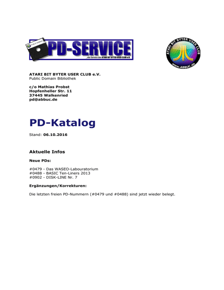 ATARI BIT BYTER USER CLUB e.V. Public Domain Bibliothek c/o Mathias Probst Hopfenheller Str. 11 37445 Walkenried [email protected] PD-Katalog Stand: 06.10.2016 Aktuelle Infos Neue PDs: #0479 - Das WASEO-Labouratorium #0488 - BASIC Ten-Liners 2013 #0902 - DISK-LINE Nr. 7 Ergänzungen/Korrekturen: Die letzten freien PD-Nummern (#0479 und #0488) sind jetzt wieder belegt. 06.10.2016 Seite 2 von 98 Erläuterungen zum PD-Katalog Formatierte Dichten: SD - Single Density 90KB / ED - Enhanced Density 128 KB / DD - Double Density 180 KB Anzahl der bespielten Diskettenseiten: 7S entspricht 7 Seiten = 4 Disks Anforderungen der Programme (in der Titelzeile der PDs): TBS = Turbo BASIC / BAS = BASIC (Cartridge) / PAS = PASCAL / 128K = Speicher RS 232 = Serielle Schnittstelle / Joystick / FX-80 = epsonkompatibler Drucker / Maus XL/XE-OS = originales Betriebssystem Modem / 800-OS = OS vom ATARI 400/800 PAL = nur für PAL ATARIs / DMA = separater ANTIC-Zugriff auf Speichererweiterung etc. Zu betätigende Tasten werden in <spitze Klammern> gesetzt. Z.B. <OPTION>. Preise: jede Diskette -,50 € Porto: Nach den aktuellen Tarifen von DHL (Post) oder Hermes-Versand. 5¼ Zoll Disks sind aufgrund ihrer Größe erst ab Großbrief (500g, 35x25x2cm) bzw. Maxi-brief (1000g, dicker als 2cm) versendbar. Bei größeren Bestellungen (Päckchen/Paket) kann alternativ auch Hermes-Versand als kostengünstiger Versender gewählt werden. Bei größeren Bestellungen und Bestellungen aus dem Ausland bitte bei vorher bei "[email protected]" anfragen nach den Portokosten. Bezahlung ausschließlich per Vorkasse (Überweisung) an die Clubzentrale! Das Geld bitte auf das bekannte ABBUC-Konto überweisen (www.abbuc.de). Hinweis: In pekuniären Angelegenheiten Fragen bitte an Wolfgang (@abbuc.de) schicken. ABBUC e.V. KSK Recklinghausen BLZ:426 501 50 Konto Nr.: 54 000 468 Versandablauf: Bei E-Mail-Bestellung bekommt ihr von uns eine E-Mail mit den tatsächlichen Daten zurück. Den in der E-Mail genannten Geldbetrag (Disks plus Porto) bitte auf das Clubkonto überweisen. Sobald wir von der Clubzentrale eine E-Mail über den Geldeingang bekommen haben, versenden wir die PDDisks. Bei Post-Bestellung bitte das Bestell-Formular (letzte Seite) aus diesem Katalog verwenden. Den entsprechend ermittelten Geldbetrag bitte auf das Clubkonto überweisen. Sobald wir von der Clubzentrale eine E-Mail über den Geldeingang bekommen haben, versenden wir die PD-Disks. Kosten für Verpackungen fallen derzeit beim PD-Versand nicht an. 06.10.2016 Seite 3 von 98 Speicher- und Grafikformate der Bilderdisketten Design Master: PIC 2 Farben; 62 Sektoren; GRAPHICS 8 MicroPainter: MIC 4 Farben; 62 Sektoren; GRAPHICS 15. Maltafel (Koala): PIC 4 Farben; komprimiert; unter 62 Sektoren; GRAPHICS 15. MultiColorScreen: MCS 9 Farben; 82 Sektoren; GRAPHICS 15. Color Enhancer: 128 Farben; mindestens 62 Sektoren; GRAPHICS 15; Farbenanzahl durch DLI in jeder Bildschirmzeile; 'MicroPainter'-FORMAT mit angehängten DLI-Infos. Digipaint: 256 Farben; 123 Sektoren; GRAPHICS 9; Bildfrequenz 25 Hz; die Farbenanzahl wird durch Page Flipping von Farben- und Helligkeitsinformation erreicht. TechniColor: LUM, COL 256 Farben; Farben- und Helligkeitsdatei von je 39 Sektoren; GRAPHICS 9; Farbenanzahl durch Untereinanderschalten je einer Farben- und einer Helligkeitszeile im DLI. Degas: PI3 2 Farben; 258 Sektoren; Größe ca. 4x GRAPHICS 8; ATARI ST. ART: ART 2 Farben; variable Länge und Größe; PC. GIF: GIF Grafik mit variabler Länge und Farbenanzahl; meist Internet-Grafiken. Print Shop 2 Farben; nur mit 'PRINT SHOP' oder kompatiblen Programmen nutzbar. 06.10.2016 Seite 4 von 98 [ SD/1S ] 0001 Spiele 1 Egon: Streiche ein Haus an und hüte dich vor den Geistern! Crazy Gats: Finde durch die Drehtüren zum Wasserhahn! Blockade: Erreiche den unteren Spielfeldrand! Epsilon: Schlüsselsuche in unterirdischen Gewölben! Goldrush: Sprenge den Weg zu den Goldmünzen frei! Saucer Launch: Verteidige die Erde vom Steuerpult aus! 17 und 4: Das Kartenspiel. [ SD/1S ] 0002 Spiele 2 Knight Battle: Schätze Wind und Ladung ein, um die Burg zu treffen! Sternenfestung: Schütze das Sternensystem vor den Frogs! Taucher: Berge alle Schätze aus dem Unterwasserlabyrinth! Vier gewinnt: Ein Denkspiel. Juwel Eater: Bringe alle Juwelen zum Ausgang! Minigolf: Partie über 14 Löcher. [ SD/1S ] 0003 Spiele 3 Sabotage: Berge 3 Reaktoren im All. Das Duell: Färbe die Fläche des Gegners ein. Die Vier: Ein Denkspiel. Ölsuche: Sammele mit dem Bohrkopf die Punkte ein. Geister wollen dich daran hindern. Gun Kid: Triff 10 Flaschen mit dem Revolver. Memory: Spiele die Vorgaben nach. Motorrad: Interessantes Rennen für Zwei. Panic: Lerne, schnell zu tippen! Tic-Tac: Drei gewinnt für zwei. Eisenbahn: Ein Rechenspaß. [ SD/1S ] 0004 Spiele 4 Wortsuchspiel: Errate das gesuchte Wort und tippe es ein. Ronny, der Taschendieb: Klauen, was das Zeug hält. Mauerfluch: Geldbeutel einsammeln mit Hindernissen. Wurm: Du wirst länger und länger. Segelflug: Versuche dich 20km weit in der Luft zu halten. Alpha-Blast: Buchstaben abschießen. Mathe-Schießen: Zahlen abschießen. Math Fun: Schnelles Zahlen addieren. 0005 Spiele 5 Olympia: Teste deine Sportlichkeit in 6 Disziplinen. UFO: Halte als UFO-Kommandant einem Kometensturm stand. [ SD/1S ] [ ED/1S ] 0006 Spiele 6 Jumper 2: Geschicklichkeit und Zeitdruck. Cambodia: Rette per Helikopter 25 Menschen aus dem Dschungel! Banknote: Drucke Banknoten im Wettstreit mit dem Computer! Nicoma: Arbeite mit dem Dreisatz! [ SD/1S ] 0007 Spiele 7 Manager: Manage als Chefredakteur deine Zeitung! Verlies: Sammle Perlen und Schlüssel ein! The Castle: Feinde der Burg abwehren! Schloss: Mit 2 Schlüssel weiterkommen. [ SD/1S ] 0008 Spiele 8 Schatzhöhle: Hüte dich vor den Erdmonstern und berge die Goldschätze! Charly: Ein visuelles Gedächtnis ist gefragt, um den Friedhof sicher verlassen zu können. Bank-Panik: Ziehe schneller als die Cowboys! Wort-Jagd: Ein Ratespaß. Biffdrop: Lass' dich beim
