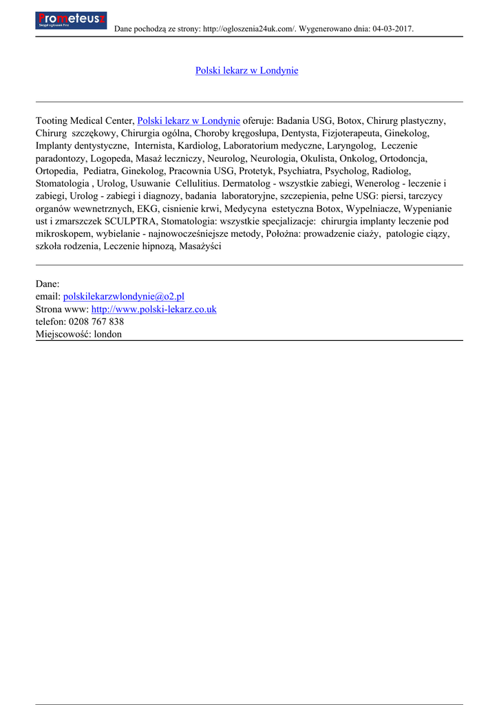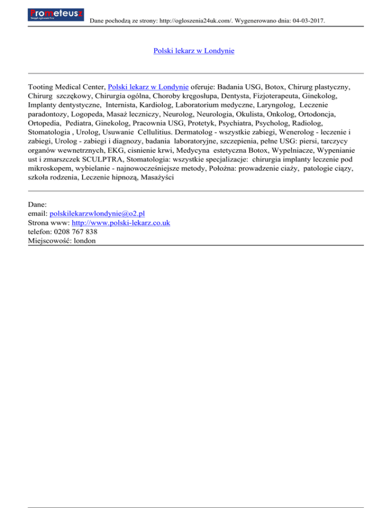 Dane pochodzą ze strony: http://ogloszenia24uk.com/. Wygenerowano dnia: 04-03-2017. Polski lekarz w Londynie Tooting Medical Center, Polski lekarz w Londynie oferuje: Badania USG, Botox, Chirurg plastyczny, Chirurg szczękowy, Chirurgia ogólna, Choroby kręgosłupa, Dentysta, Fizjoterapeuta, Ginekolog, Implanty dentystyczne, Internista, Kardiolog, Laboratorium medyczne, Laryngolog, Leczenie paradontozy, Logopeda, Masaż leczniczy, Neurolog, Neurologia, Okulista, Onkolog, Ortodoncja, Ortopedia, Pediatra, Ginekolog, Pracownia USG, Protetyk, Psychiatra, Psycholog, Radiolog, Stomatologia , Urolog, Usuwanie Cellulitius. Dermatolog - wszystkie zabiegi, Wenerolog - leczenie i zabiegi, Urolog - zabiegi i diagnozy, badania laboratoryjne, szczepienia, pełne USG: piersi, tarczycy organów wewnetrznych, EKG, cisnienie krwi, Medycyna estetyczna Botox, Wypelniacze, Wypenianie ust i zmarszczek SCULPTRA, Stomatologia: wszystkie specjalizacje: chirurgia implanty leczenie pod mikroskopem, wybielanie - najnowocześniejsze metody, Położna: prowadzenie ciaży, patologie ciązy, szkoła rodzenia, Leczenie hipnozą, Masażyści Dane: email: [email protected] Strona www: http://www.polski-lekarz.co.uk telefon: 0208 767 838 Miejscowość: london