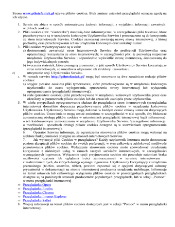 Strona www.pthstefaniuk.pl używa plików cookies. Brak zmiany ustawień przeglądarki oznacza zgodę na ich użycie. 1. Serwis nie zbiera w sposób automatyczny żadnych informacji, z wyjątkiem informacji zawartych w plikach cookies. 2. Pliki cookies (tzw. "ciasteczka") stanowią dane informatyczne, w szczególności pliki tekstowe, które przechowywane są w urządzeniu końcowym Użytkownika Serwisu i przeznaczone są do korzystania ze stron internetowych Serwisu. Cookies zazwyczaj zawierają nazwę strony internetowej, z której pochodzą, czas przechowywania ich na urządzeniu końcowym oraz unikalny numer. 3. Pliki cookies wykorzystywane są w celu: a) dostosowania zawartości stron internetowych Serwisu do preferencji Użytkownika oraz optymalizacji korzystania ze stron internetowych; w szczególności pliki te pozwalają rozpoznać urządzenie Użytkownika Serwisu i odpowiednio wyświetlić stronę internetową, dostosowaną do jego indywidualnych potrzeb; b) tworzenia statystyk, które pomagają zrozumieć, w jaki sposób Użytkownicy Serwisu korzystają ze stron internetowych, co umożliwia ulepszanie ich struktury i zawartości; c) utrzymanie sesji Użytkownika Serwisu. 4. W ramach serwisu http://pthstefaniuk.pl/ mogą być stosowane są dwa zasadnicze rodzaje plików cookies: a) sesyjne (session cookies) pliki tymczasowe, które przechowywane są w urządzeniu końcowym użytkownika do czasu wylogowania, opuszczenia strony internetowej lub wyłączenia oprogramowania (przeglądarki internetowej); b) stałe (persistent cookies) pliki przechowywane w urządzeniu końcowym użytkownika przez czas określony w parametrach plików cookies lub do czasu ich usunięcia przez użytkownika. 5. W wielu przypadkach oprogramowanie służące do przeglądania stron internetowych (przeglądarka internetowa) domyślnie dopuszcza przechowywanie plików cookies w urządzeniu końcowym Użytkownika. Użytkownicy Serwisu mogą dokonać w każdym czasie zmiany ustawień dotyczących plików cookies. Ustawienia te mogą zostać zmienione w szczególności w taki sposób, aby blokować automatyczną obsługę plików cookies w ustawieniach przeglądarki internetowej bądź informować o ich każdorazowym zamieszczeniu w urządzeniu Użytkownika Serwisu. Szczegółowe informacje o możliwości i sposobach obsługi plików cookies dostępne są w ustawieniach oprogramowania (przeglądarki internetowej). 6. Operator Serwisu informuje, że ograniczenia stosowania plików cookies mogą wpłynąć na niektóre funkcjonalności dostępne na stronach internetowych Serwisu. 7. Jak wyłączyć pliki Cookies w przeglądarce? Każdy użytkownik Internetu może dostosować poziom akceptacji plików cookies do swoich preferencji, w tym całkowicie zablokować możliwość pozostawiania plików cookies. Wyłączenie stosowania cookies może spowodować utrudnienia korzystanie z niektórych usług w ramach naszych serwisów internetowych, w szczególności wymagających logowania. Wyłączenie opcji przyjmowania cookies nie powoduje natomiast braku możliwości czytania lub oglądania treści zamieszczanych w serwisie internetowym z zastrzeżeniem tych, do których dostęp wymaga logowania. Użytkownicy korzystający z urządzenia przenośnego (telefon, smartfon, tablet), powinni zapoznać się z opcjami dotyczącymi ochrony prywatności w dokumentacji na stronie internetowej producenta urządzenia mobilnego. Informacje na temat ustawień lub całkowitego wyłączenia plików cookies w poszczególnych przeglądarkach dostępne są na poniższych stronach producentów popularnych przeglądarek, lub w sekcji „Pomoc” w menu przeglądarki internetowej • Przeglądarka Opera • Przeglądarka Firefox • Przeglądarka Chrome • Przeglądarka Internet Explorer • Przeglądarka Safari 8. Więcej informacji na temat plików cookies dostępnych jest w sekcji "Pomoc" w menu przeglądarki internetowej.