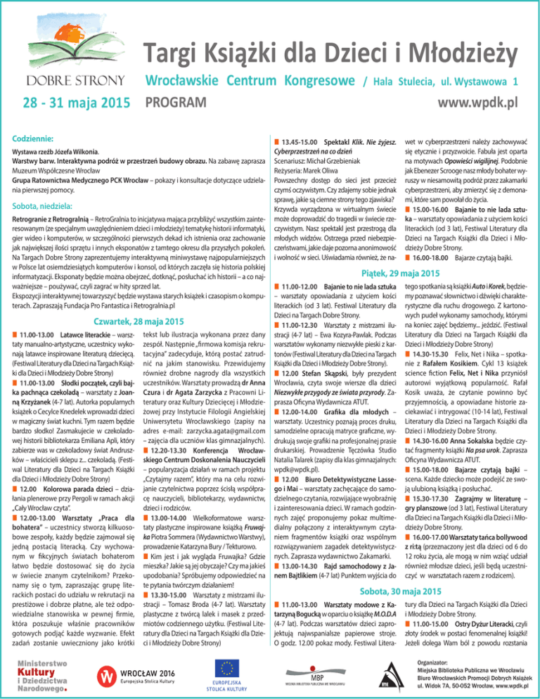 Targi Książki dla Dzieci i Młodzieży 28 - 31 maja 2015 Wrocławskie Centrum Kongresowe PROGRAM Codziennie: Wystawa rzeźb Józefa Wilkonia. Warstwy barw. Interaktywna podróż w przestrzeń budowy obrazu. Na zabawę zaprasza Muzeum Współczesne Wrocław Grupa Ratownictwa Medycznego PCK Wrocław – pokazy i konsultacje dotyczące udzielania pierwszej pomocy. Sobota, niedziela: Retrogranie z Retrogralnią – RetroGralnia to inicjatywa mająca przybliżyć wszystkim zainteresowanym (ze specjalnym uwzględnieniem dzieci i młodzieży) tematykę historii informatyki, gier wideo i komputerów, w szczególności pierwszych dekad ich istnienia oraz zachowanie jak największej ilości sprzętu i innych eksponatów z tamtego okresu dla przyszłych pokoleń. Na Targach Dobre Strony zaprezentujemy interaktywną miniwystawę najpopularniejszych w Polsce lat osiemdziesiątych komputerów i konsol, od których zaczęła się historia polskiej informatyzacji. Eksponaty będzie można obejrzeć, dotknąć, posłuchać ich historii – a co najważniejsze – poużywać, czyli zagrać w hity sprzed lat. Ekspozycji interaktywnej towarzyszyć będzie wystawa starych książek i czasopism o komputerach. Zapraszają Fundacja Pro Fantastica i Retrogralnia.pl Czwartek, 28 maja 2015 11.00-13.00 Latawce literackie – warsztaty manualno-artystyczne, uczestnicy wykonają latawce inspirowane literaturą dziecięcą. (Festiwal Literatury dla Dzieci na Targach Książki dla Dzieci i Młodzieży Dobre Strony) 11.00-13.00 Słodki początek, czyli bajka pachnąca czekoladą – warsztaty z Joanną Krzyżanek (4-7 lat). Autorka popularnych książek o Cecylce Knedelek wprowadzi dzieci w magiczny świat kuchni. Tym razem będzie bardzo słodko! Zasmakujecie w czekoladowej historii bibliotekarza Emiliana Apli, który zabierze was w czekoladowy świat Andruszków – właścicieli sklepu z... czekoladą. (Festiwal Literatury dla Dzieci na Targach Książki dla Dzieci i Młodzieży Dobre Strony) 12.00 Kolorowa parada dzieci – działania plenerowe przy Pergoli w ramach akcji „Cały Wrocław czyta”. 12.00-13.00 Warsztaty „Praca dla bohatera” – uczestnicy stworzą kilkuosobowe zespoły, każdy będzie zajmował się jedną postacią literacką. Czy wychowanym w fikcyjnych światach bohaterom łatwo będzie dostosować się do życia w świecie znanym czytelnikom? Przekonamy się o tym, zapraszając grupę literackich postaci do udziału w rekrutacji na prestiżowe i dobrze płatne, ale też odpowiedzialne stanowiska w pewnej firmie, która poszukuje właśnie pracowników gotowych podjąć każde wyzwanie. Efekt zadań zostanie uwieczniony jako krótki tekst lub ilustracja wykonana przez dany zespół. Następnie „firmowa komisja rekrutacyjna” zadecyduje, którą postać zatrudnić na jakim stanowisku. Przewidujemy również drobne nagrody dla wszystkich uczestników. Warsztaty prowadzą dr Anna Czura i dr Agata Zarzycka z Pracowni Literatury oraz Kultury Dziecięcej i Młodzieżowej przy Instytucie Filologii Angielskiej Uniwersytetu Wrocławskiego (zapisy na adres e-mail: [email protected] – zajęcia dla uczniów klas gimnazjalnych). 12.20-13.30 Konferencja Wrocławskiego Centrum Doskonalenia Nauczycieli – popularyzacja działań w ramach projektu „Czytajmy razem”, który ma na celu rozwijanie czytelnictwa poprzez ścisłą współpracę nauczycieli, bibliotekarzy, wydawnictw, dzieci i rodziców. 13.00-14.00 Wielkoformatowe warsztaty plastyczne inspirowane książką Fruwajka Piotra Sommera (Wydawnictwo Warstwy), prowadzenie Katarzyna Bury / Tekturowo. Kim jest i jak wygląda Fruwajka? Gdzie mieszka? Jakie są jej obyczaje? Czy ma jakieś upodobania? Spróbujemy odpowiedzieć na te pytania twórczym działaniem! 13.30-15.00 Warsztaty z mistrzami ilustracji – Tomasz Broda (4-7 lat). Warsztaty plastyczne z twórcą lalek i masek z przedmiotów codziennego użytku. (Festiwal Literatury dla Dzieci na Targach Książki dla Dzieci i Młodzieży Dobre Strony) / Hala Stulecia, ul. Wystawowa 1 www.wpdk.pl 13.45-15.00 Spektakl Klik. Nie żyjesz. Cyberprzestrzeń na co dzień Scenariusz: Michał Grzebieniak Reżyseria: Marek Oliwa Powszechny dostęp do sieci jest przecież czymś oczywistym. Czy zdajemy sobie jednak sprawę, jakie są ciemne strony tego zjawiska? Krzywda wyrządzona w wirtualnym świecie może doprowadzić do tragedii w świecie rzeczywistym. Nasz spektakl jest przestrogą dla młodych widzów. Ostrzega przed niebezpieczeństwami, jakie daje pozorna anonimowość i wolność w sieci. Uświadamia również, że na- wet w cyberprzestrzeni należy zachowywać się etycznie i przyzwoicie. Fabuła jest oparta na motywach Opowieści wigilijnej. Podobnie jak Ebenezer Scrooge nasz młody bohater wyruszy w niesamowitą podróż przez zakamarki cyberprzestrzeni, aby zmierzyć się z demonami, które sam powołał do życia. 15.00-16.00 Bajanie to nie lada sztuka – warsztaty opowiadania z użyciem kości literackich (od 3 lat), Festiwal Literatury dla Dzieci na Targach Książki dla Dzieci i Młodzieży Dobre Strony. 16.00-18.00 Bajarze czytają bajki. Piątek, 29 maja 2015 11.00-12.00 Bajanie to nie lada sztuka – warsztaty opowiadania z użyciem kości literackich (od 3 lat). Festiwal Literatury dla Dzieci na Targach Dobre Strony. 11.00-12.30 Warsztaty z mistrzami ilustracji (4-7 lat) – Ewa Kozyra-Pawlak. Podczas warsztatów wykonamy niezwykłe pieski z kartonów (Festiwal Literatury dla Dzieci na Targach Książki dla Dzieci i Młodzieży Dobre Strony). 12.00 Stefan Skąpski, były prezydent Wrocławia, czyta swoje wiersze dla dzieci Niezwykłe przygody ze świata przyrody. Zaprasza Oficyna Wydawnicza ATUT. 12.00-14.00 Grafika dla młodych – warsztaty. Uczestnicy poznają proces druku, samodzielne opracują matryce graficzne, wydrukują swoje grafiki na profesjonalnej prasie drukarskiej. Prowadzenie Tęczówka Studio Natalia Talarek (zapisy dla klas gimnazjalnych: [email protected]). 12.00