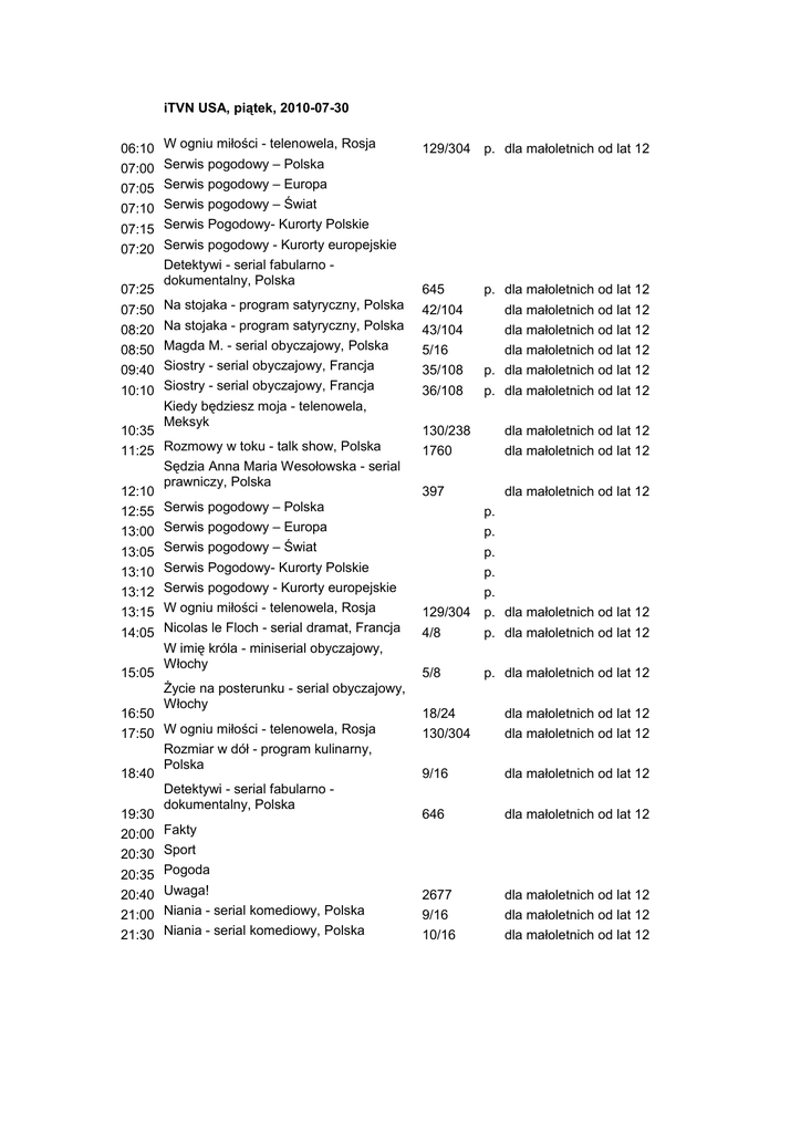 iTVN USA, piątek, 2010-07-30 06:10 07:00 07:05 07:10 07:15 07:20 07:25 07:50 08:20 08:50 09:40 10:10 10:35 W ogniu miłości - telenowela, Rosja Serwis pogodowy – Polska Serwis pogodowy – Europa Serwis pogodowy – Świat Serwis Pogodowy- Kurorty Polskie Serwis pogodowy - Kurorty europejskie Detektywi - serial fabularno dokumentalny, Polska Na stojaka - program satyryczny, Polska Na stojaka - program satyryczny, Polska Magda M. - serial obyczajowy, Polska Siostry - serial obyczajowy, Francja Siostry - serial obyczajowy, Francja Kiedy będziesz moja - telenowela, Meksyk 11:25 Rozmowy w toku - talk show, Polska Sędzia Anna Maria Wesołowska - serial prawniczy, Polska 12:10 12:55 Serwis pogodowy – Polska 13:00 Serwis pogodowy – Europa 13:05 Serwis pogodowy – Świat 13:10 Serwis Pogodowy- Kurorty Polskie 13:12 Serwis pogodowy - Kurorty europejskie 13:15 W ogniu miłości - telenowela, Rosja 14:05 Nicolas le Floch - serial dramat, Francja W imię króla - miniserial obyczajowy, Włochy 15:05 Życie na posterunku - serial obyczajowy, Włochy 16:50 17:50 W ogniu miłości - telenowela, Rosja Rozmiar w dół - program kulinarny, Polska 18:40 Detektywi - serial fabularno dokumentalny, Polska 19:30 20:00 Fakty 20:30 Sport 20:35 Pogoda 20:40 Uwaga! 21:00 Niania - serial komediowy, Polska 21:30 Niania - serial komediowy, Polska 129/304 p. dla małoletnich od lat 12 645 42/104 43/104 5/16 35/108 36/108 p. dla małoletnich od lat 12 dla małoletnich od lat 12 dla małoletnich od lat 12 dla małoletnich od lat 12 p. dla małoletnich od lat 12 p. dla małoletnich od lat 12 130/238 dla małoletnich od lat 12 1760 dla małoletnich od lat 12 397 dla małoletnich od lat 12 p. p. p. p. p. 129/304 p. dla małoletnich od lat 12 4/8 p. dla małoletnich od lat 12 5/8 p. dla małoletnich od lat 12 18/24 130/304 dla małoletnich od lat 12 dla małoletnich od lat 12 9/16 dla małoletnich od lat 12 646 dla małoletnich od lat 12 2677 9/16 10/16 dla małoletnich od lat 12 dla małoletnich od lat 12 dla małoletnich od lat 12 Mężczyzna idealny - film komedia romantyczna, Włochy 2006, reżyseria: Luca Lucini, scenariusz: Marco PontiLucia Moisio, muzyka: David Rhodes, obsada: Francesca Inaudi, Riccardo Scamarcio, Gabriella Pession, Giampaolo Morelli, Giuseppe Battiston 22:00 dla małoletnich od lat 12 Powrót do raju - serial obyczajowy, Australia 23:35 00:30 Co za tydzień - magazyn, Polska 00:50 Magda M. - serial obyczajowy, Polska Detektywi - serial fabularno dokumentalny, Polska 01:40 W białych rękawiczkach - serial dramat, Włochy 02:05 Kiedy będziesz moja - telenowela, Meksyk 02:55 Sędzia Anna Maria Wesołowska - serial prawniczy, Polska 03:40 04:25 Rozmowy w toku - talk show, Polska 05:15 Fakty 05:45 Sport 05:50 Pogoda 05:55 Uwaga! 4/6 455 5/16 dla małoletnich od lat 12 p. dla małoletnich od lat 12 p. dla małoletnich od lat 12 646 p. dla małoletnich od lat 12 5/12 p. dla małoletnich od lat 12 130/238 p. dla małoletnich od lat 12 397 1632 2677 p. dla małoletnich od lat 12 dla małoletnich od lat 12 p. p. p. p. dla małoletnich od lat 12 508 1759 p. dla małoletnich od lat 12 p. dla małoletnich od lat 12 15/16 9/16 10/16 5/10 456 p. dla małoletnich od lat 12 p. dla małoletnich od lat 12 p. dla małoletnich od lat 12 dla małoletnich od lat 12 dla małoletnich od lat 12 bez ograniczeń wiekowych dla małoletnich od lat 12 iTVN USA, sobota, 2010-07-31 Sędzia Anna Maria Wesołowska - serial prawniczy, Polska 06:15 07:00 Rozmowy w toku - talk show, Polska Automaniak - program motoryzacyjny, Polska 07:45 08:10 Niania - serial komediowy, Polska 08:35 Niania - serial komediowy, Polska 09:00 Dzień dobry wakacje - magazyn, Polska 11:10 Co za tydzień - magazyn, Polska Maja w ogrodzie - magazyn, Polska 11:35 12:00 Pojechany łikend - magazyn, Polska Wojaże szalonego Anglika - dokument, Wielka Brytania 12:25 12:50 Kobieta na zakręcie - magazyn, Polska Rewolucja na talerzu - program kulinarny, Polska 13:15 13:40 Barwy grzechu - telenowela, Brazylia 14:30 Barwy grzechu - telenowela, Brazylia 20/45 10/16 8/13 4/6 dla małoletnich od lat 12 dla małoletnich od lat 12 4/8 86/160 87/160 dla małoletnich od lat 12 dla małoletnich od lat 12 dla małoletnich od lat 12 15:20 16:10 17:05 17:55 19:30 20:00 20:25 20:35 20:40 Żyłem jak chciałem - gen. Stanislaw Skalski Powrót do raju - serial obyczajowy, Australia Było nie było Porwanie Króla Stasia dokument, Polska Czas na Filippo - miniserial obyczajowy, Włochy Hela w opałach - serial komediowy, Polska Fakty Sport Pogoda Uwaga! Operacja "Turkus", Francja 2007, reżyseria: Alain Tasma , scenariusz: Alain Tasma Gilles Taurand, muzyka: Cyril Morin, obsada: Bruno Todeschini, Aurélien Recoing, Frédéric Pierrot 21:00 23:00 Album - serial obyczajowy, Dania 00:00 Barwy grzechu - telenowela, Brazylia 00:50 Barwy grzechu - telenowela, Brazylia Powrót do raju - serial obyczajowy, Australia 01:35 02:30 Album - serial obyczajowy, Dania Operacja "Turkus", Francja 2007, reżyseria: Alain Tasma , scenariusz: Alain Tasma Gilles Taurand, muzyka: Cyril Morin, obsada: Bruno Todeschini, Aurélien Recoing, Frédéric Pierrot 03:30 05:25 05:50 05:55 06:00 Fakty Sport Pogoda Uwaga! dla małoletnich od lat 7 4/6 p. dla małoletnich od lat 12 3/10 p. dla małoletnich od lat 7 3/6 p. dla małoletnich od lat 12 4/15 dla małoletnich od lat 12 2692 dla małoletnich od lat 12 3/5 86/160 87/160 dla małoletnich od lat 16 dla małoletnich od lat 16 p. dla małoletnich od lat 12 p. dla małoletnich od lat 12 4/6 3/5 p. dla małoletnich od lat 12 p. dla małoletnich od lat 16 2692 p. dla małoletnich od lat 16 p. p. p. p. dla małoletnich od lat 12 509 1760 p. dla małoletnich od lat 12 p. dla małoletnich od lat 12 iTVN USA, niedziela, 2010-08-01 Sędzia Anna Maria Wesołowska - serial prawniczy, Polska 06:05 06:50 Rozmowy w toku - talk show, Polska Indeks - film dramat, Polska 1977, reżyseria: Janusz Kijowski , scenariusz: Janusz Kijowski , muzyka: Jacek Bednarek , obsada