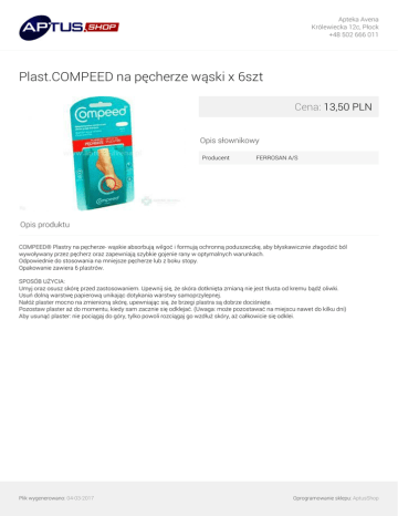 Apteka Avena Królewiecka 12c, Płock +48 502 666 011 Plast.COMPEED na pęcherze wąski x 6szt Cena: 13,50 PLN Opis słownikowy Producent FERROSAN A/S Opis produktu COMPEED® Plastry na pęcherze- wąskie absorbują wilgoć i formują ochronną poduszeczkę, aby błyskawicznie złagodzić ból wywoływany przez pęcherz oraz zapewniają szybkie gojenie rany w optymalnych warunkach. Odpowiednie do stosowania na mniejsze pęcherze lub z boku stopy. Opakowanie zawiera 6 plastrów. SPOSÓB UŻYCIA: Umyj oraz osusz skórę przed zastosowaniem. Upewnij się, że skóra dotknięta zmianą nie jest tłusta od kremu bądź oliwki. Usuń dolną warstwę papierową unikając dotykania warstwy samoprzylepnej. Nałóż plaster mocno na zmienioną skórę, upewniając się, że brzegi plastra są dobrze dociśnięte. Pozostaw plaster aż do momentu, kiedy sam zacznie się odklejać. (Uwaga: może pozostawać na miejscu nawet do kilku dni) Aby usunąć plaster: nie pociągaj do góry, tylko powoli rozciągaj go wzdłuż skóry, aż całkowicie się odklei. Plik wygenerowano: 04-03-2017 Powered by TCPDF (www.tcpdf.org) Oprogramowanie sklepu: AptusShop