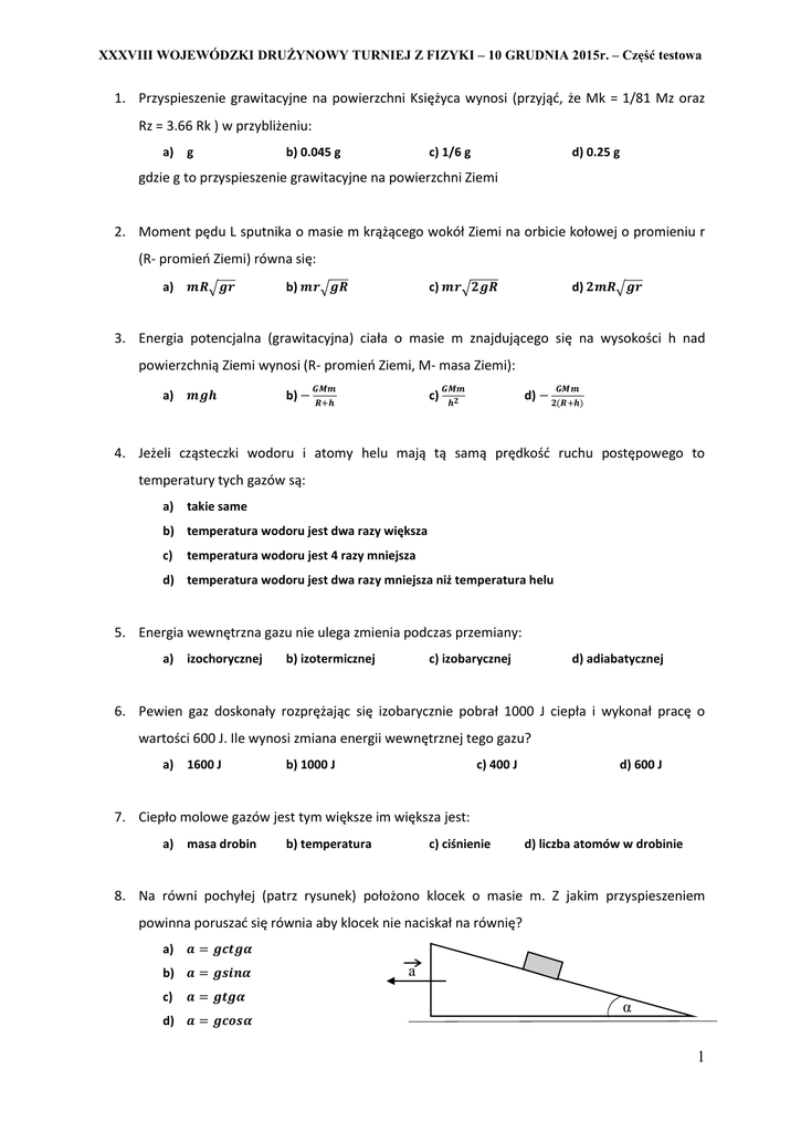 XXXVIII WOJEWÓDZKI DRUŻYNOWY TURNIEJ Z FIZYKI – 10 GRUDNIA 2015r. – Część testowa 1. Przyspieszenie grawitacyjne na powierzchni Księżyca wynosi (przyjąd, że Mk = 1/81 Mz oraz Rz = 3.66 Rk ) w przybliżeniu: a) g b) 0.045 g c) 1/6 g d) 0.25 g gdzie g to przyspieszenie grawitacyjne na powierzchni Ziemi 2. Moment pędu L sputnika o masie m krążącego wokół Ziemi na orbicie kołowej o promieniu r (R- promieo Ziemi) równa się: a) √ b) √ c) √ d) √ 3. Energia potencjalna (grawitacyjna) ciała o masie m znajdującego się na wysokości h nad powierzchnią Ziemi wynosi (R- promieo Ziemi, M- masa Ziemi): a) b) c) d) 4. Jeżeli cząsteczki wodoru i atomy helu mają tą samą prędkośd ruchu postępowego to temperatury tych gazów są: a) takie same b) temperatura wodoru jest dwa razy większa c) temperatura wodoru jest 4 razy mniejsza d) temperatura wodoru jest dwa razy mniejsza niż temperatura helu 5. Energia wewnętrzna gazu nie ulega zmienia podczas przemiany: a) izochorycznej b) izotermicznej c) izobarycznej d) adiabatycznej 6. Pewien gaz doskonały rozprężając się izobarycznie pobrał 1000 J ciepła i wykonał pracę o wartości 600 J. Ile wynosi zmiana energii wewnętrznej tego gazu? a) 1600 J b) 1000 J c) 400 J d) 600 J 7. Ciepło molowe gazów jest tym większe im większa jest: a) masa drobin b) temperatura c) ciśnienie d) liczba atomów w drobinie 8. Na równi pochyłej (patrz rysunek) położono klocek o masie m. Z jakim przyspieszeniem powinna poruszad się równia aby klocek nie naciskał na równię? a) b) c) d) a α 1 XXXVIII WOJEWÓDZKI DRUŻYNOWY TURNIEJ Z FIZYKI – 10 GRUDNIA 2015r. – Część testowa 9. Po kolistym torze zaczyna zsuwad się bez tarcia od punktu A małe ciało o masie m. Maksymalny nacisk ciała na powierzchnię toru wynosi: a) 3mg b) mg c) 2mg A R d) 4mg 10. Na brzegu wirującej tarczy o promieniu R znajduje się niewielkie ciało którego współczynnik tarcia o tarczę wynosi f. Ciało zsunie się z tarczy jeżeli okres jej obrotu wyniesie co najmniej: √ a) b) √ c) √ d) √ 11. Energia kinetyczna dwóch niesprężystych kul może zamienid się całkowicie w ciepło w trakcie ich zderzenia ze sobą, gdy: a) obie kule mają jednakowe masy b) masa jednej z kul jest dużo większa od drugiej c) mają równe, przeciwnie skierowane pędy d) mają te same energie kinetyczne 12. Dwie kule o masie m i M zderzają się ze sobą sprężyście przy czym masa m porusza się z pewną prędkością a masa M spoczywa. Gdy odległośd między ich środkami wynosi d, siła sprężysta zaczyna je odpychad. Prędkości obu ciał będą jednakowe gdy: a) odległośd między nimi będzie równa d b) gdy odległośd między nimi będzie ponownie równa d c) gdy odległośd między środkami kul będzie mniejsza niż d d) gdy znajdą się najbliżej siebie 13. Naczynie w kształcie stożka napełnione jest wodą. Siła parcia cieczy na dno naczynia jest: a) równa ciężarowi cieczy P b) jest 3 razy mniejsza niż P c) jest 3 razy większa niż P d) nie da się określid bo nie podano wysokości stożka i pola jego powierzchni 14. Po morzu pływa kra lodowa. Jeśli przyjąd gęstośd wody ρw = 1000 kg/m3 a gęstośd lodu ρl = 900 kg/m3 to stosunek części znajdującej się nad wodą do objętości podwodnej wynosi około: a) 1/9 b) 9/10 c) 1/10 d) 8/9 15. Energia kinetyczna cząstki relatywistycznej poruszającej się z prędkością v opisana jest wzorem: a) b) ( √ ) c) √ d) √ 2 XXXVIII WOJEWÓDZKI DRUŻYNOWY TURNIEJ Z FIZYKI – 10 GRUDNIA 2015r. – Część testowa 16. Okres drgao odważnika zawieszonego na gumce wynosi T. Jeżeli gumkę przepołowimy a następnie złożymy razem obie części i zawiesimy ten sam odważnik, to okres drgao na gumce powstałej z równoległego złączenia obu jej części wyniesie: a) T b) √ c) 2T d) T/2 17. Jeżeli dwie kulki zawieszone na nitkach jak na rysunku puścimy równocześnie to linię pionu osiągnie najpierw: a) c) 2α kulka II II b) kulka I kulka o mniejszej masie α d) kulka o większej masie I 18. Wychylenie cząstki drgającej ruchem harmonicznym jest równe x = 1/3A (A – amplituda). Jaki jest stosunek energii kinetycznej do energii całkowitej tej cząstki w tym momencie: a) 1/3 b) 1/9 c) 8/9 d) 2/3 19. Jakiego natężenia możemy się spodziewad jeżeli czajnik elektryczny o parametrach znamionowych 1100W/220V włączymy do sieci o napięciu U1 = 110V: a) ok. 10 A b) ok. 5 A c) ok. 1.25 A d) ok. 2.5 A 20. Jeżeli 3 grzałki o jednakowej mocy połączymy szeregowo i włączymy do sieci to woda w czajniku zagotuje się w porównaniu gdy grzałki były połączone równolegle (pominąd ciepło pobrane przez czajnik i wypromieniowane przez ścianki) w czasie: a) ts = 9 t r b) ts = tr c) ts = 3 tr d) ts = 1/9 tr 21. W sytuacji pokazanej na rysunku galwanometr pokazuje zero. Natężenie prądu I wynosi: a) 1A b) 1.5 A c) 2 A d) nie da się obliczyd bo nie podano oporu X 22. Ładunek punktowy q>0 jest przesuwany po torze ABC w polu ładunku Q<0. Prace wykonane przeciw siłą pola na odcinku AB oraz BC spełniają q>0 Q<0 d A d B d C warunek: a) WAB = WBC b) WAB = 3WBC c) WAB = 2WBC d) WAB = 4WBC 3 XXXVIII WOJEWÓDZKI DRUŻYNOWY TURNIEJ Z FIZYKI – 10 GRUDNIA 2015r. – Część testowa 23. Kondensator płaski o pojemności C naładowano ładunkiem Q i odłączono od źródła napięcia. Aby 3-krotnie zwiększyd odległośd między okładkami należy wykonad pracę: a) b) c) d) 24. Jaka jest zdolnośd skupiająca okularów jeżeli człowiek widzi ostre obrazy przedmiotów odległych od jego oka o xl = 1m, a po nałożeniu okularów z odległości dobrego widzenia dla oka normalnomiarowego (d=25 cm): a) Z = -3 dptr b) Z = 1 dptr c) Z = 2 dptr d) Z= - 4 dptr 25. Soczewka szklana (ns = 1.5) i ogniskowej f = 20 cm została zanurzona w CS2 (n0 = 7/4). Ogniskowa tej soczewki wynosi wtedy: a) 82 cm b) 47 cm c) -60 cm d) - 70 cm 26. Proton i cząstka α rozpędzone polem elektrycznym o napi