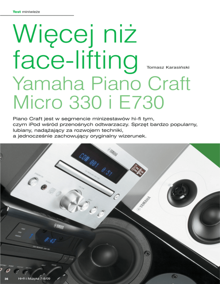 Test miniwie˝e Wi´cej ni˝ face-lifting Tomasz Karasiƒski Yamaha Piano Craft Micro 330 i E730 Piano Craft jest w segmencie minizestawów hi-fi tym, czym iPod wÊród przenoÊnych odtwarzaczy. Sprz´t bardzo popularny, lubiany, nadà˝ajàcy za rozwojem techniki, a jednoczeÊnie zachowujàcy oryginalny wizerunek. 36 Hi•Fi i Muzyka 7-8/09 Test miniwie˝e iedy us∏ysza∏em o pojawieniu si´ nowych modeli, pomyÊla∏em: pewnie kolejny face-lifting i jedno nowe gniazdko. Yamaha stroni od gwa∏townych ruchów, a ju˝ na pewno nie b´dzie ich wykonywaç w przypadku miniwie˝y, która ma zagorza∏ych zwolenników, podobnie, jak Volkswagen Golf czy Farenheit Diora. Zastanawia∏em si´, jak opisaç kolejne wcielenie tego samego produktu, ˝eby nie zostaç posàdzonym o kopiowanie w∏asnego tekstu sprzed roku. Problem rozwiàza∏ si´ sam, gdy otworzy∏em pude∏ka. Micro 330 zasadniczo ró˝ni si´ od wszystkich poprzednich Piano Craftów, choç mo˝na wskazaç kilka cech wspólnych. E730 przypomina natomiast starsze wersje, ale nie jest klasycznà wie˝à do muzyki, poniewa˝ czyta te˝ DVD. K Klasyczny Piano Craft w klasycznej czerni. Micro 330 Front mniejszego Piano Crafta jest p∏aski i tak minimalistyczny, jak to mo˝liwe. Prócz szuflady, wyÊwietlacza, gniazda s∏uchawkowego i pokr´t∏a g∏oÊnoÊci mieÊci zaledwie pi´ç przycisków. Tylko tych niezb´dnych? Ba, nawet mniej! Zabrak∏o mo˝liwoÊci przeskakiwania mi´dzy utworami. Trzeba si´gnàç po pilot – cienki, lekki i por´czny. W takiej sytuacji mo˝na by∏o pójÊç na ca∏oÊç i usunàç z frontu wszystkie guziczki. W∏aÊciciele „330” powinni dbaç o zdalny sterownik – jeÊli si´ zgubi, b´dà musieli w∏àczyç p∏yt´ i cierpliwie czekaç na rozpocz´cie ulubionego utworu. Posiadaczy przenoÊnych playerów ucieszà gniazda umieszczone na górze – z∏àcze iPoda i standardowy port USB. Dzi´ki temu drugiemu mo˝na s∏uchaç nawet empetrójek zgranych na zwyk∏y pendrive. By przypodobaç si´ zwolennikom odtwarzacza z nadgryzionym jab∏kiem w herbie, Yamaha oferuje kolumny w kolorze bia- G∏´bokie kolumny – du˝y bas? W tym przypadku to prawda. ∏ym. Ale mo˝na te˝ wybraç czerƒ. Polecam jà nawet nie tyle ze wzgl´dów estetycznych, co praktycznych. Bia∏e fronty szybko si´ brudzà. Nie sposób nie zauwa˝yç nietypowych proporcji kolumn. Producenci sprz´tu lubià t∏umaczyç takie rozwiàzania obrazowymi przyk∏adami z ˝ycia. Yamaha si´gn´∏a po zdj´cie wyjàtkowo g∏´bokiej stopy perkusyjnej Daxdad. To instrument cokolwiek oryginalny. Wszystkie stopy perkusyjne, jakie w ˝yciu widzia∏em, mia∏y tradycyjne proporcje. Ta stanowi∏a wyjàtek. Ale jeÊli si´ chce wydobyç sensowny bas z kolumn, które z przodu sà niewiele wi´ksze od kartki pocztowej (wymiary 12,3/19,2 cm), trzeba zwi´kszyç ich g∏´bokoÊç. Skuteczne t∏umienie wibracji obudów ma zapewniç system VCCS. Polega on na umieszczeniu kawa∏ków drewna w kluczowych miejscach. W tym przypadku jest to profil w kszta∏cie litery S, umieszczony ukoÊnie pomi´dzy bocznymi Êciankami. Tunele rezonansowe umieszczono w naro˝nikach. Pojedyncze plastikowe gniazda przyjmà dowolny rodzaj zakoƒczeƒ. U˝ytkownik jest jednak skazany na go∏e kable, poniewa˝ w jednostce centralnej zamontowano paskudne zaciski spr´˝ynkowe. Oprócz nich z ty∏u znajdziemy tylko gniazdo antenowe, wyjÊcie do subwoofera i kabel zasilajàcy. Przyda∏oby si´ chocia˝ jedno wejÊcie liniowe. Ârednimi i niskimi tonami zajmujà si´ g∏oÊniki z 7,5-cm membranami, wykonaHi•Fi i Muzyka 7-8/09 37 Test miniwie˝e nymi prawdopodobnie z polipropylenu (producent nic nie pisze na ten temat). Gór´ obs∏ugujà 2,5-cm kopu∏ki, które w biuletynie informacyjnym okreÊla si´ jako „zbalansowane”, cokolwiek mia∏oby to znaczyç. Ciekawie wyglàdajà dane techniczne monitorków: skutecznoÊç: 84 dB, pasmo przenoszenia: 60 Hz – 50 kHz, cz´- Przednia Êcianka to w zasadzie klasyka. Jedynà nowink´ stanowi gniazdo USB, do którego mo˝emy pod∏àczyç przenoÊny odtwarzacz lub zwyk∏à pami´ç flash. Odtworzymy z nich nie tylko muzyk´, ale tak˝e filmy (WMA, MPEG-4) i zdj´cia (JPEG). W modelu Micro 330 interfejs USB dzia∏a∏ sprawniej. E730 d∏u˝ej szuka plików, a kie- Dwudro˝ny uk∏ad jest wentylowany z ty∏u, wi´c lepiej nie przysuwaç monitorów do samej Êciany. Niskie i Êrednie tony odtwarza g∏oÊnik z 8-cm membranà, a gór´ obs∏uguje 25-mm mi´kka kopu∏ka. Kolumny sà dost´pne równie˝ w kolorze bia∏ym, a jednostka centralna – w srebrnym. W E730 na gniazdach nie oszcz´dzano. stotliwoÊç podzia∏u: 8 kHz, impedancja: 6 Ω. Moc wyjÊciowa wzmacniacza: 20 W RMS. Z∏oÊliwcy stwierdzà, ˝e taka wie˝a b´dzie w stanie nag∏oÊniç co najwy˝ej budk´ z kebabem. I to zamkni´tà. E730 E730 to klasyczny Piano Craft ze Êci´tymi kraw´dziami obudowy, tradycyjnym uk∏adem przycisków i pokr´te∏ oraz kolumnami wykoƒczonymi lakierem fortepianowym. Czyta p∏yty DVD, ale mimo wymalowanych na górnej pokrywie „kinowych” symboli (HDMI, DTS, Dolby Digital, DivX), wydaje si´ klasycznà wie˝à do muzyki. PrzenoÊne odtwarzacze mile widziane. 38 Hi•Fi i Muzyka 7-8/09 dy ju˝ je odtwarzamy, potrafi robiç krótkie przerwy na ponowne przeszukanie. Tylnà Êciank´ wyposa˝ono bogato. Mamy tu gniazdo HDMI, wspó∏pracujàce ze skalerem 1080p, komponent, poczciwego scarta i wyjÊcie optyczne. JeÊli zechcemy pod∏àczyç do wie˝y dodatkowe êród∏o sygna∏u, przyda si´ p´tla magnetofonowa (aux in/out), a tak˝e Dock, dla opcjonalnej stacji dokujàcej iPoda. Sà te˝: wyjÊcie do subwoofera w postaci pojedynczego gniazda RCA, gniazda antenowe i kiepskie gniazdka g∏oÊnikowe, do których wetkniemy tylko go∏e kable, na dodatek niezbyt grube. A szkoda, bo w kolumnach sà normalne, cywilizowane terminale, do których mo˝na by pod∏àczyç przewody zakoƒczone bananami lub wide∏k