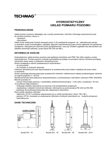 TECHMAG HYDROSTATYCZNY UK£AD POMIARU POZIOMU PRZEZNACZENIE Uk³ad pomiaru poziomu sk³adaj¹cy siê z sondy pomiarowej i miernika cyfrowego przeznaczony jest do pomiaru poziomu cieczy w : - studniach - zbiornikach Uk³ad mo¿e realizowaæ funkcje steruj¹ce przez 4 (5) przekaŸniki progowe, np.: zabezpieczaæ pompy w studniach przed suchobiegiem, specjalny algorytm naprzemiennej pracy pomp zapewnia ich jednakowe obci¹¿enie, zabezpieczaæ zbiorniki przed przepe³nieniem, oraz byæ Ÿród³em sygna³ów dla sterowników lub uk³adów transmisji radiowej ( przez ³¹cze RS 232 lub 485 ). INFORMACJE OGÓLNE Hydrostatyczny uk³ad pomiaru poziomu jest aplikacj¹ mierników serii PMC 30x (40x) opart¹ o sondy hydrostatyczne. Pomiar poziomu metod¹ hydrostatyczn¹ polega na pomiarze ró¿nicy ciœnienia pomiêdzy ciœnieniem s³upa wody a ciœnieniem atmosferycznym. Sondy wystêpuj¹ w dwóch podstawowych wykonaniach : - do zanurzenia - do monta¿u w œcianach zbiornika Ciœnienie atmosferyczne jest doprowadzane do przetwornika przez kabel z kapilar¹ lub przez otwór w obudowie. Sondy zawieraj¹ piezorezystancyjne przetworniki ciœnienia i elektroniczne uk³ady przetwarzaj¹ce ciœnienie na sygna³ pr¹dowy 4 ÷ 20 mA. Sonda pomiarowa jest po³¹czona dwuprzewodowo z przemys³owym miernikiem cyfrowym PMC 30X(40X). Miernik pozwala na : - odczyt mierzonego poziomu ( wyœwietlacz elektroluminescencyjny : 4 (5) cyfry o wysokoœci 20 mm, 10 punktowa linijka œwietlna ) - realizacjê uk³adów sterowania za pomoc¹ 4 (5) przekaŸników progowych - wspó³pracê z uk³adami transmisji radiowej i sterowania za pomoc¹ ³¹cza RS 232 lub RS 485 - realizacjê 32-punktowej linearyzacji dla nietypowych zbiorników Dwie wersje obudowy miernika : - tablicowa ( IP 20 ) umo¿liwia zabudowanie go w szafie pomiarowej ( otwór 138 x 68 ) - polowa ( IP 54 ) pozwala na u¿ytkowanie miernika w trudnych warunkach np. : budynki pompowni, hale fabryczne DANE TECHNICZNE 150 150 170 165 KO£NIERZ Z ROWKIEM DN 50 PN 40 PN-H/74370 157 16 Sonda PC - 51 Sonda SG - 16 25 Sonda SG - 25 60 Sonda SG - 25 S Typ sondy Zakres pomiarowy ( FSO ) PC - 51 mH2O 4 SG - 16 10 - 60 10 - 100 SG - 25 / 25S 4 2,5 x zakres 2 x zakres 2 x zakres Dopuszczalne przeci¹¿enie Zakres temperatur pracy Zakres temperatur kompensacji 4 - 10 10 - 200 2 x zakres -30 - 130 -25 - 50 -25 - 50 0 - 70 0 - 25 0 - 25 0,4 0,5 0,3 B³¹d podstawowy %FSO/10 C B³¹d temperaturowy zera %FSO/10 C 0,5 0,3 0,3 0,6 0,4 0,3 B³¹d temperaturowy zakresu %FSO/10 C 0,4 0,3 0,3 0,4 0,4 0,3 Sondy PC - 51 umo¿liwiaj¹ pomiar cieczy charakteryzuj¹cych siê du¿¹ lepkoœci¹, sk³onnoœci¹ do krystalizacji, krzepliwoœci¹, nisk¹ lub wysok¹ temperatur¹, silnym dzia³aniem korozyjnym, zawartoœci¹ zawiesin, osadów, wtr¹ceñ cia³ sta³ych. Ciœnienie atmosferyczne, dla wykonania IP54, jest doprowadzone do przetwornika przez otwór w obudowie, dla wykonania IP 65, przez rurkê kapilarn¹ w kablu pomiarowym. Sondy SG - 16 i SG - 25 umo¿liwiaj¹ pomiar poziomu wody w zbiornikach, studniach, odwiertach. Sondy SG - 25S s³u¿¹ do pomiaru œcieków i innych gêstych mediów. W sondach zanurzeniowych ciœnienie atmosferyczne jest doprowadzane do przetwornika przez kabel z kapilar¹. Obudowy i membrany wykonane s¹ standardowo ze stali kwasoodpornej. Dla sondy PC-51 mo¿liwe jest wykonanie membrany i przylgi z tantalu lub teflonu. Konstrukcja sond zapewnia du¿¹ trwa³oœæ i odpornoœæ na uszkodzenia mechaniczne. U¿yte czujniki krzemowe zapewniaj¹ dobr¹ stabilnoœæ i niezawodnoœæ. Podstawowe dane techniczne miernika PMC 30X(40X) - zakres wskazañ programowalny; odpowiednio do zakresu sondy - progi alarmowe 4 (5) ustawiane w ca³ym zakresie pomiarowym steruj¹ce stykami przekaŸników, sygnalizacja stanu œwieceniem diod na p³ycie czo³owej - przekaŸniki progowe 4 (5) Ip = 3A, UP = 250V - histereza progów 0 - 99 % zakresu pomiarowego - b³¹d podstawowy 0,05 % - sygna³ wyjœciowy (opcja) RS 232 lub RS 485 - sygna³ wyjœciowy (opcja) Iout= 4...20mAI SPOSÓB ZAMAWIANIA W zamówieniu nale¿y podaæ: - wersjê obudowy miernika - typ sondy - zakres pomiarowy - d³ugoœæ kabla pomiarowego - rodzaj mierzonej cieczy - wyposa¿enie dodatkowe np.: linka nierdzewna do zawieszenia sondy zanurzeniowej Producent Zak³ad Elektroniki Pomiarowej TECHMAG 44-121 Gliwice ul.Sowiñskiego 3 tel/fax (0-32) 237-63-37 e-mail [email protected]