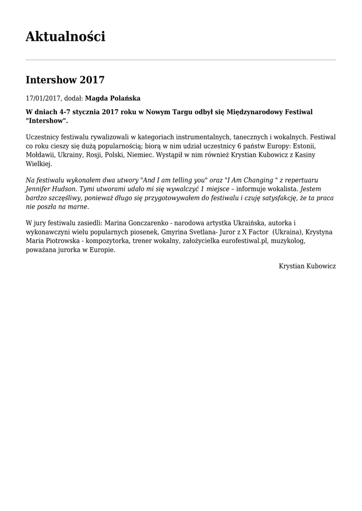 Aktualności Intershow 2017 17/01/2017, dodał: Magda Polańska W dniach 4-7 stycznia 2017 roku w Nowym Targu odbył się Międzynarodowy Festiwal "Intershow". Uczestnicy festiwalu rywalizowali w kategoriach instrumentalnych, tanecznych i wokalnych. Festiwal co roku cieszy się dużą popularnością; biorą w nim udział uczestnicy 6 państw Europy: Estonii, Mołdawii, Ukrainy, Rosji, Polski, Niemiec. Wystąpił w nim również Krystian Kubowicz z Kasiny Wielkiej. Na festiwalu wykonałem dwa utwory "And I am telling you" oraz "I Am Changing " z repertuaru Jennifer Hudson. Tymi utworami udało mi się wywalczyć 1 miejsce – informuje wokalista. Jestem bardzo szczęśliwy, ponieważ długo się przygotowywałem do festiwalu i czuję satysfakcję, że ta praca nie poszła na marne. W jury festiwalu zasiedli: Marina Gonczarenko - narodowa artystka Ukraińska, autorka i wykonawczyni wielu popularnych piosenek, Gmyrina Svetlana- Juror z X Factor (Ukraina), Krystyna Maria Piotrowska - kompozytorka, trener wokalny, założycielka eurofestiwal.pl, muzykolog, poważana jurorka w Europie. Krystian Kubowicz