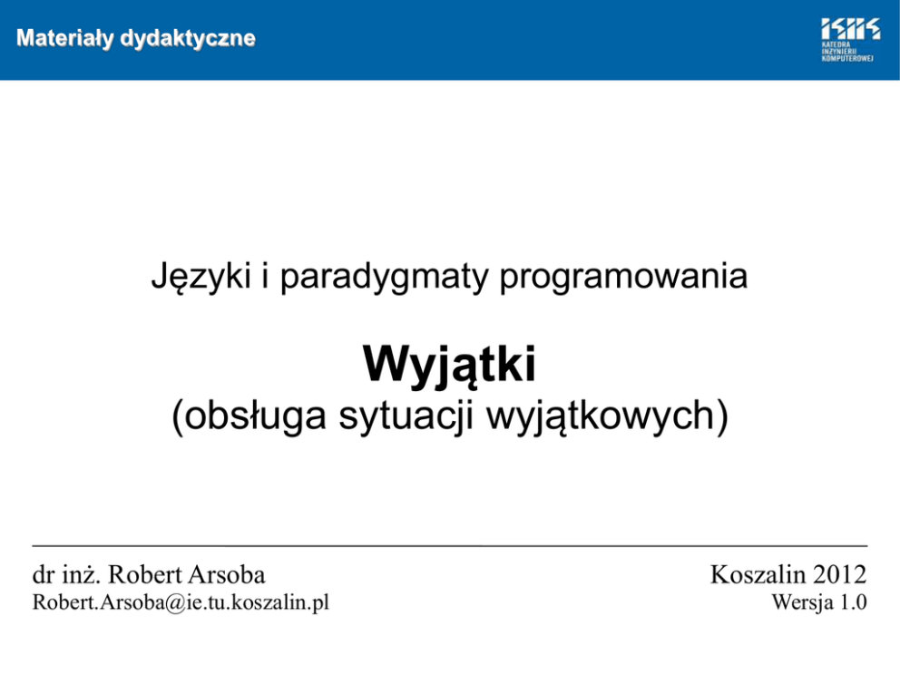 Materiały dydaktyczne Języki i paradygmaty programowania Wyjątki (obsługa sytuacji wyjątkowych) dr inż. Robert Arsoba [email protected] Koszalin 2012 Wersja 1.0 KIK 2012 Sytuacje wyjątkowe w programach Strona 2 Powody sytuacji wyjątkowych: • błąd w programie • niepoprawne dane wejściowe • niepoprawne działanie sprzętu przyczyny wewnętrzne przyczyny zewnętrzne Języki i paradygmaty programowania Obsługa błędów: • zakończenie programu z komunikatem o błędzie – funkcja exit (kod błędu) • „bezpieczne” zakończenie programu – zapis danych – zwolnienie zasobów (pamięć, pliki, strumienie, itd…) • kontynuacji działania programu – próba naprawienia błędu – próba „obejścia” błędu – rezygnacja z części funkcjonalności programu KIK 2012 Przykłady sytuacji wyjątkowych Strona 3 Przykład 1 Dzielenie przez zero int a = 5; int b = 0; int c; Języki i paradygmaty programowania Rozwiązanie: wykrywanie błędu if (b == 0) // ... c = a / b; Runtime error KIK 2012 Przykłady sytuacji wyjątkowych Strona 4 Przykład 2 Języki i paradygmaty programowania Przepełnienie zmiennej int silnia(unsigned int n) { if (n > 12) Rozwiązanie return 0; unsigned int wynik = 1; for (int i = 1; i <= n; i++ ) wynik = wynik * i; return wynik; } double silnia(unsigned int n) { double wynik = 1; for (int i = 1; i <= n; i++ ) wynik = wynik * i; return wynik; } Błędny wynik obliczeń KIK 2012 Przykłady sytuacji wyjątkowych Strona 5 Przykład 3 Błąd otwarcia pliku FILE *plik; Języki i paradygmaty programowania plik = fopen(”nazwa.txt”, ”r”); if (plik == NULL) { cout << ”Błąd otwarcia pliku” << endl; exit(1); } Rozwiązanie Odczytywanie z nieotwartego pliku KIK 2012 Przykłady sytuacji wyjątkowych Strona 6 Przykład 4 Języki i paradygmaty programowania Brak pamięci int *tablica; int n; cin >> n; tablica = malloc(n*sizeof(int)); if (tablica == NULL) { cout << ”Brak pamięci” << endl; exit(1); } Rozwiązanie tablica = new int[n]; if (tablica == NULL) { cout << ”Brak pamięci” << endl; exit(1); } Odwoływanie się do zabronionego obszaru pamięci KIK 2012 Przykłady sytuacji wyjątkowych Strona 7 Przykład 5 Przekroczenie zakresu int tablica[5]; Języki i paradygmaty programowania for (int i = 0; i < 10; i++) tablica[i] = i; Odwoływanie się do zabronionego obszaru pamięci KIK 2012 Wyjątki w C++ Strona 8 Wyjątkiem (ang. exception) w C++ może być wartość dowolnego typu (prostego, obiektowego, …). Języki i paradygmaty programowania Funkcja, która wykryje błąd i nie obsługuje go (lub nie jest w stanie go obsłużyć) generuje (rzuca) wyjątek. Wygenerowanie (rzucenie) wyjątku powoduje natychmiastowe przerwanie wykonywania funkcji. Funkcja wywołująca może przechwycić (złapać) wyjątek. Nieprzechwycony (niezłapany) wyjątek powoduje przerwanie wykonywania programu – nie należy ignorować wyjątków. KIK 2012 Nowe słowa kluczowe Strona 9 Z wyjątkami związane są następujące polecenia (tzw. klauzulue): try – polecenie, po którym umieszczamy instrukcje, które mogą potencjalnie wygenerować (rzucić) wyjątek Języki i paradygmaty programowania catch – polecenie przechwytujące wyjątek – można używać kilku poleceń catch do łapania wyjątków (sterowanie programem jest przekazywane do polecenia, które odpowiada wygenerowanemu wyjątkowi) throw – polecenie rzucające wyjątek – umożliwia także zadeklarowanie listy wyjątków rzucanych przez funkcję KIK 2012 Przykład Strona 10 Języki i paradygmaty programowania #include <iostream> #include <cstdlib> using namespace std; class liczba { public: liczba(int x = 0) : wartosc(x) { cout << "tworzenie obiektu: " << wartosc << endl; } ~liczba() { cout << "niszczenie obiektu " << wartosc << endl; } private: int wartosc; }; void fun() { liczba a(1); throw 0; // wygenerowanie wyjatku //throw 0.0; // wygenerowanie wyjatku cout << "efekt uruchomienia funkcji" << endl; } KIK 2012 Języki i paradygmaty programowania Przykład Strona 11 int main() { liczba b(2); try { liczba c(3); fun(); cout << "efekt polecenia try" << endl; } catch (double) { cout << "przechwycono double" << endl; } catch (int) { cout << "przechwycono int" << endl; } catch (...) // każdy wyjątek { cout << "przechwycono COŚ" << endl; } cout << "efekt dzialania main" << endl; return 0; } Przed kaluzulami catch wywołane zostaną destruktory tworzenie obiektu 2 tworzenie obiektu 3 tworzenie obiektu 1 niszczenie obiektu 1 niszczenie obiektu 3 przechwycono int efekt działania main KIK 2012 Przykład – nieprzechwycone wyjątki Strona 12 Nieprzechwycenie wyjątku powoduje wywołanie funkcji systemowej terminate(), która następnie wywołuje funkcję abort(). Definiowanie własnej funkcji terminate: Języki i paradygmaty programowania namespace std { typedef void (*terminate_handler)(void); terminate_handler set_terminate(terminate_handler NaszTerminate); } void NaszTerminate() { std::cerr << "zatrzymanie programu" << std::endl; exit(1); Własna funkcja terminate musi kończyć się } wywołaniem funkcji exit lub abort. main() { std::set_terminate(NaszTerminate); throw 0; } KIK 2012 Deklaracja wyjątków rzucanych przez funkcję Strona 13 void funkcja1() throw() { } // nie rzuca żadnych wyjątków void funkcja2() throw(exception) { } Języki i paradygmaty programowania void funkcja3() { } // rzuca wyjątki tylko ze // standardowej hierarchii // rzuca dowolne wyjątki Jeżeli funkcja rzuca wyjątek, który nie został zadeklarowany na liście wyjątków w nagłówku funkcji, to wywołana zostaje funkcja systemowa unexpected(), która domyślnie wywołuje abort(). Definiowanie własnej funkcji unexpected: void unexpected_handler() { throw 0; // np. rzucanie int }; std::set_unexpected(unexpected_handler); KIK 2012 Hierarchia wyjątków Strona 14 Języki i paradygmaty programowania Hierarchia klas wyjątków w bibliotece standardowej KIK 2012 Korzystanie z hierarchii wyjątków Strona 15 N