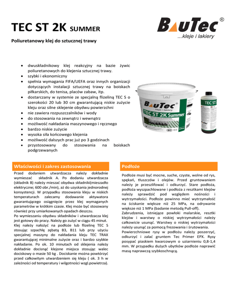 TEC ST 2K SUMMER Poliuretanowy klej do sztucznej trawy dwuskładnikowy klej reakcyjny na bazie żywic poliuretanowych do klejenia sztucznej trawy. szybki i ekonomiczny spełnia wymagania FIFA/UEFA oraz innych organizacji dotyczących instalacji sztucznej trawy na boiskach piłkarskich, do tenisa, placów zabaw, itp. dostarczany w systemie ze specjalną flizeliną TEC S o szerokości 20 lub 30 cm gwarantującą niskie zużycie kleju oraz silne sklejenie obydwu powierzchni nie zawiera rozpuszczalników i wody do stosowania na zewnątrz i wewnątrz możliwość nakładania maszynowego i ręcznego bardzo niskie zużycie wysoka siła końcowego klejenia możliwość dalszych prac już po 3 godzinach przystosowany do stosowania na boiskach podgrzewanych Właściwości i zakres zastosowania Przed dodaniem utwardzacza należy dokładnie wymieszać składnik A. Po dodaniu utwardzacza (składnik B) należy mieszać obydwa składniki(mieszadło elektryczne; 600 obr./min), aż do uzyskania jednorodnej konsystencji. W przypadku stosowania kleju w niskich temperaturach zalecamy dodawanie aktywatora gwarantującego osiągnięcie przez klej wymaganych parametrów w krótkim czasie. Klej może być stosowany również przy umiarkowanych opadach deszczu. Po wymieszaniu obydwu składników i utwardzacza klej jest gotowy do pracy. Należy go zużyć w ciągu 45 minut. Klej należy nałożyć na podłoże lub flizelinę TEC S stosując szpachlę zębatą B3, B11 lub przy użyciu specjalnej maszyny do nakładania kleju TEC TRAX gwarantującej minimalne zużycie oraz i bardzo szybkie nakładanie. Po ok. 10 minutach od sklejenia należy dokładnie docisnąć klejone miejsca stosując walec dociskowy o masie 50 kg . Dociskanie można powtórzyć przed całkowitym utwardzeniem się kleju ( ok. 3 h w zależności od temperatury i wilgotności wzgl.powietrza). Podłoże Podłoże musi być mocne, suche, czyste, wolne od rys, spękań, tłuszczów i olejów. Przed gruntowaniem należy je przeszlifować i odkurzyć. Stare podłoża, podłoża wyszpachlowane i podłoża z resztkami klejów należy sprawdzić pod względem nośności i wytrzymałości. Podłoże powinno mieć wytrzymałość na ściskanie większe niż 25 MPa, na odrywanie większe niż 1 MPa (badanie metodą Pull-off). Zabrudzenia, istniejące powłoki malarskie, resztki klejów i warstwy o niskiej wytrzymałości należy całkowicie usunąć. Warstwy o niskiej wytrzymałości należy usunąć za pomocą frezowania i śrutowania. Powierzchniowe rysy w podłożu należy poszerzyć, odkurzyć i zalać gruntem Tec Primer EPX. Rysy posypać piaskiem kwarcowym o uziarnieniu 0,8-1,4 mm. W przypadku dużych ubytków podłoże naprawić masą naprawczą szybkoschnącą. Narzędzia Dane techniczne Maszynka do nakładania kleju na taśmę, paca zębata Skład: żywice poliuretanowe Czyszczenie narzędzi Kolor: zielony Rozpuszczalnik TEC VD, bezpośrednio po użyciu. Po wyschnięciu można usunąć tylko mechanicznie Konsystencja: półpłynna Usuwanie: rozpuszczalnik TEC VD Temperatura stosowania: 0d -15°C do +27°C Zużycie ok 900 g/m2 Czas schnięcia Chodzi o wartości przybliżone, zależne od temperatury pomieszczenia, temperatury podłoża, wilgotności podłoża i od wilgotności względnej powietrza. Niska temperatura, podwyższona wilgotność względna powietrza, złe wietrzenie wydłużają lub skracają czas schnięcia. Czas schnięcia : ok 3 godz. Stosowanie: składnik A + składnik B Składowanie: temp. powyżej +5 °C Magazynowanie: 12 miesięcy w suchych i chłodnych pomieszczeniach, w szczelnym opakowaniu. Chronić przed mrozem Opakowanie 17,1 kg (klej 15,4 kg + utwardzacz 1,7 kg) Bezpieczeństwo i ochrona Podczas pracy używać gumowy rękawic. Po zakończeniu prac przewietrzyć pomieszczenie. Resztek kleju w opakowaniu nie wyrzucać tylko odpowiednio i bezpiecznie utylizować. Opakowanie chronimy przed dziećmi. Ważne wskazówki Powyższe dane przygotowanie i zastosowanie produktu oparto na naszej wiedzy i doświadczeniu. Niższe temperatury wydłużają czasy zastosowań, a wyższe skracają. Z powodu różnych niezależnych od nas czynników np. nietypowe podłoża, warunki zewnętrzne, jakość pracy, zalecamy przeprowadzenie własnych prób aby stwierdzić, czy nasz produkt nadaje się do danego postępowania. Firma Bautec Polska nie ponosi odpowiedzialności z tego powodu. Przed użyciem należy zapoznać się z instrukcją techniczną i kartą charakterystyki produktu. Prace należy wykonywać zgodnie z zasadami BHP. Aktualizacja 30.05.2015 BAUTEC POLSKA SP. Z O.O. UL. TURNIEJOWA 8, 53-014 WROCŁAW TEL. 71 796 26 02, +48 722-142-403 www.bautec.pl * [email protected]