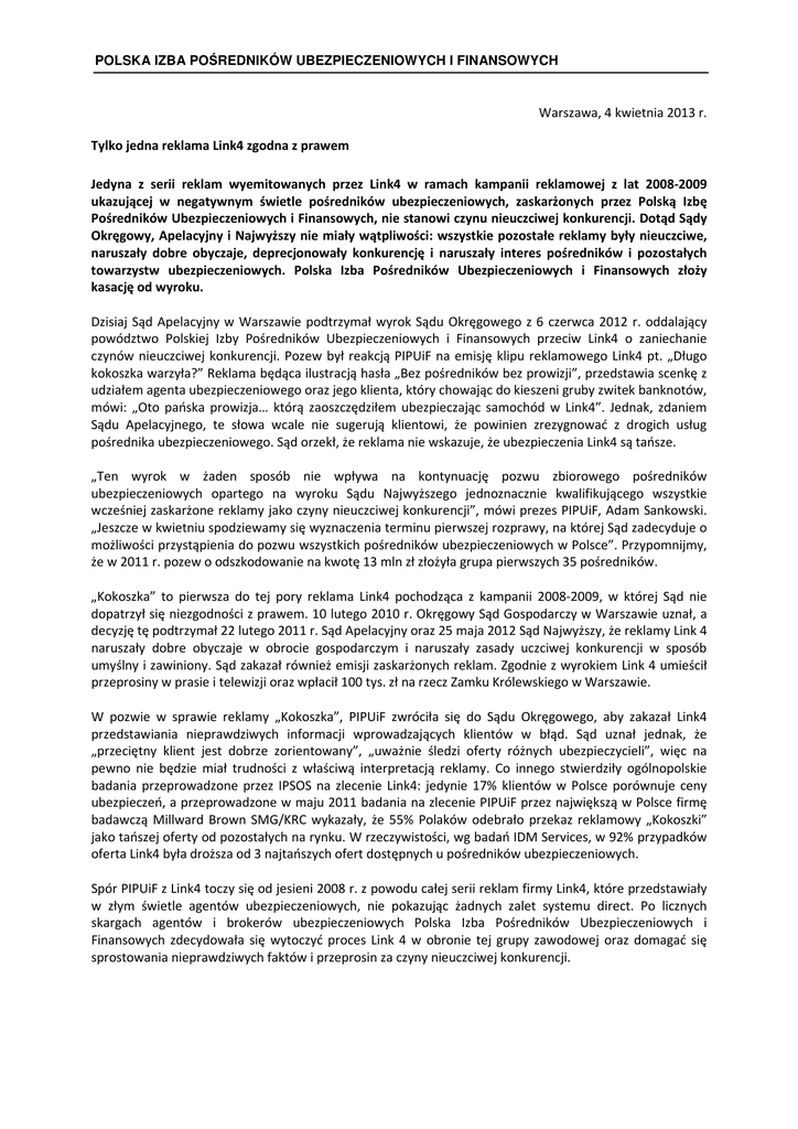POLSKA IZBA POŚREDNIKÓW UBEZPIECZENIOWYCH I FINANSOWYCH Warszawa, 4 kwietnia 2013 r. Tylko jedna reklama Link4 zgodna z prawem Jedyna z serii reklam wyemitowanych przez Link4 w ramach kampanii reklamowej z lat 2008-2009 ukazującej w negatywnym świetle pośredników ubezpieczeniowych, zaskarżonych przez Polską Izbę Pośredników Ubezpieczeniowych i Finansowych, nie stanowi czynu nieuczciwej konkurencji. Dotąd Sądy Okręgowy, Apelacyjny i Najwyższy nie miały wątpliwości: wszystkie pozostałe reklamy były nieuczciwe, naruszały dobre obyczaje, deprecjonowały konkurencję i naruszały interes pośredników i pozostałych towarzystw ubezpieczeniowych. Polska Izba Pośredników Ubezpieczeniowych i Finansowych złoży kasację od wyroku. Dzisiaj Sąd Apelacyjny w Warszawie podtrzymał wyrok Sądu Okręgowego z 6 czerwca 2012 r. oddalający powództwo Polskiej Izby Pośredników Ubezpieczeniowych i Finansowych przeciw Link4 o zaniechanie czynów nieuczciwej konkurencji. Pozew był reakcją PIPUiF na emisję klipu reklamowego Link4 pt. „Długo kokoszka warzyła?” Reklama będąca ilustracją hasła „Bez pośredników bez prowizji”, przedstawia scenkę z udziałem agenta ubezpieczeniowego oraz jego klienta, który chowając do kieszeni gruby zwitek banknotów, mówi: „Oto pańska prowizja… którą zaoszczędziłem ubezpieczając samochód w Link4”. Jednak, zdaniem Sądu Apelacyjnego, te słowa wcale nie sugerują klientowi, że powinien zrezygnować z drogich usług pośrednika ubezpieczeniowego. Sąd orzekł, że reklama nie wskazuje, że ubezpieczenia Link4 są tańsze. „Ten wyrok w żaden sposób nie wpływa na kontynuację pozwu zbiorowego pośredników ubezpieczeniowych opartego na wyroku Sądu Najwyższego jednoznacznie kwalifikującego wszystkie wcześniej zaskarżone reklamy jako czyny nieuczciwej konkurencji”, mówi prezes PIPUiF, Adam Sankowski. „Jeszcze w kwietniu spodziewamy się wyznaczenia terminu pierwszej rozprawy, na której Sąd zadecyduje o możliwości przystąpienia do pozwu wszystkich pośredników ubezpieczeniowych w Polsce”. Przypomnijmy, że w 2011 r. pozew o odszkodowanie na kwotę 13 mln zł złożyła grupa pierwszych 35 pośredników. „Kokoszka” to pierwsza do tej pory reklama Link4 pochodząca z kampanii 2008-2009, w której Sąd nie dopatrzył się niezgodności z prawem. 10 lutego 2010 r. Okręgowy Sąd Gospodarczy w Warszawie uznał, a decyzję tę podtrzymał 22 lutego 2011 r. Sąd Apelacyjny oraz 25 maja 2012 Sąd Najwyższy, że reklamy Link 4 naruszały dobre obyczaje w obrocie gospodarczym i naruszały zasady uczciwej konkurencji w sposób umyślny i zawiniony. Sąd zakazał również emisji zaskarżonych reklam. Zgodnie z wyrokiem Link 4 umieścił przeprosiny w prasie i telewizji oraz wpłacił 100 tys. zł na rzecz Zamku Królewskiego w Warszawie. W pozwie w sprawie reklamy „Kokoszka”, PIPUiF zwróciła się do Sądu Okręgowego, aby zakazał Link4 przedstawiania nieprawdziwych informacji wprowadzających klientów w błąd. Sąd uznał jednak, że „przeciętny klient jest dobrze zorientowany”, „uważnie śledzi oferty różnych ubezpieczycieli”, więc na pewno nie będzie miał trudności z właściwą interpretacją reklamy. Co innego stwierdziły ogólnopolskie badania przeprowadzone przez IPSOS na zlecenie Link4: jedynie 17% klientów w Polsce porównuje ceny ubezpieczeń, a przeprowadzone w maju 2011 badania na zlecenie PIPUiF przez największą w Polsce firmę badawczą Millward Brown SMG/KRC wykazały, że 55% Polaków odebrało przekaz reklamowy „Kokoszki” jako tańszej oferty od pozostałych na rynku. W rzeczywistości, wg badań IDM Services, w 92% przypadków oferta Link4 była droższa od 3 najtańszych ofert dostępnych u pośredników ubezpieczeniowych. Spór PIPUiF z Link4 toczy się od jesieni 2008 r. z powodu całej serii reklam firmy Link4, które przedstawiały w złym świetle agentów ubezpieczeniowych, nie pokazując żadnych zalet systemu direct. Po licznych skargach agentów i brokerów ubezpieczeniowych Polska Izba Pośredników Ubezpieczeniowych i Finansowych zdecydowała się wytoczyć proces Link 4 w obronie tej grupy zawodowej oraz domagać się sprostowania nieprawdziwych faktów i przeprosin za czyny nieuczciwej konkurencji.