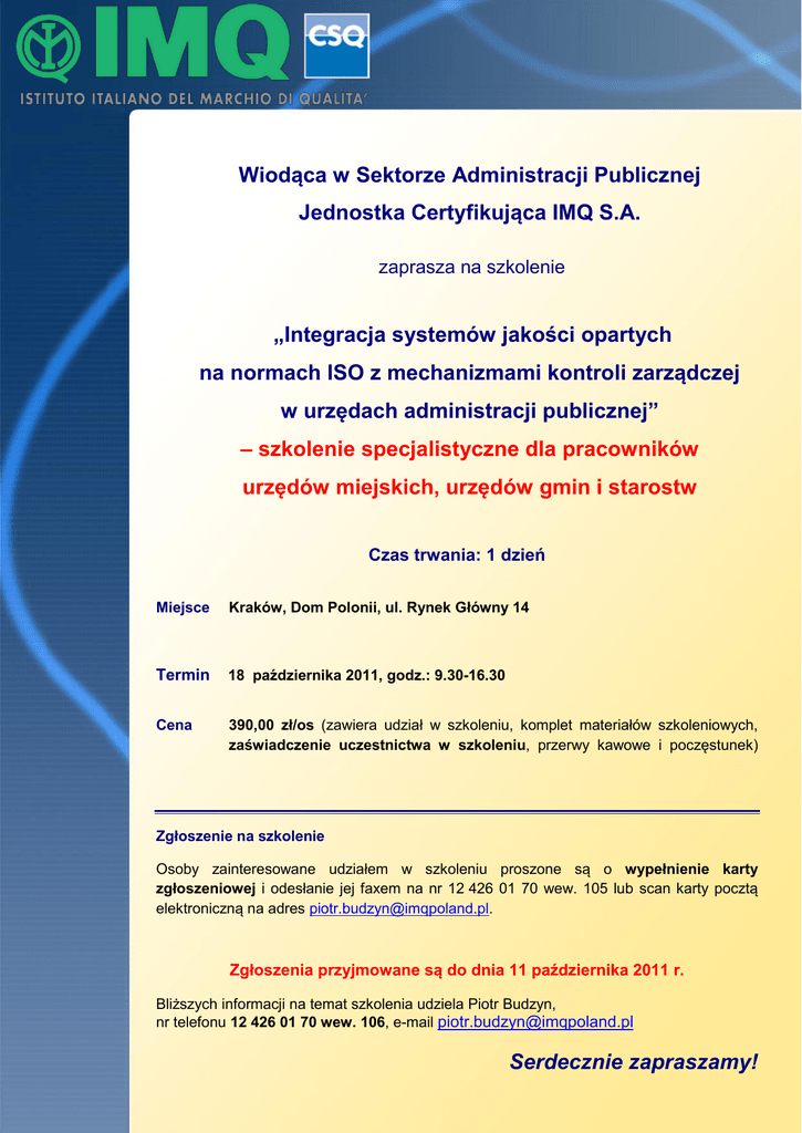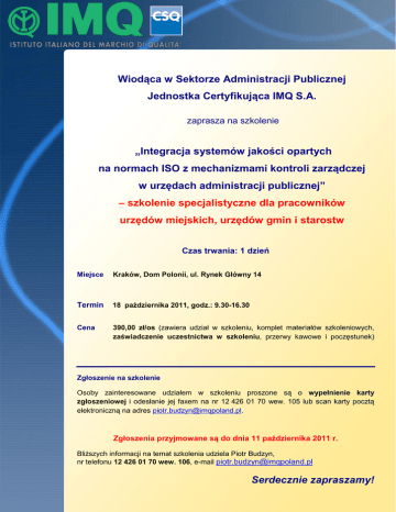 Wiodąca w Sektorze Administracji Publicznej Jednostka Certyfikująca IMQ S.A. zaprasza na szkolenie „Integracja systemów jakości opartych na normach ISO z mechanizmami kontroli zarządczej w urzędach administracji publicznej” – szkolenie specjalistyczne dla pracowników urzędów miejskich, urzędów gmin i starostw Czas trwania: 1 dzień Miejsce Kraków, Dom Polonii, ul. Rynek Główny 14 Termin 18 października 2011, godz.: 9.30-16.30 Cena 390,00 zł/os (zawiera udział w szkoleniu, komplet materiałów szkoleniowych, zaświadczenie uczestnictwa w szkoleniu, przerwy kawowe i poczęstunek) Zgłoszenie na szkolenie Osoby zainteresowane udziałem w szkoleniu proszone są o wypełnienie karty zgłoszeniowej i odesłanie jej faxem na nr 12 426 01 70 wew. 105 lub scan karty pocztą elektroniczną na adres [email protected]. Zgłoszenia przyjmowane są do dnia 11 października 2011 r. Bliższych informacji na temat szkolenia udziela Piotr Budzyn, nr telefonu 12 426 01 70 wew. 106, e-mail [email protected] Serdecznie zapraszamy! Informacje o szkoleniu Cele Szkolenie zostało opracowane na podstawie wymogów przepisów prawa w zakresie kontroli zarządczej oraz wieloletnich doświadczeń związanych z systemami zarządzania jakością w administracji publicznej. Nadrzędnym celem szkolenia jest przekazanie informacji praktycznych oraz specyficznych dla sektora administracji publicznej, niezbędnych osobom, które zajmują się kontrolą zarządczą i/lub zarządzaniem jakością w urzędach lub zostaną w przyszłości powołane na to stanowisko. Szkolenie ma na celu doskonalenie i rozwój kompetencji osób odpowiedzialnych za kontrolę zarządczą i/lub jakość w urzędach miejskich, urzędach gmin i starostwach. Trenerzy: Agnieszka Stankiewicz – od 2005 roku audytor wewnętrzny z uprawnieniami nadanymi przez Ministra Finansów (Nr zaśw. 1811/2005); od 2010 roku certyfikowany audytor kontroli wewnętrznej Certified Internal Controls Auditor (CICA) nadany przez The Institute for Internal Controls; od 2005r. audytor wewnętrzny w jednostkach służby zdrowia oraz w jednostkach sektora finansów publicznych. Dr hab. Marek Bugdol - profesor nadzwyczajny Uniwersytetu Jagiellońskiego, wieloletni Audytor Wiodący Jednostki Certyfikującej IMQ; Członek Komitetu Polskiej Nagrody Jakości; specjalista ds. kontroli zarządczej; autor wielu publikacji z zakresu zarządzania jakością w sektorze publicznym. Metody Zajęcia będą miały charakter wykładu połączonego dyskusją. Zarys programowy Istota, cel i znaczenie standardów kontroli zarządczej dla sektora finansów publicznych Poziomy funkcjonowania kontroli zarządczej w sektorze finansów publicznych Międzynarodowe standardy kontroli zarządczej Odpowiedzialność za zaniechanie w zakresie kontroli zarządczej Obszary stosowania kontroli zarządczej: Środowisko wewnętrzne – jako czynnik warunkujący jakość kontroli zarządczej Cele i zarządzanie ryzykiem – jako warunek skuteczności komunikacji i ograniczania ryzyka w działalności jednostki. Informacja i komunikacja – jako determinanta sprawnego przepływu informacji i warunek publiczności jednostki Mechanizmy kontroli – jako warunek monitorowania osiągania celów jednostki i sprawnej realizacji zamierzeń Monitorowanie i ocena – jako źródło informacji dla oceny jakości systemu kontroli zarządczej Integracja systemów jakości z mechanizmami kontroli zarządczej