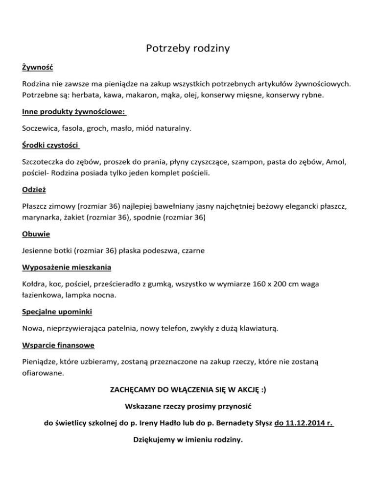 Potrzeby rodziny Żywność Rodzina nie zawsze ma pieniądze na zakup wszystkich potrzebnych artykułów żywnościowych. Potrzebne są: herbata, kawa, makaron, mąka, olej, konserwy mięsne, konserwy rybne. Inne produkty żywnościowe: Soczewica, fasola, groch, masło, miód naturalny. Środki czystości Szczoteczka do zębów, proszek do prania, płyny czyszczące, szampon, pasta do zębów, Amol, pościel- Rodzina posiada tylko jeden komplet pościeli. Odzież Płaszcz zimowy (rozmiar 36) najlepiej bawełniany jasny najchętniej beżowy elegancki płaszcz, marynarka, żakiet (rozmiar 36), spodnie (rozmiar 36) Obuwie Jesienne botki (rozmiar 36) płaska podeszwa, czarne Wyposażenie mieszkania Kołdra, koc, pościel, prześcieradło z gumką, wszystko w wymiarze 160 x 200 cm waga łazienkowa, lampka nocna. Specjalne upominki Nowa, nieprzywierająca patelnia, nowy telefon, zwykły z dużą klawiaturą. Wsparcie finansowe Pieniądze, które uzbieramy, zostaną przeznaczone na zakup rzeczy, które nie zostaną ofiarowane. ZACHĘCAMY DO WŁĄCZENIA SIĘ W AKCJĘ :) Wskazane rzeczy prosimy przynosić do świetlicy szkolnej do p. Ireny Hadło lub do p. Bernadety Słysz do 11.12.2014 r. Dziękujemy w imieniu rodziny.