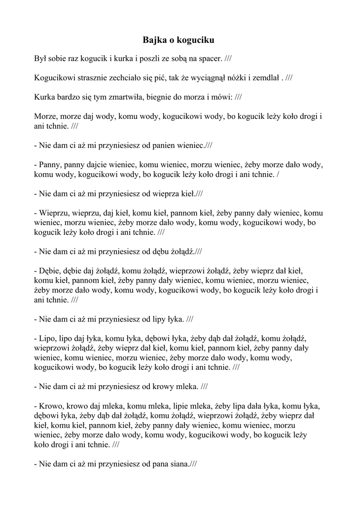 Bajka o koguciku Był sobie raz kogucik i kurka i poszli ze sobą na spacer. /// Kogucikowi strasznie zechciało się pić, tak że wyciągnął nóżki i zemdlał . /// Kurka bardzo się tym zmartwiła, biegnie do morza i mówi: /// Morze, morze daj wody, komu wody, kogucikowi wody, bo kogucik leży koło drogi i ani tchnie. /// - Nie dam ci aż mi przyniesiesz od panien wieniec./// - Panny, panny dajcie wieniec, komu wieniec, morzu wieniec, żeby morze dało wody, komu wody, kogucikowi wody, bo kogucik leży koło drogi i ani tchnie. / - Nie dam ci aż mi przyniesiesz od wieprza kieł./// - Wieprzu, wieprzu, daj kieł, komu kieł, pannom kieł, żeby panny dały wieniec, komu wieniec, morzu wieniec, żeby morze dało wody, komu wody, kogucikowi wody, bo kogucik leży koło drogi i ani tchnie. /// - Nie dam ci aż mi przyniesiesz od dębu żołądź./// - Dębie, dębie daj żołądź, komu żołądź, wieprzowi żołądź, żeby wieprz dał kieł, komu kieł, pannom kieł, żeby panny dały wieniec, komu wieniec, morzu wieniec, żeby morze dało wody, komu wody, kogucikowi wody, bo kogucik leży koło drogi i ani tchnie. /// - Nie dam ci aż mi przyniesiesz od lipy łyka. /// - Lipo, lipo daj łyka, komu łyka, dębowi łyka, żeby dąb dał żołądź, komu żołądź, wieprzowi żołądź, żeby wieprz dał kieł, komu kieł, pannom kieł, żeby panny dały wieniec, komu wieniec, morzu wieniec, żeby morze dało wody, komu wody, kogucikowi wody, bo kogucik leży koło drogi i ani tchnie. /// - Nie dam ci aż mi przyniesiesz od krowy mleka. /// - Krowo, krowo daj mleka, komu mleka, lipie mleka, żeby lipa dała łyka, komu łyka, dębowi łyka, żeby dąb dał żołądź, komu żołądź, wieprzowi żołądź, żeby wieprz dał kieł, komu kieł, pannom kieł, żeby panny dały wieniec, komu wieniec, morzu wieniec, żeby morze dało wody, komu wody, kogucikowi wody, bo kogucik leży koło drogi i ani tchnie. /// - Nie dam ci aż mi przyniesiesz od pana siana./// - Panie, panie daj siana, komu siana, krowie siana, żeby krowa dała mleka, komu mleka, lipie mleka, żeby lipa dała łyka, komu łyka, dębowi łyka, żeby dąb dał żołądź, komu żołądź, wieprzowi żołądź, żeby wieprz dał kieł, komu kieł, pannom kieł, żeby panny dały wieniec, komu wieniec, morzu wieniec, żeby morze dało wody, komu wody, kogucikowi wody, bo kogucik leży koło drogi i ani tchnie. /// - Nie dam ci aż mi przyniesiesz od pani chleba. /// - Pani, pani daj chleba, komu chleba, panu chleba, żeby pan dał siana, komu siana, krowie siana, żeby krowa dała mleka, komu mleka, lipie mleka, żeby lipa dała łyka, komu łyka, dębowi łyka, żeby dąb dał żołądź, komu żołądź, wieprzowi żołądź, żeby wieprz dał kieł, komu kieł, pannom kieł, żeby panny dały wieniec, komu wieniec, morzu wieniec, żeby morze dało wody, komu wody, kogucikowi wody, bo kogucik leży koło drogi i ani tchnie. /// - Nie dam ci, bo mi się kluczyki gdzieś zapodziały. /// Kurka zmartwiła się jeszcze bardziej, biegnie do ogródka, patrzy jednym okiem: "ko ko ko ko ko ko ko... nie ma". Patrzy drugim okiem : "ko ko ko ko ko ko ko... są". /// Złapała kluczyki w dziobek i dyń dyń dyń dyń dyń... pobiegła prędko do pani./// Pani dała panu chleba, pan dał siana krowie, krowa dała mleka lipie, lipa dała łyka dębowi, dąb dał żołądź wieprzowi, wieprz dał kieł pannom, panny dały wieniec morzu, morze dało wody kogucikowi, kogucik napił się, zapiał: "kukurukuuuu - ooo" i poleciał.///