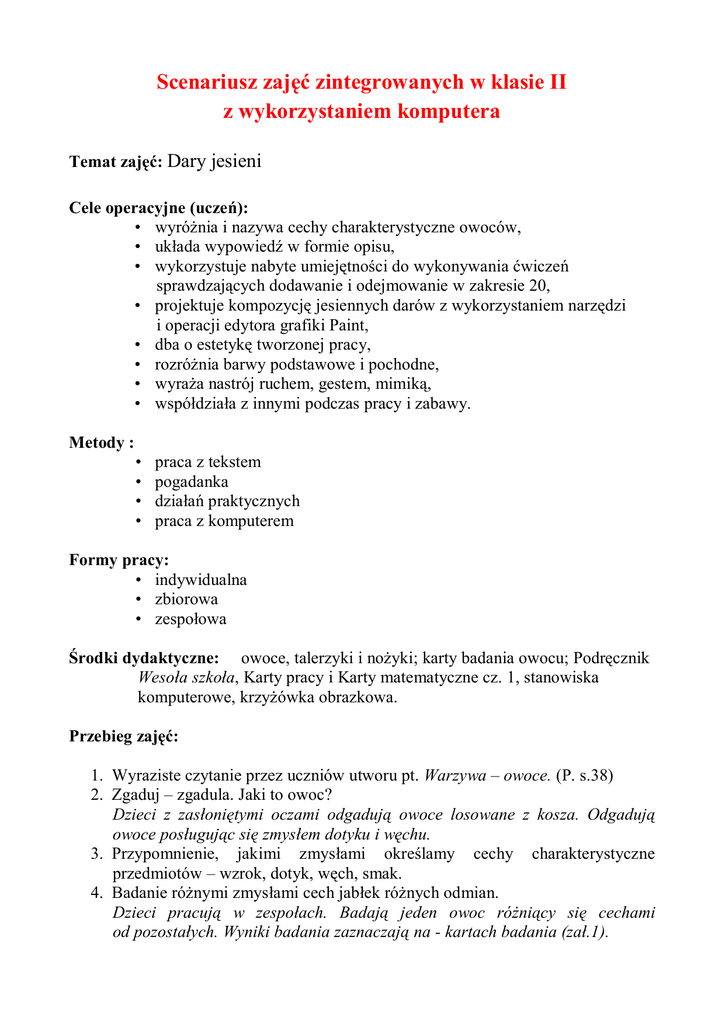 Scenariusz zajęć zintegrowanych w klasie II z wykorzystaniem komputera Temat zajęć: Dary jesieni Cele operacyjne (uczeń): • wyróżnia i nazywa cechy charakterystyczne owoców, • układa wypowiedź w formie opisu, • wykorzystuje nabyte umiejętności do wykonywania ćwiczeń sprawdzających dodawanie i odejmowanie w zakresie 20, • projektuje kompozycję jesiennych darów z wykorzystaniem narzędzi i operacji edytora grafiki Paint, • dba o estetykę tworzonej pracy, • rozróżnia barwy podstawowe i pochodne, • wyraża nastrój ruchem, gestem, mimiką, • współdziała z innymi podczas pracy i zabawy. Metody : • • • • praca z tekstem pogadanka działań praktycznych praca z komputerem Formy pracy: • indywidualna • zbiorowa • zespołowa Środki dydaktyczne: owoce, talerzyki i nożyki; karty badania owocu; Podręcznik Wesoła szkoła, Karty pracy i Karty matematyczne cz. 1, stanowiska komputerowe, krzyżówka obrazkowa. Przebieg zajęć: 1. Wyraziste czytanie przez uczniów utworu pt. Warzywa – owoce. (P. s.38) 2. Zgaduj – zgadula. Jaki to owoc? Dzieci z zasłoniętymi oczami odgadują owoce losowane z kosza. Odgadują owoce posługując się zmysłem dotyku i węchu. 3. Przypomnienie, jakimi zmysłami określamy cechy charakterystyczne przedmiotów – wzrok, dotyk, węch, smak. 4. Badanie różnymi zmysłami cech jabłek różnych odmian. Dzieci pracują w zespołach. Badają jeden owoc różniący się cechami od pozostałych. Wyniki badania zaznaczają na - kartach badania (zał.1). 5. Samodzielne układanie zdań opisujących jabłka. 6. Słuchanie piosenki pt. Jabłka. Wyrażanie nastroju radości ruchem, gestem, mimiką. 7. Sprawdzian – numeracyjne przypadki dodawania i odejmowania liczb w zakresie 20. (K.M. 20) 8. Zestawienie owoców i warzyw z odpowiednimi nazwami kolorów. Otrzymywanie barw pochodnych; zielonej, pomarańczowej, fioletowej. 9. Tworzenie kompozycji owoców z wykorzystaniem narzędzi i operacji edytora grafiki Paint. · Rozwiązanie krzyżówki obrazkowej dotyczącej programu Paint. (zał.2) · Przypomnienie podstawowych wiadomości o edytorze grafiki Paint. · Omówienie najważniejszych elementów okna programu. · Wykonanie ćwiczenia utrwalającego poznane na poprzedniej lekcji operacje dostępne w programie. · Omówienie sposobu wykonania oraz zapisanie na tablicy planu działań. · Samodzielne tworzenie kompozycji i zapisywanie ich na dysku. · Ocena pracy uczniów. 10.Zabawa orientacyjno – porządkowa. Na umówiony kolor dzieci wykonują odpowiednie ćwiczenie. 11.Praca domowa – K.P.32, ćw.3,4 (krzyżówka z hasłem) 12.Podsumowanie dnia i samoocena. Karta badania owocu data nazwa owocu wzrok duże małe malutkie wzrok wzrok podobne czerwone do piłki żółte kuliste średniej wielkości zielone węch dotyk pachnące twarde miękkie bez zapachu czerwonożółte smak podpis badacza słodkie kwaśne chropowate soczyste szorstkie smaczne Karta badania owocu data nazwa owocu wzrok duże małe malutkie średniej wielkości wzrok wzrok podobne czerwone do piłki żółte kuliste zielone czerwonożółte węch dotyk pachnące twarde miękkie bez zapachu smak słodkie kwaśne chropowate soczyste szorstkie smaczne podpis badacza KRZYŻÓWKA OBRAZKOWA 1 2 3 4 5 4 1 5 3 2 Edytor grafiki to na przykład program ............. .