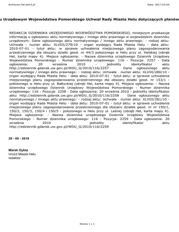 archiwum.hel.sam3.pl Data: 2017-03-04 u Urzędowym Województwa Pomorskiego Uchwał Rady Miasta Helu dotyczących planów REDAKCJA DZIENNIKA URZĘDOWEGO WOJEWÓDZTWA POMORSKIEGO, niniejszym przekazuje informację o ogłoszeniu aktu normatywnego / innego aktu prawnego w wojewódzkim dzienniku urzędowym: Dane ogłoszonego aktu normatywnego / innego aktu prawnego: - rodzaj aktu: Uchwała - numer aktu: XLVIII/279/10 - organ wydający Rada Miasta Helu - data aktu: 2010-07-01 - tytuł aktu: w sprawie uchwalenia miejscowego planu zagospodarowania przestrzennego dla obszaru działki geod. nr 44/3 położonego w Helu przy ul. Helskiej (obręb Hel, karta mapy 4). Miejsce ogłoszenia: - Nazwa dziennika urzędowego Dziennik Urzędowy Województwa Pomorskiego - Numer dziennika urzędowego: 116 - Pozycja: 2257 - Data ogłoszenia: 20 września 2010 jednolity identyfikator aktu http://edziennik.gdansk.uw.gov.pl/WDU_G/2010/116/2257 Dane ogłoszonego aktu normatywnego / innego aktu prawnego: - rodzaj aktu: Uchwała - numer aktu: XLVIII/280/10 organ wydający Rada Miasta Helu - data aktu: 2010-07-01 - tytuł aktu: w sprawie uchwalenia miejscowego planu zagospodarowania przestrzennego dla obszaru działki geod. nr 153/1 położonego w Helu przy ul. Bałtyckiej (obręb Hel, karta mapy 4). Miejsce ogłoszenia: - Nazwa dziennika urzędowego Dziennik Urzędowy Województwa Pomorskiego - Numer dziennika urzędowego: 116 - Pozycja: 2258 - Data ogłoszenia: 20 września 2010 - jednolity identyfikator aktu http://edziennik.gdansk.uw.gov.pl/WDU_G/2010/116/2258 Dane ogłoszonego aktu normatywnego / innego aktu prawnego: - rodzaj aktu: Uchwała - numer aktu: XLVIII/281/10 organ wydający Rada Miasta Helu - data aktu: 2010-07-01 - tytuł aktu: w sprawie uchwalenia miejscowego planu zagospodarowania przestrzennego dla obszaru działek geod. nr nr 150/1, 150/2, 150/3, 150/4 i 150/5 - położonego w Helu przy ul. Leśnej (obręb Hel, karta mapy 4). Miejsce ogłoszenia: - Nazwa dziennika urzędowego Dziennik Urzędowy Województwa Pomorskiego - Numer dziennika urzędowego: 116 - Pozycja: 2259 - Data ogłoszenia: 20 września 2010 jednolity identyfikator aktu http://edziennik.gdansk.uw.gov.pl/WDU_G/2010/116/2259 29 - 09 - 2010 Marek Dykta Urz±d Miasta Helu redaktor Strona 1 z 1