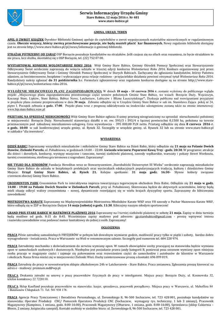Serwis Informacyjny Urzędu Gminy Stare Babice, 12 maja 2016 r. Nr 481 www.stare-babice.pl GMINA, URZĄD, TEREN APEL O ZWROT KSIĄŻEK Dyrektor Biblioteki Gminnej apeluje do czytelników o zwrot wypożyczonych materiałów niezwróconych w regulaminowym czasie. Obecnie wszyscy, którzy zwrócą przechowywane pozycje, nie będą musieli płacić kar finansowych. Nowy regulamin biblioteki dostępny jest na stronie http://www.stare-babice.pl/pl/news/informacje-z-gminnej-biblioteki. STRAŻAK POTRZEBNY OD ZARAZ OSP Borzęcin poszukuje kandydatów na strażaków. Jeśli czujesz się na siłach oraz rozumiesz, że bycie strażakiem to nie praca, lecz służba, skontaktuj się z OSP Borzęcin, tel. (22) 752 07 00. WYSTARTOWAŁ KONKURS WOLONTARIUSZ ROKU 2016 Wójt Gminy Stare Babice, Gminny Ośrodek Pomocy Społecznej oraz Stowarzyszenie Odkrywamy Świat serdecznie zapraszają do wzięcia udziału w trzeciej edycji konkursu Wolontariusz Roku 2016. Konkurs organizowany jest przez Stowarzyszenie Odkrywamy Świat i Gminny Ośrodek Pomocy Społecznej w Starych Babicach. Zachęcamy do zgłaszania kandydatów, którzy Państwa zdaniem, za bezinteresowne, bezpłatne i wykraczające poza relacje rodzinno - przyjacielskie działania powinni otrzymać tytuł Wolontariusz Roku 2016. Kandydatury należy zgłaszać do 31 października b.r. Formularz zgłoszeniowy oraz regulamin konkursu dostępne są na stronie http://www.starebabice.pl/pl/news/wolontariusz-roku-2016. WYŁOŻENIE MIEJSCOWEGO PLANU ZAGOSPODAROWANIA W dniach 18 maja - 14 czerwca 2016 r. zostanie wyłożony do publicznego wglądu projekt „Miejscowego planu zagospodarowania przestrzennego części terenów położonych Gminie Stare Babice, we wsiach: Borzęcin Duży, Wojcieszyn, Koczargi Stare, Lipków, Stare Babice, Babice Nowe, Latchorzew, Lubiczów i Blizne Łaszczyńskiego”. Dyskusja publiczna nad rozwiązaniami przyjętymi w projekcie planu zostanie przeprowadzona w dniu 30 maja. Zebranie odbędzie się w Urzędzie Gminy Stare Babice w sali im. Stanisława Zająca pokój nr 24, piętro I. Początek zebrania o godz. 17:00. Projekt planu wraz z prognozą oddziaływania na środowisko udostępnione zostaną także na stronie internetowej: www.bip.stare-babice.waw.pl PRZETARG NA SPRZEDAŻ NIERUCHOMOŚCI Wójt Gminy Stare Babice ogłasza II ustny przetarg nieograniczony na sprzedaż nieruchomości położonej w miejscowości Borzęcin Duży. Nieruchomość stanowiąca działki o nr. ew. 593/3 i 593/4 o łącznej powierzchni 0,1500 ha, położona na terenie przeznaczonym pod zabudowę mieszkaniowo-usługową. Cena wywoławcza - 395 000,00 PLN netto. Przetarg odbędzie się dnia 8 czerwca 2016 r. o godz. 10:00 w sali konferencyjnej urzędu gminy, ul. Rynek 32. Szczegóły w urzędzie gminy, ul. Ryunek 32 lub na stronie www.stare-babice.pl w zakładce "dla inwestora". WYDARZENIA DZIEŃ BABIC! Zapraszamy wszystkich mieszkańców i miłośników Gminy Stare Babice na Dzień Babic, który odbędzie się 21 maja na Polanie Dwóch Stawów, Zielonki Parcela, ul. Południowa, w godzinach 14:00 – 22:00. Gwiazda wieczoru: Poparzeni Kawą Trzy - godz. 20:30. W programie: atrakcje dla dzieci i dorosłych, konkursy, występy muzyczne i taneczne, turniej siatkówki plażowej, zawody wędkarskie, warszaty i pokazy Street Workoutu, turniej crossmintona, strefowa gra terenowa z nagrodami. Zapraszamy! NIE TYLKO DLA SENIORÓW Fundacja Hereditas wraz ze Stowarzyszeniem „Starobabicki Uniwersytet III Wieku” serdecznie zapraszają mieszkańców Gminy Stare Babice do udziału w bezpłatnych prelekcjach oraz wycieczkach edukacyjnych popularyzujących tradycję, kulturę i dziedzictwo Gminy Miejsce: Urząd Gminy Stare Babice, ul. Rynek 21. Kolejne spotkanie: 31 maja godz. 16:30– Słynne kobiety związane z terenem obecnej Gminy Stare Babice. CROSSMINTON PARK Crossminton Park to interaktywna impreza towarzysząca tegorocznym obchodom Dnia Babic. Odbędzie się 21 maja w godz. 14:00 - 19:00 na Polanie Dwóch Stawów w Zielonkach Parceli, przy ul. Południowej. Skierowana będzie do aktywnych uczestników, którzy będą mieli okazję odkryć walory crossmintona – nowej, dynamicznie rozwijającej się w wielu krajach dyscypliny sportu. Zapraszamy do kibicowania zawodnikom! MISTRZOSTWA KARATE Zapraszamy na Międzywojewódzkie Mistrzostwa Młodzików Karate WKF oraz VII zawody o Puchar Mazowsza Karate WKF, które odbędą się w ZSP w Borzęcinie Dużym 14 maja (sobota) o godz. 11:30. Kibicujmy naszym młodym sportowcom! GRAND PRIX STARE BABICE W SIATKÓWCE PLAŻOWEJ 2016 Zapraszamy na I turniej siatkówki plażowej w sobotę 21 maja. Zapisy w dniu turnieju będą możliwe od godz. 8:15 do 8:45. Wcześniejsze zapisy mailowo pod adresem: [email protected] - proszę wpisywać imiona i nazwiska zawodników oraz podawać numer kontaktowy do jednej z osób. Zapraszamy! OGŁOSZENIA PRACA Pilnie zatrudnię samodzielnych FRYZJERÓW w pełnym lub dowolnym wymiarze godzin, możliwość pracy tylko w piątki i soboty, bardzo dobre wynagrodzenie - świadczenia. Praca w Warszawie na Woli w renomowanym salonie. Szczegóły pod numerem tel. 604 228 974. PRACA Zatrudnimy mechanika z doświadczeniem do serwisu wymiany opon. W ramach obowiązków osoby pracującej na stanowisku będzie wymiana opon w samochodach osobowych i dostawczych. Niezbędne jest posiadanie prawa jazdy kategorii B, ponieważ poza sezonem wymiany opon niniejsza osoba pracuje w magazynie części i zajmuje się pakowaniem oraz rozwożeniem części do samochodów i autobusów do klientów w Warszawie i okolicach. Nasza firma mieści się w miejscowości Zielonki Wieś. Osoby zainteresowane proszę o kontakt: 696 099 019. PRACA Zatrudnię do pracy w nowootwartym sklepie alkoholowym 24h w Latchorzewie - Stare Babice. Praca zmianowa. Zgłoszenia proszę kierować na adres e - mailowy: [email protected]. PRACA Drukarnia zatrudni na umowę o pracę pracowników fizycznych do pracy w introligatorni. Miejsce pracy: Bor