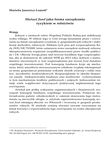 Mutual fund jako forma zarządzania ryzykiem w rolnictwie