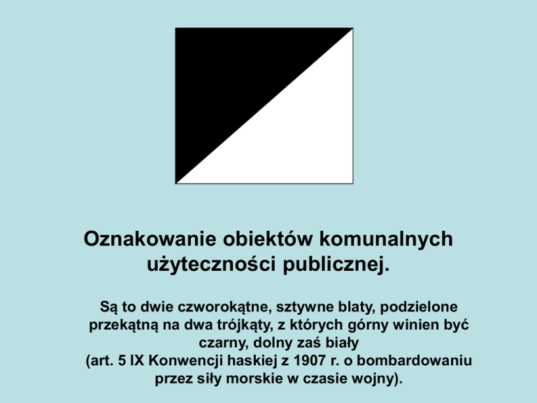 Oznakowanie obiektów komunalnych użyteczności publicznej. Są to dwie czworokątne, sztywne blaty, podzielone przekątną na dwa trójkąty, z których górny winien być czarny, dolny zaś biały (art. 5 IX Konwencji haskiej z 1907 r. o bombardowaniu przez siły morskie w czasie wojny). Znak ochrony dóbr kultury Na podstawie Traktatu o ochronie instytucji artystycznych i naukowych oraz zabytków historycznych z 15.04.1935 r. Znak ochrony dóbr kultury objętych ochroną ogólną. Tarcza skierowana ostrzem w dół, podzielona wzdłuż przekątnych na cztery pola, dwa błękitne i dwa białe (tarcza herbowa złożona z błękitnego kwadratu, którego jeden z kątów tworzy ostrze tarczy, oraz umieszczonego nad nim błękitnego trójkąta, rozgraniczonych po każdej stronie białym trójkątem) (art. 12 KH z 1954 r.) Znak ochrony dóbr kultury objętych ochroną specjalną. Tarcza skierowana ostrzem w dół w układzie potrójnym. Znak rozpoznawczy w układzie potrójnym może być używany jedynie do identyfikacji: - dóbr kulturalnych nieruchomych korzystających z ochrony specjalnej; - transportów dóbr kulturalnych w warunkach określonych w art. 12 i 13 KH z 1954; - schronów zaimprowizowanych w warunkach określonych w Regulaminie Wykonawczym. (art. 12 KH z 1954 r.) Znaki rozpoznawcze stowarzyszeń pomocy Znak rozpoznawczy (czerwony na białym tle) powinien być tak duży, jak wymagają tego okoliczności. W nocy lub gdy widoczność jest ograniczona, znak rozpoznawczy może być świetlny lub oświetlony, może on też być wykonany z materiałów czyniących go rozpoznawalnym, kiedy stosuje się techniczne środki wykrywania. Znak rozpoznawczy powinien w miarę możliwości być umieszczony na flagach lub na powierzchni płaskiej, widocznych ze wszystkich kierunków i jak największej odległości (art. 3 i 4 załącznik I do PD I). Znak ochrony sanitarnej w byłym ZSRR Znak ochrony sanitarnej w Izraelu Znak oznakowania obrzeży stref sanitarnych i bezpieczeństwa art. 6 – projektu układu w sprawie stref i miejscowości sanitarnych i bezpieczeństwa – załącznik I do IV KG z 1949 r. Międzynarodowy znak rozpoznawczy obrony cywilnej Składa się z równobocznego niebieskiego trójkąta na pomarańczowym tle. Jest stosowany do ochrony organizacji obrony cywilnej, ich budynków, personelu i materiałów albo do ochrony schronów cywilnych (art. 66 ust. 4 PDI). Zgodnie z przepisami prawa humanitarnego zaleca się, aby tło trójkąta stanowiły flaga, opaska lub odzież w kolorze pomarańczowym. Jeden z kątów trójkąta powinien być skierowany pionowo ku górze. Ponadto żaden z rogów trójkąta nie może dotykać skraju pomarańczowego tła. Międzynarodowy znak rozpoznawczy obrony cywilnej powinien być tak duży, jak wymagają tego okoliczności. Jeżeli to jest możliwe, powinien on być umieszczony na płaskich powierzchniach lub na flagach widocznych ze wszystkich kierunków i z jak najdalszej odległości. W nocy lub gdy widoczność jest zmniejszona, znak może być świetlny lub oświetlony; może on też być wykonany z materiałów czyniących go rozpoznawalnym, kiedy zastosuje się techniczne środki wykrywania. (art. 15 załącznik I do PD I). Międzynarodowy znak specjalny dla budowli i urządzeń zawierających niebezpieczne siły (art. 56 ust. 7 PDI) Międzynarodowy znak specjalny dla budowli i urządzeń zawierających niebezpieczne siły składa się z trzech jasnopomarańczowych kół o jednakowych wymiarach, umieszczonych na jednej osi. Odległość między kołami równa jest ich promieniowi. Odległość między zewnętrznymi granicami a skrajem flagi powinna być równa promieniowi koła. Flaga powinna być czworokątna i mieć białe tło. Znak powinien być tak duży, jak wymagają tego okoliczności. W miarę możliwości powinien on być umieszczony na flagach lub powierzchniach płaskich w taki sposób, aby był widoczny ze wszystkich kierunków i z jak najdalszej odległości. W nocy lub gdy widoczność jest zmniejszona, znak może być świetlny lub oświetlony. Może on też być wykonany z materiałów czyniących go rozpoznawalnym, kiedy zastosuje się techniczne środki wykrywania (art. 16 załącznik I do PD I). Artykuł 1 – Znak rozpoznawczy Artykuł 2 – Użycie informacyjne znaku Trzeciego Protokołu Wpisanie zgodnie z art. 3 Protokół dodatkowy III z 2005 Artykuł 2 ustęp 2, artykuł 3 ustęp 1 Protokołu