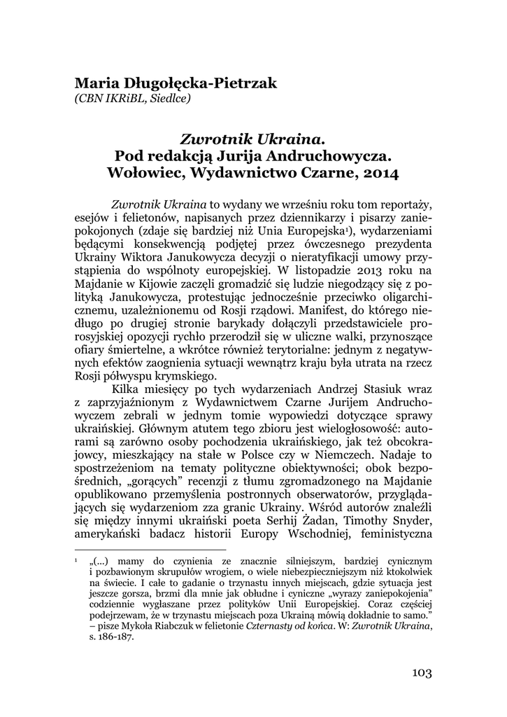 Maria Długołęcka-Pietrzak (CBN IKRiBL, Siedlce) Zwrotnik Ukraina. Pod redakcją Jurija Andruchowycza. Wołowiec, Wydawnictwo Czarne, 2014 Zwrotnik Ukraina to wydany we wrześniu roku tom reportaży, esejów i felietonów, napisanych przez dziennikarzy i pisarzy zaniepokojonych (zdaje się bardziej niż Unia Europejska1), wydarzeniami będącymi konsekwencją podjętej przez ówczesnego prezydenta Ukrainy Wiktora Janukowycza decyzji o nieratyfikacji umowy przystąpienia do wspólnoty europejskiej. W listopadzie 2013 roku na Majdanie w Kijowie zaczęli gromadzić się ludzie niegodzący się z polityką Janukowycza, protestując jednocześnie przeciwko oligarchicznemu, uzależnionemu od Rosji rządowi. Manifest, do którego niedługo po drugiej stronie barykady dołączyli przedstawiciele prorosyjskiej opozycji rychło przerodził się w uliczne walki, przynoszące ofiary śmiertelne, a wkrótce również terytorialne: jednym z negatywnych efektów zaognienia sytuacji wewnątrz kraju była utrata na rzecz Rosji półwyspu krymskiego. Kilka miesięcy po tych wydarzeniach Andrzej Stasiuk wraz z zaprzyjaźnionym z Wydawnictwem Czarne Jurijem Andruchowyczem zebrali w jednym tomie wypowiedzi dotyczące sprawy ukraińskiej. Głównym atutem tego zbioru jest wielogłosowość: autorami są zarówno osoby pochodzenia ukraińskiego, jak też obcokrajowcy, mieszkający na stałe w Polsce czy w Niemczech. Nadaje to spostrzeżeniom na tematy polityczne obiektywności; obok bezpośrednich, „gorących” recenzji z tłumu zgromadzonego na Majdanie opublikowano przemyślenia postronnych obserwatorów, przyglądających się wydarzeniom zza granic Ukrainy. Wśród autorów znaleźli się między innymi ukraiński poeta Serhij Żadan, Timothy Snyder, amerykański badacz historii Europy Wschodniej, feministyczna 1 „(...) mamy do czynienia ze znacznie silniejszym, bardziej cynicznym i pozbawionym skrupułów wrogiem, o wiele niebezpieczniejszym niż ktokolwiek na świecie. I całe to gadanie o trzynastu innych miejscach, gdzie sytuacja jest jeszcze gorsza, brzmi dla mnie jak obłudne i cyniczne „wyrazy zaniepokojenia” codziennie wygłaszane przez polityków Unii Europejskiej. Coraz częściej podejrzewam, że w trzynastu miejscach poza Ukrainą mówią dokładnie to samo.” – pisze Mykoła Riabczuk w felietonie Czternasty od końca. W: Zwrotnik Ukraina, s. 186-187. 103 działaczka Jewgienija Biełorusiec, ukraiński germanista Jurko Prochaśko, moguncki historyk Wilfried Jilge, Martin Pollack, znany w Polsce austriacki eseista i tłumacz, i wiele innych wybitnych osobistości świata nauki i literatury, wśród nich także Andrzej Stasiuk i Jurij Andruchowycz. Opisy wyglądu Majdanu („Łańcuch z namiotów i małych drewnianych fortów, pałace ze śmieci i lodu, parujące beczki otoczone przez mężczyzn w moro, stosy drewna, worki, sterty ciepłej odzieży i prawdziwe cudo, wysoka na cztery metry barykada na ulicy Proresnej.2”– w eseju Mój Kijów pisze Katia Petrowska) sąsiadują tu zatem z reportażami z życia codziennego protestujących i politycznymi, dalekosiężnymi wypowiedziami historyków, szukających odpowiedzi na pytania o przyczyny – i późniejsze skutki wydarzeń w Kijowie. Zagraniczni obserwatorzy ubolewają nad brakiem jednolitości w dostarczanych z Ukrainy informacjach, winą za taki stan rzeczy obarczając rosyjską propagandę dominującą przepływ wiadomości: „Od Moskwy, przez Londyn, po Nowy Jork patrzy się na rewolucję ukraińską przez mgłę propagandy. Przywódcy Rosji i rosyjska prasa z uporem twierdzą, że ukraińscy demonstranci to prawicowi ekstremiści, a ich zwycięstwo było zamachem stanu. (…) W rzeczywistości mieliśmy do czynienia z klasyczną rewolucją ludową. 3” – pisze Timothy Snyder. Ciekawym aspektem socjologicznym, obecnym w niemal wszystkich felietonach, jest podkreślenie znaczenia mediów społecznościowych, dzięki którym informacje mogły szybko i bezpośrednio docierać do grup odbiorczych. Oczy-wiście, stwarzały one doskonałe pole do wspomnianych przez Snydera manipulacji, jednak nie można nie podkreślić, że cała rewolucja rozpoczęła się od napisanego przez ukraińskiego dziennikarza Mustafę Najema postu na popularnym portalu: „Idę na Majdan. Kto idzie ze mną?”. Tania Malarczuk skomentowała ironicznie ten fakt w swoim felietonie Jest nas wielu: „Ostatki wolności przeniosły się do Internetu i na Facebook'a4”. We wszystkich esejach widać niepokój o przyszłość Ukrainy, zarówno jako suwerennego państwa, jak też potencjalnego członka Unijnej jedności, w każdym z nich przejawia się także rozczarowanie brakiem jednoznacznego stanowiska Europy wobec sprawy Ukrainskiej: „(...) ukraińska rewolucja i inwazja wojsk rosyjskich tuż po niej przyniosły ponownie trudne i niechętnie zadawane pytanie o zaangażowanie Zachodu w kwestie globalne (...)” stwierdza Mykoła Ria2 3 4 Tamże, s. 45. T. Snyder: Przez mgłę propagandy. Tamże, s. 153. T. Malarczuk: Jest nas wielu. Tamże, s. 102. 104 bczuk. Jednocześnie pada niewypowiedziane pytanie o przyszłość Ukrainy jako państwa, zagrożonego wówczas atakami ze strony rosyskiej. Z perspektywy czasu już wiadomo, że Rosja wkrótce zaanektowała Krym, i że na terenie Ukrainy nadal toczone się walki z użyciem ciężkozbrojnego sprzętu. Do września 2014 roku mówi się o ponad 900 poległych żołnierzach ukraińskich i dwukrotnie większej liczbie zabitych cywilów5. Zbiór Zwrotnik Ukraina jest aktualnie jedną z najważnijszych pozycji historycznych obrazujących obecną polityczną rzeczywistość na świecie. Pozwala zrozumieć i zobaczyć więcej, niż pokazują telewizyjne czy internetowe wiadomości. Różnorodność stanowisk, prezentowanych przez autorów umożliwia stworzenie własnego poglądu na do dziś niespokojną sytuację Ukrainy, a przede wszystkim umacnia współczucie wobec ludzi z kraju, który znalazł się w tak