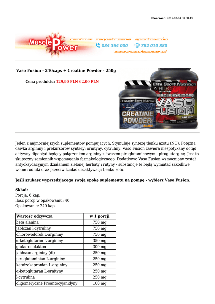 Utworzono: 2017-03-04 00:38:43 Vaso Fusion - 240caps + Creatine Powder - 250g Cena produktu: 129,90 PLN 62,00 PLN Jeden z najmocniejszych suplementów pompujących. Stymuluje syntezę tlenku azotu (NO). Potężna dawka argininy i prekursorów syntezy: ornityny, cytruliny. Vaso Fusion zawiera niespotykany dotąd aktywny dipeptyd będący połączeniem argininy z kwasem piroglutaminowym - piroglutarginę. Jest to skuteczny zamiennik wspomagania farmakologicznego. Dodatkowo Vaso Fusion wzmocniony został antyoksydacyjnym działaniem zielonej herbaty i rutyny - substancje te będą wymiatać szkodliwe wolne rodniki oraz przeciwdziałać dezaktywacji tlenku zotu. Jeśli szukasz wyprzedzjącego swoją epokę suplementu na pompę - wybierz Vaso Fusion. Skład: Porcja: 6 kap. Ilośc porcji w opakowaniu: 40 Opakowanie: 240 kap. Wartośc odżywcza w 1 porcji beta alanina 750 mg jabłczan l-cytruliny 750 mg chlorowodorek L-argininy 750 mg α-ketoglutaran L-argininy 350 mg glukuronolakton 300 mg jabłczan argininy (di) 250 mg piroglutaminian L-argininy 250 mg ketoizokapronian L-argininy 250 mg α-ketoglutaran L-ornityny 250 mg l-cytrulina 250 mg oligomeryczne Proantocyjanidyny 100 mg kwas galusowy epigalokatechiny (EGCG) pochodzący z ekstraktu zielonej herbaty 100 mg rutyna 50 mg Dawkowanie: 6 kapsułek dziennie - przed treningiem, rano na czczo, pomiędzy posiłkami. Creatine Powder - 250g Creatine Powder to 100% czysty monohydrat kreatyny w formie łatwo rozpuszczalnego proszku, wzbogacony o witaminy z grupy B, niezbędne w prawidłowym przebiegu procesów metabolicznych przy zwiększonym wysiłku fizycznym. Skład: Porcja: 3 g Porcji w opakowaniu: 83 Opakowanie: 250 g Wartość odżywcza Monohydrat kreatyny w 1 porcji 3000mg Witamina B6 1,4mg Witamina B12 2,5µg Dawkowanie: Dla uzyskania jednej porcji napoju, wymieszać jedną łyżeczkę do herbaty (5 g) kreatyny z sokiem owocowym lub wodą. HI TEC - Vaso Fusion - 240caps Ilość Adres: http://www.muscle.trustnet.pl/ 250 g Telefon: 34 36 43 000, 782 010 880 Email: [email protected]