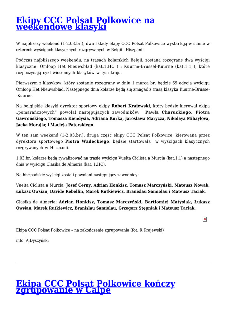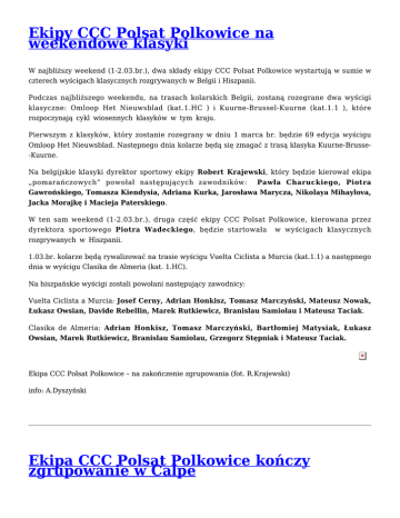 Ekipy CCC Polsat Polkowice na weekendowe klasyki W najbliższy weekend (1-2.03.br.), dwa składy ekipy CCC Polsat Polkowice wystartują w sumie w czterech wyścigach klasycznych rozgrywanych w Belgii i Hiszpanii. Podczas najbliższego weekendu, na trasach kolarskich Belgii, zostaną rozegrane dwa wyścigi klasyczne: Omloop Het Nieuwsblad (kat.1.HC ) i Kuurne-Brussel-Kuurne (kat.1.1 ), które rozpoczynają cykl wiosennych klasyków w tym kraju. Pierwszym z klasyków, który zostanie rozegrany w dniu 1 marca br. będzie 69 edycja wyścigu Omloop Het Nieuwsblad. Następnego dnia kolarze będą się zmagać z trasą klasyka Kuurne-Brusse-Kuurne. Na belgijskie klasyki dyrektor sportowy ekipy Robert Krajewski, który będzie kierował ekipa „pomarańczowych” powołał następujących zawodników: Pawła Charuckiego, Piotra Gawrońskiego, Tomasza Kiendysia, Adriana Kurka, Jarosława Marycza, Nikolaya Mihaylova, Jacka Morajkę i Macieja Paterskiego. W ten sam weekend (1-2.03.br.), druga część ekipy CCC Polsat Polkowice, kierowana przez dyrektora sportowego Piotra Wadeckiego, będzie startowała w wyścigach klasycznych rozgrywanych w Hiszpanii. 1.03.br. kolarze będą rywalizować na trasie wyścigu Vuelta Ciclista a Murcia (kat.1.1) a następnego dnia w wyścigu Clasika de Almeria (kat. 1.HC). Na hiszpańskie wyścigi zostali powołani następujący zawodnicy: Vuelta Ciclista a Murcia: Josef Cerny, Adrian Honkisz, Tomasz Marczyński, Mateusz Nowak, Łukasz Owsian, Davide Rebellin, Marek Rutkiewicz, Branislau Samiolau i Mateusz Taciak. Clasika de Almeria: Adrian Honkisz, Tomasz Marczyński, Bartłomiej Matysiak, Łukasz Owsian, Marek Rutkiewicz, Branislau Samiolau, Grzegorz Stępniak i Mateusz Taciak. Ekipa CCC Polsat Polkowice – na zakończenie zgrupowania (fot. R.Krajewski) info: A.Dyszyński Ekipa CCC Polsat Polkowice kończy zgrupowanie w Calpe Dobiega końca zgrupowanie kolarzy CCC Polsat Polkowice w hiszpańskim Calpe. Po dwóch miesiącach przygotowań do sezonu 2014 oraz pierwszych startach, kolarze wracają do kraju. Od 13.01.br. ekipa CCC Polsat Polkowice przebywa w Calpe, gdzie ciągle trwają przygotowania do sezonu kolarskiego 2014, gdzie przeprowadzane są specjalistyczne cykle treningowe a także kolarze budują niezbędną bazę kilometrową. Dla dużej części kolarzy ekipy „pomarańczowych” sezon kolarski rozpoczął się już w początkach lutego. Ekipa CCC Polsat Polkowice rozpoczęła go startem w francuskiej jednodniówce Grand Prix la Marsaillaise (02.02.br.). Kolarze maja za sobą również starty w trzech wyścigach etapowych: Etoile de Bessèges, Tour Méditerranéen i Vuelta a Andalucia Ruta Ciclista Del Sol. Program zgrupowania jaki przyjęliśmy przed rozpoczęciem sezonu przebiega według założonego planu – informuje dyrektor ekipy Robert Krajewski. Wszystkie plany treningowe realizowane są w 100%, i myślę, że każdy z zawodników miał możliwość jak najlepiej przygotować się do sezonu. Podczas samych przygotowań w Hiszpanii zawodnikom nie brakowało niczego. Większość zawodników w tym roku miała już możliwość sprawdzenia swojej dyspozycji podczas pierwszych startów we Francji i Hiszpanii. Natomiast kilku zawodników ekipy: Josef Cerny, Łukasz Nowak czy Paweł Charucki rozpocznie sezon w nadchodzący weekend. Będą to ich pierwsze w tym roku starty i myślę, że każdy z nich jest ciekaw jaka jest ich obecna dyspozycja w porównaniu z rokiem poprzednim. Najbliższe wyścigi pokarzą jak przepracowali okres zimowy. Atmosfera w zespole bardzo dobra. Przez prawie dwa miesiące pobytu w Calpe zespół i nowi jego zawodnicy na dobre się zintegrowali. Nikt z kolarzy nie uskarża się na jakieś większe dolegliwości, wszyscy gotowi są na kolejne starty. Po weekendowych startach ekipy w Hiszpanii i Belgii, cały zespół wraca do kraju – zakończył Robert Krajewski. W najbliższy weekend, 1-2.03.br. kolarze ekipy CCC Polsat Polkowice wezmą udział w wyścigach: 1.03 – Vuelta Ciclista a Murcia (kat.1.1) Hiszpania 1.03 – Omloop Het Nieuwsblad (kat.1.HC ) Belgia 2.03 – Kuurne-Brussel-Kuurne (kat.1.1 ) Belgia 2.03 – Clasika de Almeria (kat. 1.HC) Hiszpania info: A.Dyszyński Ruta del Sol: Moreno Hofland wygrywa ostatni etap. Honkisz w ucieczce dnia Ostatni etap wyścigu Vuelta Andalucia Ruta del Sol wygrał Moreno Hofland (Belkin). Na mecie w Fuengirola pokonał Nikiasa Arndta (Giant Shimano) i Kennetha Van Bilsena (Topsport Vlaanderen). Zwycięzca wyścigu został Alejandro Valverde (Movistar). Czwarty etap hiszpańskiej etapówki drogami Andaluzji prowadził z Ubrique do Fuengirola. Kolarze mieli do pokonania trasę długości 159, 8 kilometrów po dość mocno pofałdowanym terenie. Po drodze do mety etapu musieli pokonać trzy górskie premie. Zaraz po starcie, rozpoczęli wspinaczkę na pierwszą z górskich premii kat.1. Dwie pozostałe górskie premie kat.3 znajdowały się na 80 i 100 kilometrze trasy. Na podjeździe pod premię 1. kategorii z peletonu zaatakował grupka wytrawnych „górali” a wśród nich znalazł się również Adrian Honkisz (CCC Polsat Polkowice). W dziewięcioosobowej ucieczce byli również: Laurens Ten Dam (Belkin), Jakob Fuglsang (Astana), Linus Gerdemann (MTN), Tim Wellens (Lotto), Amets Txurruka (Caja Rural), Tom Dumoulin (Giant-Shimano), Javier Megías (Novo Nordisk) i Julian Arredondo (Trek). Przewaga uciekającej grupy oscylowała w granicach 3 minut a ekipa lidera, Movistar bardzo skrupulatnie kontrolowała przebieg rywalizacji na trasie tego ostatniego etapu. Po pokonaniu ostatniej górskiej premii przewaga zaczęła gwałtownie się zmniejszać a z ucieczki zaatakował Tom Dumoulin (Giant-Shimano) i rozpoczął samotną jazdę. Pozostali kolarze ucieczki sukcesywnie byli kasowani przez rozpędzony peleton. Tom Dumoulin został złapany przez peleton na 7 km do mety. Na ostatnich kilometrach trasy peleton się połączył i o etapowym zwycięstwie zdecydował zmasowany finisz. P