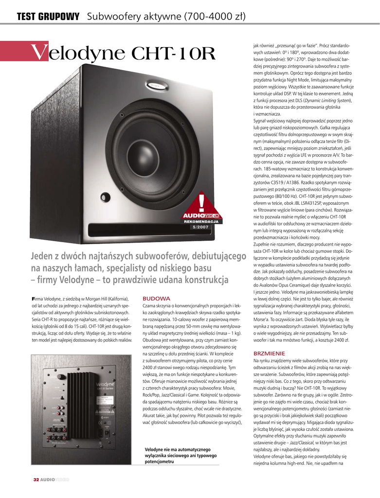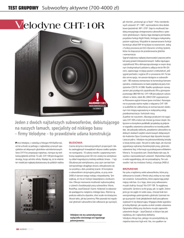TEST GRUPOWY Subwoofery aktywne (700-4000 z∏) Velodyne CHT-10R 5/2007 Jeden z dwóch najtaƒszych subwooferów, debiutujàcego na naszych ∏amach, specjalisty od niskiego basu – firmy Velodyne – to prawdziwie udana konstrukcja Firma Velodyne, z siedzibà w Morgan Hill (Kalifornia), od lat uchodzi za jednego z najbardziej uznanych specjalistów od aktywnych g∏oÊników subniskotonowych. Seria CHT-R to propozycje najtaƒsze, ró˝niàce si´ wielkoÊcià (g∏oÊniki od 8 do 15 cali). CHT-10R jest drugà konstrukcjà, liczàc od do∏u oferty. Wydaje si´, ˝e to w∏aÊnie ten model jest najlepiej dostosowany do polskich realiów. BUDOWA Czarna skrzynia o konwencjonalnych proporcjach i lekko zaokràglonych kraw´dziach skrywa rzadko spotykane rozwiàzania. 10-calowy woofer z papierowà membranà nap´dzanà przez 50-mm cewk´ ma wentylowany uk∏ad magnetyczny Êredniej wielkoÊci (masa – 1 kg). Obudowa jest wentylowana, przy czym zamiast konwencjonalnego okràg∏ego otworu zdecydowano si´ na szczelin´ u do∏u przedniej Êcianki. W komplecie z subwooferem otrzymujemy pilota, co przy cenie 2400 z∏ stanowi swego rodzaju niespodziank´. Tym wi´kszà, ˝e ma on funkcje niespotykane u konkurentów. Oferuje mianowicie mo˝liwoÊç wybrania jednej z czterech charakterystyk pracy subwoofera: Movie, Rock/Pop, Jazz/Classical i Game. KolejnoÊç ta odpowiada spadajàcemu nat´˝eniu niskiego basu. Ró˝nice sà podczas ods∏uchu s∏yszalne, choç wcale nie drastyczne. Akurat takie, jak byç powinny. Pilot pozwala te˝ regulowaç g∏oÊnoÊç subwoofera (lub ca∏kowicie go wyciszyç), Velodyne nie ma automatycznego wy∏àcznika sieciowego ani typowego potencjometru 32 AUDIOVIDEO jak równie˝ „przesunàç go w fazie”. Prócz standardowych ustawieƒ: 0º i 180º, wprowadzono dwa dodatkowe (poÊrednie): 90º i 270º. Daje to mo˝liwoÊç bardziej precyzyjnego zintegrowania subwoofera z systemem g∏oÊnikowym. Oprócz tego dost´pna jest bardzo przydatna funkcja Night Mode, limitujàca maksymalny poziom wyjÊciowy. Wszystkie te zaawansowane funkcje kontroluje uk∏ad DSP. W tej klasie to ewenement. Jednà z funkcji procesora jest DLS (Dynamic Limiting System), która nie dopuszcza do przesterowania g∏oÊnika i wzmacniacza. Sygna∏ wejÊciowy najlepiej doprowadziç poprzez jedno lub par´ gniazd niskopoziomowych. Ga∏ka regulujàca cz´stotliwoÊç filtru dolnoprzepustowego w swym skrajnym (maksymalnym) po∏o˝eniu od∏àcza ten˝e filtr (Direct), zapewniajàc mniejszy poziom zniekszta∏ceƒ, jeÊli sygna∏ pochodzi z wyjÊcia LFE w procesorze A/V. To bardzo cenna opcja, nie zawsze dost´pna w subwooferach. 185-watowy wzmacniacz to konstrukcja konwencjonalna, zrealizowana na bazie pojedynczej pary tranzystorów C3519 / A1386. Rzadko spotykanym rozwiàzaniem jest prze∏àcznik cz´stotliwoÊci filtru górnoprzepustowego (80/100 Hz). CHT-10R jest jedynym subwooferem w teÊcie, obok JBL LSR4312SP, wyposa˝onym w filtrowane wyjÊcie liniowe (para cinchów). Rozwiàzanie to pozwala realnie myÊleç o w∏àczeniu CHT-10R w audiofilski tor ods∏uchowy ze wzmacniaczem dzielonym lub integrà wyposa˝onà w roz∏àczalnà sekcj´ przedwzmacniacza i koƒcówki mocy. Zupe∏nie nie rozumiem, dlaczego producent nie wyposa˝a CHT-10R w kolce lub chocia˝ gumowe stopki. Do∏àczone w komplecie podk∏adki przydadzà si´ jedynie w wypadku ustawienia subwoofera na twardej pod∏odze. Jak pokaza∏y ods∏uchy, posadzenie subwoofera na dobrych sto˝kach (u˝y∏em aluminiowych do∏àczanych do Avalonów Opus Ceramique) daje s∏yszalne korzyÊci. I jeszcze jedno. Velodyne ma jaskrawoniebieskà lampk´ w lewej dolnej cz´Êci. Nie jest to tylko bajer, ale równie˝ sygnalizacja wybranej charakterystyki pracy, g∏oÊnoÊci, ustawienia fazy. Informacje sà przekazywane alfabetem Morse’a. To oczywiÊcie ˝art. Dioda b∏yska tyle razy, ile wynika z wprowadzonych ustawieƒ. WyÊwietlacz by∏by o wiele wygodniejszy, ale nie przesadzajmy. Ten subwoofer i tak ma mnóstwo funkcji, a kosztuje 2400 z∏. BRZMIENIE Na rynku znajdziemy wiele subwooferów, które przy odtwarzaniu Êcie˝ek z filmów akcji zrobià na nas wi´ksze wra˝enie. Subwooferów, które zapewniajà pot´˝niejszy niski bas. Co z tego, skoro przy odtwarzaniu muzyki dudnià i buczà? Nie CHT-10R. To wyjàtkowy subwoofer. Zarówno na tle grupy, jak i w ogóle. Zestrojenie go nie zaj´∏o mi wiele czasu, chocia˝ brak konwencjonalnego potencjometru g∏oÊnoÊci (zamiast niego sà przyciski i brak jakiejkolwiek skali) poczàtkowo wydawa∏ mi si´ deprymujàcy. Migajàca dioda sygnalizuje liczbà b∏yÊni´ç, jak wysoka czu∏oÊç zosta∏a ustawiona. Optymalne efekty przy s∏uchaniu muzyki zapewni∏o ustawienie drugie – Jazz/Classical, w którym bas jest najs∏abszy, ale i najbardziej dok∏adny. Velodyne oferuje bas, jakiego nie powstydzi∏aby si´ niejedna kolumna high-end. Nie, nie upad∏em na OCENA Dystrybutor Fast tel. 0 12 613 37 50 www.audiofast.pl ok. 2400 z∏ (760 USD) Ceny: Barwa 9/10 ❚ Brzmienie niskich tonów ma sporo wyrafinowania typowego bardziej dla drogich zestawów g∏oÊnikowych ni˝ subwooferów. Rozciàgni´cie pasma 8/10 ❚ Niezbyt spektakularne, choç z pewnoÊcià nie s∏abe. Najni˝sza oktawa Papierowa membrana z piankowym resorem – stare, sprawdzone rozwiàzanie g∏ow´. Twierdz´ tak na podstawie ods∏uchów czysto muzycznych w systemie z∏o˝onym m.in. z du˝ych trójdro˝nych Zollerów Temptation. BezpoÊrednie porównania dêwi´ku z w∏àczonym i wy∏àczonym subwooferem (przy w∏àczonym kolumny pracowa∏y jako ma∏e, odtwarzajàc zakres powy˝ej 110 Hz) ukaza∏y, ˝e bas jest czystszy, mniej rezonansowy ni˝ z samych kolumn. W mojej dotychczasowej praktyce jest to sytuacja nieomal bezprecedensowa. OczywiÊcie winne takiemu stanowi rzeczy jest pomieszczenie, w którym dla konkretnego po∏o˝enia kolumn wyst´pujà okreÊlone mody. Byç mo˝e dzi´ki temu, ˝e