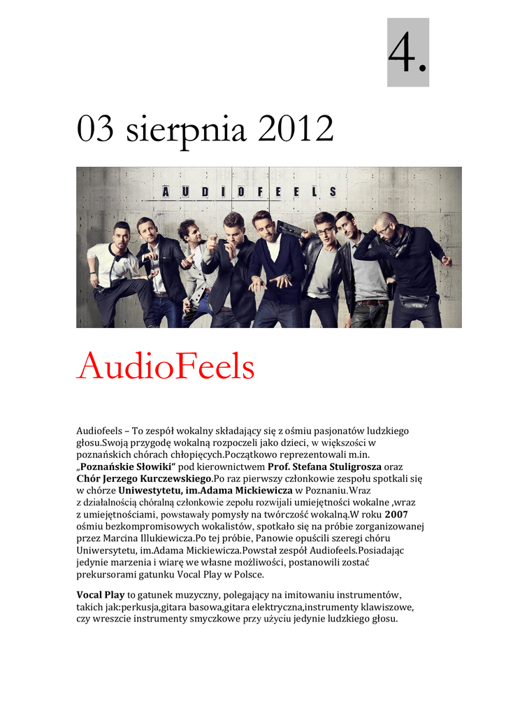 4. 03 sierpnia 2012 AudioFeels Audiofeels – To zespół wokalny składający się z ośmiu pasjonatów ludzkiego głosu.Swoją przygodę wokalną rozpoczeli jako dzieci, w większości w poznańskich chórach chłopięcych.Początkowo reprezentowali m.in. „Poznańskie Słowiki“ pod kierownictwem Prof. Stefana Stuligrosza oraz Chór Jerzego Kurczewskiego.Po raz pierwszy członkowie zespołu spotkali się w chórze Uniwestytetu, im.Adama Mickiewicza w Poznaniu.Wraz z działalnością chóralną członkowie zepołu rozwijali umiejętności wokalne ,wraz z umiejętnościami, powstawały pomysły na twórczość wokalną.W roku 2007 ośmiu bezkompromisowych wokalistów, spotkało się na próbie zorganizowanej przez Marcina Illukiewicza.Po tej próbie, Panowie opuścili szeregi chóru Uniwersytetu, im.Adama Mickiewicza.Powstał zespół Audiofeels.Posiadając jedynie marzenia i wiarę we własne możliwości, postanowili zostać prekursorami gatunku Vocal Play w Polsce. Vocal Play to gatunek muzyczny, polegający na imitowaniu instrumentów, takich jak:perkusja,gitara basowa,gitara elektryczna,instrumenty klawiszowe, czy wreszcie instrumenty smyczkowe przy użyciu jedynie ludzkiego głosu. Rok 2008 Na rynku pojawia się nowy program telewizyjny o nazwie MAM TALENT emitowany w telewizji TVN.Oglądalność sięga 6 mln widzów, i to właśnie występ podczas tego programu okazał się dla zespołu ogromnym komercyjnym sukcesem.Zespół zajął III miejsce występując, w finałowym odcinku programu MAM TALENT.W roku 2008 nastąpił przełom muzyki wokalnej na polskim rynku muzycznym.Vocal Play stał się nowym gatunkiem muzycznym.W Polsce, zapoczątkowanym przez zespół Audiofeels.Marzenia stają się rzeczywistością... Rok 2009 •Status złotej płyty za DEBIUTANCKI album AUDIOFEELS UNCOVERD wydanej nakładem Penguin Records. •Gościnny występ na płycie Caffe Fogg z utworem Mieczysława Fogga „Ja mam czas ja poczekam“ •Trasa koncertowa,jesień 2009 promująca album Uncovered (Teatry,Filharmonie,Opery w całej Polsce) . Rok 2010 •Nominacja w kategorii „ZESPÓŁ ROKU“ oraz występ na 47 KRAJOWYM FETIWALU PIOSENKI POLSKIEJ W OPOLU. •Nominacja do muzycznej nagrody FRYDERYKI w kategorii: „NOWA TWARZ FONOGRAFII“ •Występ podczas pierwszego losowania grup eliminacyjnych do EURO 2012 (emisja w 100 krajach na całym świecie) •Trasa koncertowa „PURE VOCAL PLAY. AT PURE ARTISTIC VENUE” (Teatry,Filharmonie,Opery w całej Polsce) Rok 2011 •Dwa wyróżnienia na konkursie podczas INTERNATINAL A CAPPELLA FESTIVAL IN LEIPZIG w czerwcu 2011.Najwyższe wyróżnienie oraz nagroda publiczności. •Drugia płyta AUDIOFEELS UNFINISHED wydana nakładem Mystic Production. Rok 2012 •Wygrana na festiwalu Sweepsteakes Harmony w Nowym Jorku . Nagranie koncertu DVD w Teatrze Wielkim, im.Stanisława Moniuszki w Pozaniu.Planowana data wydania albumu DVD,Październik 2012. •Pierwszy autorski koncert zespołu w Lipsku w klubie VERK II/Kulturfabrik jako zwycięzca festiwalu INTERNATIONAL A CAPPELLA FESTIVAL IN LEIPZIG 2011. •Zaproszenie na największy festiwal w europie. Polyfollia A cappella Festival, jako gwiazda Festiwalu. Zespół Audiofeels koncertuje,tworzy nowe aranżacje i wciąż się rozwija.Praca oraz nieustająca pasja, pozwala zespołowi Audiofeels osiągać dalsze sukcesy.Każdy koncert prezentuje nieodkryte dotąd możliwości ludzkiego głosu.Dowodem tego są nagrody i zaproszenia na koncerty w Polsce oraz poza granicami. Skład zespołu Audiofeels Marcin "Illuk" Illukiewicz – wokal (tenor II) jako klawisze, wiolonczela, puzon, trąbka Bartek "Źrebak" Lehmann – wokal (tenor I i kontratenor) jako smyki, klawisze, gitara, trąbka Michał "Szajek" Szajkowski – wokal (baryton, tenor) jako smyki, klawisze, gitara Michał "Stecu" Stec – wokal jako wiolonczela, gitara basowa i elektryczna oraz trąbka Jarosław "Karas" Weidner – wokal (baryton) jako skrzypce, gitara elektryczna, klawisze, trąbka; aranżer piosenek wykonywanych przez zespół Marek "Maro" Lewandowski – wokal (baryton) jako gitary, smyki; aranżer piosenek wykonywanych przez zespół; reżyser dźwięku Patryk "Cypis" Ignaczak – wokal (bas) jako gitara basowa i kontrabas Bartek "Kitek" Michalak – wokal, instrumenty perkusyjne, efekty specjalne Zapraszamy na oficjalne strony zespołu Audiofeels. FACEBOOK http://www.facebook.com/audiofeels OFICJALNA STRONA ZESPOŁU http://www.audiofeels.pl/ KANAŁ YOU TUBE http://www.youtube.com/user/AudioFeels