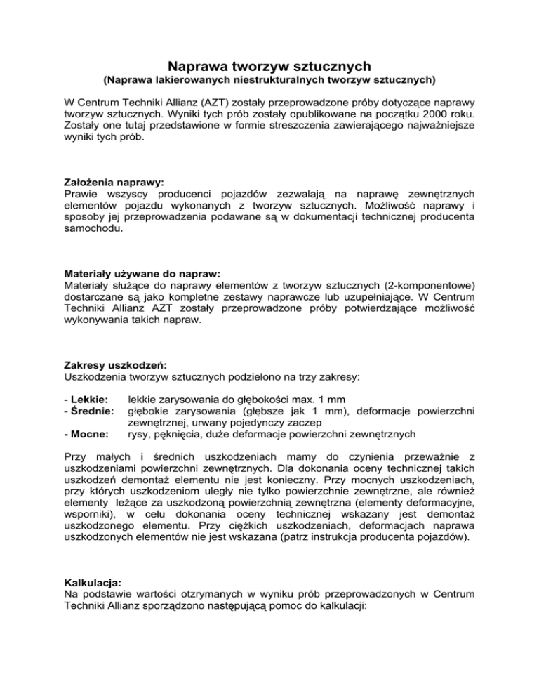Naprawa tworzyw sztucznych (Naprawa lakierowanych niestrukturalnych tworzyw sztucznych) W Centrum Techniki Allianz (AZT) zostały przeprowadzone próby dotyczące naprawy tworzyw sztucznych. Wyniki tych prób zostały opublikowane na początku 2000 roku. Zostały one tutaj przedstawione w formie streszczenia zawierającego najważniejsze wyniki tych prób. Założenia naprawy: Prawie wszyscy producenci pojazdów zezwalają na naprawę zewnętrznych elementów pojazdu wykonanych z tworzyw sztucznych. Możliwość naprawy i sposoby jej przeprowadzenia podawane są w dokumentacji technicznej producenta samochodu. Materiały używane do napraw: Materiały służące do naprawy elementów z tworzyw sztucznych (2-komponentowe) dostarczane są jako kompletne zestawy naprawcze lub uzupełniające. W Centrum Techniki Allianz AZT zostały przeprowadzone próby potwierdzające możliwość wykonywania takich napraw. Zakresy uszkodzeń: Uszkodzenia tworzyw sztucznych podzielono na trzy zakresy: - Lekkie: - Średnie: - Mocne: lekkie zarysowania do głębokości max. 1 mm głębokie zarysowania (głębsze jak 1 mm), deformacje powierzchni zewnętrznej, urwany pojedynczy zaczep rysy, pęknięcia, duże deformacje powierzchni zewnętrznych Przy małych i średnich uszkodzeniach mamy do czynienia przeważnie z uszkodzeniami powierzchni zewnętrznych. Dla dokonania oceny technicznej takich uszkodzeń demontaż elementu nie jest konieczny. Przy mocnych uszkodzeniach, przy których uszkodzeniom uległy nie tylko powierzchnie zewnętrzne, ale również elementy leżące za uszkodzoną powierzchnią zewnętrzna (elementy deformacyjne, wsporniki), w celu dokonania oceny technicznej wskazany jest demontaż uszkodzonego elementu. Przy ciężkich uszkodzeniach, deformacjach naprawa uszkodzonych elementów nie jest wskazana (patrz instrukcja producenta pojazdów). Kalkulacja: Na podstawie wartości otzrymanych w wyniku prób przeprowadzonych w Centrum Techniki Allianz sporządzono następującą pomoc do kalkulacji: Uszkodzenie (patrz obok) Lekkie Średnie Mocne Stopień lak. Eurotax/AZT K3 K3 K3 Dodatek Czas 0.6 rbg 1.1 rbg Materiał 34, -zł 68, -zł K3 (naprawa lakiernicza) Czas naprawy Dodatek Koszty materiałów Lekkie uszkodzenie odpowiada lakierowaniu elementu w stopniu lakierowania K3. Poziom uszkodzenia „średni” i „mocny” wymaga uwzględnienia w kalkulacji dodatkowych czasów naprawy i kosztów materiałów zawartych w podanej tabeli. Podstawowym kryterium wyboru lub zaniechania naprawy jest poziom ceny nowego elementu. Wartości podane w tabeli będą każdorazowo kontrolowane i urealniane do sytuacji na rynku. Ustalenia te powstały przy współpracy i wsparciu rady lakierniczej AZT i rady blacharskiej AZT. W pracach tych grup biorą udział: producenci pojazdów, związki zrzeszające warsztaty naprawcze (niezależne i autoryzowane) i organizacje rzeczoznawcze.