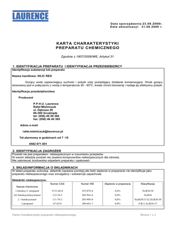 Da ta s porzą dze ni a: 23 .0 8 .2 0 08 r. Da ta ak tua li za c ji: 31 .0 8 .2 0 09 r. KARTA CHARAKTERYSTYKI PREPARATU CHEMICZNEGO Zgodnie z 1907/2006/WE, Artykuł 31 1. IDENTYFIKACJA PREPARATU I IDENTYFIKACJA PRZEDSIEBIORCY Identyfikacja substancji lub preparatu Nazwa handlowa: SILIC RED Gorący wosk zapewniający suchość i połysk oraz posiadający działanie konserwujące. Wosk gorący stosowany jest w połączeniu z wodą o temperaturze 40 - 60 0C, trwale chroni karoserię i nadaje jej efektywny połysk. Identyfikacja przedsiębiorstwa Producent P.P.H.U. Laurence Rafał Mielniczuk ul. Dębowa 26 86-300 Grudziądz tel: (056) 46 49 366 fax: (056) 46 49 365 Adres e-mail rafał[email protected] Tel.alarmowy w godzinach od 7 -15 0502 071 851 2. IDENTYFIKACJA ZAGROŻEŃ Produkt nie jest preparatem niebezpiecznym w rozumieniu przepisów. W swoim składzie produkt nie zawiera komponentów niebezpiecznych dla zdrowia. Nie zaśmiecać środowiska odpadami preparatu i opakowań. 3. SKŁAD/INFORMACJA O SKŁADNIKACH W skład preparatu wchodzą składniki (opisane poniżej),ale ilość stężenia w preparacie nie identyfikuje jako preparatu niebezpiecznego oraz emulgatory i substancje zapachowe. Składniki niebezpieczne: Numer CAS Numer WE Stężenie w preparacie Klasyfikacja 1-butoksy-2 -propanol 5131-66-8 225-878-4 0,4% Xi;R36/38 2(2 butoksyetoksy)etanol 112-34-5 203-961-6 0,9% Xi;R36 2 - butoksyetanol 111-76-2 203-905-0 0,8% Xn;R20/21/22,Xi;R36/38 2-propanol 67-63-0 200-661-7 0,9% F;R11,Xi;R36-37 Nazwa chemiczna Karta charakterystyki preparatu niebezpiecznego Strona 1 z 4 4. PIERWSZA POMOC Po wdychaniu: Obojętny. Po styczności ze skórą: Zanieczyszczoną skórę przemyć wodą z mydłem. Po styczności z okiem: Płukać dużą ilością wody przez 15 minut, podczas płukania trzymać oczy szeroko otwarte, w przypadku wystąpienia podrażnienia skonsultować się z lekarzem. Po przełknięciu: Wypić dużą ilość wody, skontaktować się z lekarzem. 5. POSTĘPOWANIE W PRZYPADKU POŻARU Przydatne środki gaśnicze: Pożary w obecności preparatu gasić środkami odpowiednimi dla palących się materiałów. Inne dane Płyn niepalny, można używać wszystkich środków gaśniczych. 6. POSTĘPOWANIE W PRZYPADKU UWOLNIENIA SUBSTANCJI DO ŚRODOWISKA Indywidualne środki ostrożności: Unikać kontaktu ze skórą i oczami. Środki ochrony środowiska: Zabezpieczyć przed dostaniem się produktu do ścieków, kanalizacji i cieków wodnych. 7. POSTEPOWANIE Z PREPARATEM I JEGO MAGAZYNOWANIE Składowanie: Preparat powinien być przechowywany pod zamknięciem, odpowiednim miejscu. Magazynowanie: Magazynować w zamkniętych oznakowanych pojemnikach. Zapewnić odpowiednią wentylację pomieszczenia. 8. KONTROLA NARAŻENIA I ŚRODKI OCHRONY INDYWIDUALNEJ Ochrona dróg oddechowych: Nie jest niezbędna. Ochrona rąk i skóry: Nie stwierdzono zagrożenia podczas normalnego toku wykorzystania preparatu, mimo to zaleca się stosowanie rękawic ochronnych, tak jak w przypadku każdego preparatu chemicznego. Ochrona oczu: Okulary ochronne Wskazania BHP: Używać produktu zgodnie z jego zastosowaniem, nie przechowywać produktów spożywczych w pobliżu preparatu. Po zakończeniu pracy z preparatem należy dokładnie umyć ręce. 9.WŁAŚCIWOŚCI FIZYCZNE I CHEMICZNE Ogólne dane Forma: Jednorodna ciecz klarowna Kolor: Czerwony Zapach: Charakterystyczny dla użytych komponentów Zmiana stanu Karta charakterystyki preparatu niebezpiecznego Strona 2 z 4 Gęstość: 0,96 – 0,99 g/cm3 Rozpuszczalność w/ mieszalność z wodą: Bez ograniczeń. Wartość pH: 7,0 10. STABILNOŚĆ I REAKTYWNOŚĆ Bierny 11. INFORMACJE TOKSYKOLOGICZNE Nie stwierdza się efektów toksycznych. Preparat nie jest niebezpieczny dla zdrowia. Przestrzegać norm postępowania z preparatami chemicznymi. 12. INFORMACJE EKOLOGICZNE Ekotoksyczność: Brak danych. Zdolność do biodegradacji: Ulega biodegradacji. Wskazówki ogólne: Używać preparatu zgodnie z jego przeznaczeniem i zastosowaniem Nie zaśmiecać środowiska odpadami preparatu i opakowaniami. 13. POSTĘPOWANIE Z ODPADAMI Postępowanie: Zgodnie z lokalnymi przepisami organów terytorialnych. 14. INFORMACJE O TRANSPORCIE Transport lądowy (RID/ADR) - nie podlega przepisom RID/ADR Wyrób może być przewożony dowolnymi środkami transportu, zgodnie z aktualnie obowiązującymi przepisami transportowymi . Nie stwarza zagrożenia w transporcie. 15. INFORMACJE DOTYCZĄCE PRZEPISÓW PRAWNYCH Przepisy prawne: Ustawa o substancjach i preparatach chemicznych z dnia 11.01.2001r. (Dz.U.nr.01.poz.11.84) z późniejszymi zmianami. Rozporządzenie Ministra Zdrowia z dnia 17 stycznia 2003r. w sprawie informacji o preparatach niebezpiecznych dla których nie jest wymagane dostarczenie karty charakterystyki (Dz.U.2003 nr 19 poz. 170) Rozporządzenie Ministra Zdrowia z dnia 28 września 2005r. w sprawie wykazu substancji niebezpiecznych wraz z ich klasyfikacją i oznakowaniem (Dz.U.2005 nr 201 poz. 1674) Rozporządzenie Ministra Zdrowia z dnia 2 września 2003r. w sprawie kryteriów i sposobu kwalifikacji substancji i preparatów chemicznych (Dz.U.2003 nr 171 poz. 1666 ze zmianami w Dz.U.2004 nr 243 poz. 2440 i Dz.U.2007 nr 174 poz.1222) Rozporządzenie Ministra Zdrowia z dnia 5 marca 2009r. w sprawie oznakowania opakowań substancji niebezpiecznych i preparatów niebezpiecznych oraz niektórych preparatów chemicznych (Dz.U.nr 53 poz. 439) Rozporządzenie Ministra Zdrowia z dnia 30 grudnia 2004r.w sprawie bezpieczeństwa i higieny pracy związanej z występowaniem w miejscu pracy czynników chemicznych (Dz.U.2005 nr 11 poz.86) Karta charakterystyki preparatu niebezpiecznego Strona 3 z 4 Produkt nie został sklasyfikowany jako niebezpieczny. 16. INNE INFORMACJE Zwroty R: R 11 Produkt wysoce łatwopalny. R 20/21/22 Działa szkodliwie przez drogi oddechowe,w kontakcie ze skórą i po połknięciu. R 36 Działa drażniąco na oczy. R 36/38 Działa drażniąco na oczy i skórę. R 36/37 Działa dra