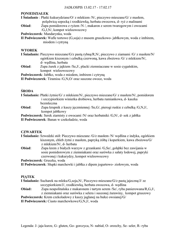 JADŁOSPIS 13.02.17 - 17.02.17 PONIEDZIAŁEK I Śniadanie : Płatki kukurydziane/O/ z mlekiem /N/, pieczywo mieszane/G/ z masłem, polędwicą sopocką i rzodkiewką, herbata owocowa, d- ryż z malinami Obiad: Zupa pomidorowa z ryżem /N /, makaron z serem twarogowym i owocami /G,J,N/, kompot wieloowocowy Podwieczorek: Mandarynka, woda II Podwieczorek: Wafle tortowe (G,soja) z musem gruszkowo- jabłkowym, woda z imbirem, miodem i cytryną WTOREK I Śniadanie: Pieczywo mieszane/G/z pastą rybną/R,N/, pieczywo z ziarnami /G/ z masłem/N/ ogórkiem kiszonym i cebulką czerwoną, kawa zbożowa /G/ z mlekiem/N/, d- wędlina, herbata Obiad: Zupa żurek z jajkiem /Se,J/, placki ziemniaczane w sosie cygańskim, kompot wieloowocowy Podwieczorek: Jabłko, woda z miodem, imbirem i cytryną II Podwieczorek: Tiramisu /G,N,O/ oraz suszone owoce, woda ŚRODA I Śniadanie: Płatki żytnie/G/ z mlekiem/N/, pieczywo mieszane/G/ z masłem/N/, pomidorem i szczypiorkiem winierka drobiowa, herbata rumiankowa, d- kaszka bezmleczna Obiad: Zupa krupnik z kaszy jęczmiennej /Se,G/, pierogi ruskie z cebulką /G,N,J/, kompot jabłkowy Podwieczorek: Serek ziarnisty z owocami /N/ oraz herbatniki /G,N/, d- sok z jabłka II Podwieczorek: Banan w czekoladzie, woda CZWARTEK I Śniadanie: Szwedzki stół: Pieczywo mieszane /G/z masłem /N/ wędlina z indyka, ogórkiem kiszonym, chleb żytni z masłem, papryką żółtą i koperkiem, kawa zbożowa/G/ z mlekiem/N/, d- herbata Obiad: Zupa krem z białych warzyw z grzankami /G,Se/, gołąbki bez zawijania w sosie pomidorowym z ziemniakami oraz surówka z sałaty lodowej, papryki czerwonej i kukurydzy, kompot wieloowocowy Podwieczorek: Gruszka, woda II Podwieczorek: Słupki marchewki i jabłka z dipem jogurtowo- ziołowym, woda PIĄTEK I Śniadanie: Sucharek na mleku/G,soja,N/, Pieczywo mieszane/G/z pastą jajeczną/J/ ze szczypiorkiem/J/, rzodkiewką, herbata owocowa, d- wędlina Obiad: Zupa neapolitańska z makaronem i tartym serem /Se/, ryba panierowana/R,G,J/, z ziemniakami oraz surówka z selera i suszonej żurawiny, kompot gruszowy Podwieczorek: Krem czekoladowy z kaszy jaglanej na bułce owsianej/G/ II Podwieczorek: Ciasto marchewkowe/G,N,J/, woda Legenda: J- jaja kurze, G- gluten, Go- gorczyca, N- nabiał, O- orzechy, Se- seler, R- ryba Koktajl bananowo-czekoladowy: 200ml mleko 2% 50g banan 5 g kakao naturalne Wszystkie składniki zblendować. Tiramisu: 10g Herbatniki (dla diety bezglutenowej ciasteczka bezglutenowe) 3-4 łyżki Jogurt naturalny 2% (dla diety bezmlecznej jogurt sojowy) 5 g Kakao naturalne Garść orzechów włoskich/płatków migdałów Warstwowo układać pokruszone herbatniki, jogurt naturalny wymieszany z kakao, orzechy/płatki migdałów i ponownie herbatniki, jogurt z kakao i orzechy/płatki migdałów. Powtarzać do wyczerpania składników Pasta rybna: 1 puszka filetów śledziowych w sosie pomidorowym 120 ml przecieru pomidorowego ser twarogowy (można zamienić na 2 jajka) 1 ząbek czosnku 1 mała czerwona cebulka 1 łyżeczka bazylii Pieprz, sól Jajka należy ugotować na twardo, ostudzić i rozgnieść widelcem. Można też zastąpić jaja serem twarogowym. Do miseczki dodaj filety śledziowe z puszki wraz z sosem pomidorowym i również rozgniatać je widelcem. Następnie do miseczki dodać 120 ml przecieru pomidorowego, przeciśnięty przez praskę ząbek czosnku, pokrojoną drobno czerwoną cebulkę, rozgniecione jajka, 1 łyżeczkę suszonej bazylii i wszystko dokładnie wymieszać. Doprawić solą i pieprzem. Krem czekoladowy z kaszy jaglanej: 18 g kasza jaglana 30g banan 3 g kakao naturalne 2 g sok z cytryny Kaszę należy ugotować, a następnie zblendować na gładką masę z bananem, sokiem z cytryny. Banany do kremu najlepiej wybierać bardzo dojrzałe- będą słodsze.