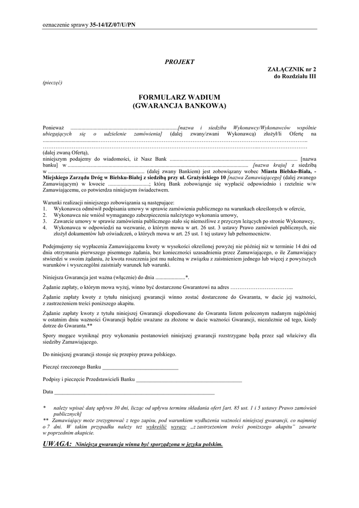 oznaczenie sprawy 35-14/IZ/07/U/PN PROJEKT ZAŁĄCZNIK nr 2 do Rozdziału III (pieczęć) FORMULARZ WADIUM (GWARANCJA BANKOWA) Ponieważ ...............................................................................[nazwa i siedziba Wykonawcy/Wykonawców wspólnie ubiegających się o udzielenie zamówienia] (dalej zwany/zwani Wykonawcą) złożył/li Ofertę na .........................................…………………………………………………………………………………………………….. ………………………………………………………………………………………………………...……………………… (dalej zwaną Ofertą), niniejszym podajemy do wiadomości, iż Nasz Bank .............................................................................................. [nazwa banku] w ..................................................................................................................................... [nazwa kraju] z siedzibą w ....................................................................... (dalej zwany Bankiem) jest zobowiązany wobec Miasta Bielsko-Biała, Miejskiego Zarządu Dróg w Bielsku-Białej z siedzibą przy ul. Grażyńskiego 10 [nazwa Zamawiającego] (dalej zwanego Zamawiającym) w kwocie ..............................; którą Bank zobowiązuje się wypłacić odpowiednio i rzetelnie w/w Zamawiającemu, co potwierdza niniejszym świadectwem. Warunki realizacji niniejszego zobowiązania są następujące: 1. Wykonawca odmówił podpisania umowy w sprawie zamówienia publicznego na warunkach określonych w ofercie, 2. Wykonawca nie wniósł wymaganego zabezpieczenia należytego wykonania umowy, 3. Zawarcie umowy w sprawie zamówienia publicznego stało się niemożliwe z przyczyn leżących po stronie Wykonawcy, 4. Wykonawca w odpowiedzi na wezwanie, o którym mowa w art. 26 ust. 3 ustawy Prawo zamówień publicznych, nie złożył dokumentów lub oświadczeń, o których mowa w art. 25 ust. 1 tej ustawy lub pełnomocnictw. Podejmujemy się wypłacenia Zamawiającemu kwoty w wysokości określonej powyżej nie później niż w terminie 14 dni od dnia otrzymania pierwszego pisemnego żądania, bez konieczności uzasadnienia przez Zamawiającego, o ile Zamawiający stwierdzi w swoim żądaniu, że kwota roszczenia jest mu należną w związku z zaistnieniem jednego lub więcej z powyższych warunków i wyszczególni zaistniały warunek lub warunki. Niniejsza Gwarancja jest ważna (włącznie) do dnia ......................*. Żądanie zapłaty, o którym mowa wyżej, winno być dostarczone Gwarantowi na adres …………………………….. Żądanie zapłaty kwoty z tytułu niniejszej gwarancji winno zostać dostarczone do Gwaranta, w dacie jej ważności, z zastrzeżeniem treści poniższego akapitu. Żądanie zapłaty kwoty z tytułu niniejszej Gwarancji ekspediowane do Gwaranta listem poleconym nadanym najpóźniej w ostatnim dniu ważności Gwarancji będzie uważane za złożone w dacie ważności Gwarancji, niezależnie od tego, kiedy dotrze do Gwaranta.** Spory mogące wyniknąć przy wykonaniu postanowień niniejszej gwarancji rozstrzygane będą przez sąd właściwy dla siedziby Zamawiającego. Do niniejszej gwarancji stosuje się przepisy prawa polskiego. Pieczęć rzeczonego Banku ____________________________ Podpisy i pieczęcie Przedstawicieli Banku _______________________________________ Data ___________________________________________________________ * należy wpisać datę upływu 30 dni, licząc od upływu terminu składania ofert [art. 85 ust. 1 i 5 ustawy Prawo zamówień publicznych] ** Zamawiający może zrezygnować z tego zapisu, pod warunkiem wydłużenia ważności niniejszej gwarancji, co najmniej o 7 dni. W takim przypadku należy też wykreślić wyrazy „z zastrzeżeniem treści poniższego akapitu” zawarte w poprzednim akapicie. UWAGA: Niniejsza gwarancja winna być sporządzona w języku polskim. oznaczenie sprawy 35-14/IZ/07/U/PN PROJEKT ZAŁĄCZNIK nr 3 do Rozdziału III (pieczęć) FORMULARZ WADIUM (GWARANCJA UBEZPIECZENIOWA) Ponieważ (nazwa i siedziba Wykonawcy/Wykonawców wspólnie ubiegających się o udzielenie zamówienia)………………… ……................................................................................................................................................................................................ (dalej zwany/zwani ,,Wykonawcą”) złożył/li Ofertę na ................................................................................................................ …………………………………………………………………………………………………………………………………… (dalej zwaną ofertą), niniejszym podajemy do wiadomości, że ............................................................................................................................ (*nazwa i adres Towarzystwa Ubezpieczeniowego) z siedzibą w ........................................................................ wpisane do rejestru przedsiębiorców Krajowego Rejestru Sadowego przez ..................................................................................... .............................................................................................................................................................................................. pod nr ......................................., o kapitale akcyjnym w wysokości ............................................. zł., działając na podstawie ................................................. na prowadzenie działalności ubezpieczeniowej z dnia .................................... w skład Zarządu którego wchodzą: 1. ............................................... 2. ............................................... (zwane dalej ,,Gwarantem”) jest zobowiązane wobec Miasta Bielsko-Biała - Miejskiego Zarządu Dróg w