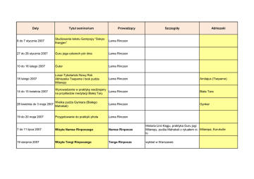 Daty Tytuł seminarium Prowadzący Szczegóły Abhiszeki 6 do 7 stycznia 2007 Studiowanie tekstu Gampopy “Dakpo thargjen” Lama Rinczen 27 do 28 stycznia 2007 Guru joga czterech pór dnia Lama Rinczen 10 do 16 lutego 2007 Gutor Lama Rinczen 18 lutego 2007 Losar-Tybetański Nowy Rok Abhiszeka Tsepame i tsok pudża Milarepy Lama Rinczen 14 do 15 kwietnia 2007 Wprowadzenie w praktykę wadżrajany Lama Rinczen na przykładzie medytacji Białej Tary Biała Tara 28 kwietnia do 3 maja 2007 Wielka pudża Gynkara (Białego Mahakali) Lama Rinczen Gynkar 19 do 20 maja 2007 Przygotowanie do praktyki phoła Lama Rinczen 7 do 11 lipca 2007 Wizyta Namse Rinpoczego Namse Rinpocze Historia Linii Kagju, praktyka Guru jogi Milarepy, pudża Mahakali z rytuałem ci- Milarepa, Kurukulle lu 19 sierpnia 2007 Wizyta Tengi Rinpoczego Tenga Rinpocze wykład w Warszawie Amitajus (Tsepame) Nauki o Czystej Krainie Dełacien, praktyka phoła, pudża Buddy Amitabhy, Budda Amitabha, Guru poświęcenie drubkangu (pudża Zielonej Drakpur Tary i tsok Milarepy) 20 do 27 sierpnia 2007 Wizyta Tengi Rinpoczego Tenga Rinpocze 15 do 16 września 2007 Długa pudża Białej Tary Lama Rinczen BiałaTara 22 do 23 września 2007 Wprowadzenie do wadżrajany w oparciu o praktykę Czenrezika Lama Rinczen Czenrezik 20 do 21 października 2007 Praktyka lodziong Lama Rinczen 1 do 4 listopada 2007 Długa pudża Dordże Phagmo Lama Rinczen 9 do 25 listopada 2007 Praktyka ośmiu njungne Lama Trinle