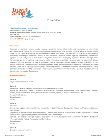 Travel Shop „Dzikość Roztocza i urok Lwowa” Kazimierz Dolny, Zamość, Lwów Atrakcje: zwiedzanie zamku, wizyta w parku, zwiedzanie Lublina i Lwowa ilość dni: 4/5 grupa wiekowa: - gimnazjum - szkoła średnia cena od: 665 PLN (przy 45 os.) Program Roztocze to magiczna i znana, choćby z nazwy, wszystkim kraina, jednak mało osób zapuszcza się w te odległe, wschodnie tereny. Nazwa Roztocza pochodzi najprawdopodobniej od słów: rozlanie, miejsca, gdzie rozchodzą się dwa potoki, co ma swoje bezpośrednie odzwierciedlenie w pięknie tego terenu - pasma wzgórz poprzecinanych strumykami, rzeczkami, śródleśnymi jeziorkami. Kraina to iście magiczna. Podczas naszej wyprawy odwiedzimy Zwierzyniec, słynący z wielu zabytków, w tym budowli Ordynacji Zamoyskich. Odkryjemy tajemnice Roztoczańskiego Parku Narodowego, po czym złożymy swą wizytę w stolicy Zamojszczyzny, która na pewno urzeknie wszystkich Starym Miastem, które ze względu na swą renesansową, idealną zabudowę, zostało wpisane na listę UNESCO. Z ziem Zamojszczyzny już całkiem blisko do wspaniałego Lwowa, który także doskonale zapamiętamy ze względu na polskie korzenie, które od lat wpisują się w historię i kulturę tego miasta. Odwiedzimy Cmentarz Obrońców Lwowa, zwany popularnie Cmentarzem Orląt Lwowskich - nazywanym przez Polaków Campo Santo - Świętym Miejscem. Powody poznamy już na miejscu. Zapraszamy. PROGRAM RAMOWY: Dzień 1 Wyjazd ze Szczecina ok. 22:00 Dzień 2 Zwiedzanie Zamku w Janowcu, położonego na wysokiej wiślanej skarpie; Spacer po Kazimierzu Dolnym – starówka: Kościół Farny, kamienice renesansowe, Góra Trzech Krzyży, Zamek i Baszta, Kościół OO Reformatorów, Muzeum Sztuki Złotniczej, spacer po Wąwozie Korzeniowy Dół; Przejazd na Roztocze. Obiadokolacja. Nocleg 1. Dzień 3 Śniadanie. Zwierzyniec - spacer z przewodnikiem po miasteczku i zabytki Ordynacji Zamoyskich: Kaplica na Wodzie, modrzewiowy dwór, browar. Odwiedziny w Roztoczańskim Paru Narodowym i podsłuchanie szumów – charakterystycznych dla Roztocza progów wodnych oraz zajęcia dydaktyczne z pracownikiem Parku Narodowego. Zamość – zwiedzanie “idealnego miasta” z przewodnikiem: Rynek z podcieniowymi kamienicami, Akademia Zamojskich i Arsenał, katedra, Kościół Franciszkanów i Bonifratrów. Obiadokolacja. Nocleg 2. Dzień 4 Śniadanie wczesnym rankiem. Wygenerowane w systemie TravelShop 1/2 04-03-2017 00:39:03 Wyjazd do Lwowa ok. godz. 6:30 Zwiedzanie Lwowa z przewodnikiem: Zwiedzanie Apteki Muzeum, Rynek z ratuszem, Kościół Dominikanów i Katedra Łacińska, Pomnik A. Mickiewicza, przejazd przez Lwów autokarem, Cmentarz Łyczakowski i Cmentarz Obrońców Lwowa – zwiedzanie, Kopiec Unii Lubelskiej. Powrót do Ośrodka w późnych godzinach wieczornych. Obiadokolacja. Nocleg 3. Dzień 5 Śniadanie. Wykwaterowanie. Przejazd do Lublina. Zwiedzanie z przewodnikiem Starego Miasta – Zamek z Kaplicą Trójcy Świętej, Brama Grodzka, Plac Po Farze, Rynek, Trybunał Koronny, Wieża Trynitarska, Brama Krakowska. Z planem miasta ręku poszukamy odpowiedzi na zagadki związane z lubelskimi legendami – o Czarciej Łapie, o Leszku Czarnym, o kamieniu nieszczęść, o kogucie na wieży. Około godziny 14:00 przejazd w kierunku Szczecina. Planowany powrót do Szczecina ok. godziny 24:00 Cena zawiera Transport, 3 noclegi, 3 śniadania, 3 obiadokolacje, realizację programu, opiekę i komentarz pilota Travel Shop, usługę przewodnicką we Lwowie i w Lublinie, miejsca gratis dla 4 Opiekunów (przy 45 uczestnikach), ubezpieczenie NNW i KL, podatek VAT. CENA NIE ZAWIERA: Biletów wstępu do atrakcji turystycznych na terenie Lwowa, +ok 15 PLN – 30 UAH/os. Zwiedzanie Muzeum Wsi Lubelskiej +ok.8 PLN/os Ewentualnego obiadu w drodze powrotnej +20 PLN/os. Dodatkowe informacje UWAGI: *Cena zostały ustalona dla grup liczących co najmniej 45 pełnopłatnych uczestników, **Cena dla grupy wyjeżdżającej ze Szczecina, ***Kolejność zwiedzania może ulec zmianie – wszelkie potencjalne zmiany wprowadzone będą po konsultacji z grupą; Treść oferty nie stanowi oferty handlowej w rozumieniu art 66 § 1 kodeksu cywilnego oraz innych właściwych przepisów prawnych. Wygenerowane w systemie TravelShop 2/2 04-03-2017 00:39:03