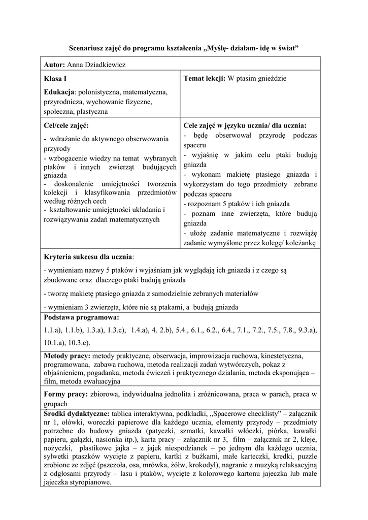 Scenariusz zajęć do programu kształcenia „Myślę- działam- idę w świat” Autor: Anna Dziadkiewicz Klasa I Temat lekcji: W ptasim gnieździe Edukacja: polonistyczna, matematyczna, przyrodnicza, wychowanie fizyczne, społeczna, plastyczna Cel/cele zajęć: - wdrażanie do aktywnego obserwowania przyrody - wzbogacenie wiedzy na temat wybranych ptaków i innych zwierząt budujących gniazda - doskonalenie umiejętności tworzenia kolekcji i klasyfikowania przedmiotów według różnych cech - kształtowanie umiejętności układania i rozwiązywania zadań matematycznych Cele zajęć w języku ucznia/ dla ucznia: - będę obserwował przyrodę podczas spaceru - wyjaśnię w jakim celu ptaki budują gniazda - wykonam makietę ptasiego gniazda i wykorzystam do tego przedmioty zebrane podczas spaceru - rozpoznam 5 ptaków i ich gniazda - poznam inne zwierzęta, które budują gniazda - ułożę zadanie matematyczne i rozwiążę zadanie wymyślone przez kolegę/ koleżankę Kryteria sukcesu dla ucznia: - wymieniam nazwy 5 ptaków i wyjaśniam jak wyglądają ich gniazda i z czego są zbudowane oraz dlaczego ptaki budują gniazda - tworzę makietę ptasiego gniazda z samodzielnie zebranych materiałów - wymieniam 3 zwierzęta, które nie są ptakami, a budują gniazda Podstawa programowa: 1.1.a), 1.1.b), 1.3.a), 1.3.c), 1.4.a), 4. 2.b), 5.4., 6.1., 6.2., 6.4., 7.1., 7.2., 7.5., 7.8., 9.3.a), 10.1.a), 10.3.c). Metody pracy: metody praktyczne, obserwacja, improwizacja ruchowa, kinestetyczna, programowana, zabawa ruchowa, metoda realizacji zadań wytwórczych, pokaz z objaśnieniem, pogadanka, metoda ćwiczeń i praktycznego działania, metoda eksponująca – film, metoda ewaluacyjna Formy pracy: zbiorowa, indywidualna jednolita i zróżnicowana, praca w parach, praca w grupach Środki dydaktyczne: tablica interaktywna, podkładki, „Spacerowe checklisty” – załącznik nr 1, ołówki, woreczki papierowe dla każdego ucznia, elementy przyrody – przedmioty potrzebne do budowy gniazda (patyczki, szmatki, kawałki włóczki, piórka, kawałki papieru, gałązki, nasionka itp.), karta pracy – załącznik nr 3, film – załącznik nr 2, kleje, nożyczki, plastikowe jajka – z jajek niespodzianek – po jednym dla każdego ucznia, sylwetki ptaszków wycięte z papieru, kartki z buźkami, małe karteczki, kredki, puzzle zrobione ze zdjęć (pszczoła, osa, mrówka, żółw, krokodyl), nagranie z muzyką relaksacyjną z odgłosami przyrody – lasu i ptaków, wycięte z kolorowego kartonu jajeczka lub małe jajeczka styropianowe. Przebieg zajęć Działania uczniów „Drogowskazy” -wskazówki i uwagi o realizacji 1. Wychodzą na spacer, obserwują ptaki, ptasie gniazda i zbierają przedmioty potrzebne do budowy gniazda. Centra Aktywnej Edukacji Nauczyciel zaprasza uczniów na spacer, by obserwować ptaki i przyrodę wiosną. Przed spacerem zadaje pytanie kluczowe: „Dlaczego ptaki budują gniazda?”. Informuje, że odpowiedź na to pytanie oraz zbudowanie ptasich gniazd jest celem lekcji. Prosi uczniów, by podczas spaceru obserwowali ptaki, ich gniazda, nasłuchiwali ptasich głosów. Rozdaje uczniom „Spacerowe checklisty” z zadaniami do wykonania podczas spaceru. – załącznik nr 1. Czyta na głos zadania, które 2. Wykonują zadania uczniowie mają wykonać i objaśnia grafikę. ze „Spacerowej Informuje, że podczas spaceru dzieci będą checklisty”. musiały zebrać rzeczy, z których ptaki budują gniazda. Każde dziecko otrzymuje: podkładkę, „Spacerową checklistę”, ołówek i woreczek papierowy, do którego będzie zbierało elementy do zbudowania swojego gniazda. matematyczno – przyrodnicze i polonistycznokomunikacyjne 3. Dzielą się Nauczyciel prosi uczniów, by opowiedzieli o spostrzeżeniami ze swoich obserwacjach i wynikach pracy ze spaceru i „Spacerową checklistą”. porównują wyniki zapisane na „Spacerowych checklistach.” matematyczno – przyrodnicze i polonistycznokomunikacyjne 4. Tworzą kolekcje przedmiotów i klasyfikują je według różnych cech. matematyczno – przyrodnicze i polonistycznokomunikacyjne oraz artystycznoruchowe Uczniowie robią rundę po klasie i oglądają matematyczno zgromadzone przez siebie przedmioty. – przyrodnicze Nauczyciel dobiera uczniów w czteroosobowe grupy. Każda grupa gromadzi wszystkie odnalezione przedmioty. Nauczyciel prosi, by uczniowie posegregowali je według ustalonych przez siebie cech. Następnie wszystkie grupy porównują swoje kolekcje. Jest to dobra sytuacja na ćwiczenia z przeliczaniem i określaniem cech wspólnych zbiorów. 5. Budują gniazda z Uczniowie pracują w tych samych grupach i artystycznopapierowych przystępują do budowania gniazd. Każdy uczeń ruchowe torebek i przycina i wywija papierową torebkę, do której samodzielnie następnie przykleja gałązki, patyczki, papierki, zgromadzonych piórka, szmatki itp. materiałów. 6. Szukają odpowiedzi na pytanie „Dlaczego ptaki budują gniazda?” W parach uczniowie dyskutują nad odpowiedzią matematyczno na pytanie: „Dlaczego ptaki budują gniazda?.”. – przyrodnicze Każda para przygotowuje wspólnie odpowiedź, a następnie nauczyciel losuje za pomocą patyczków z imionami osoby, które wypowiedzą się na forum klasy. Na zakończenie nauczyciel dopytuje o inne pomysły. Wszystkie propozycje są zapisywane na tablicy przez nauczyciela lub ucznia. 7. Naśladują małe ptaszki uczące się latać przy dźwiękach muzyki relaksacyjnej. Nauczyciel prosi uczniów, by wyobrazili sobie, artystycznoże są małymi pisklętami, które są jeszcze w jajku ruchowe i próbują się z niego wydostać. Następnie próbują wydostać się z gniazda i uczą się latać. Cała zabawa improwizacyjna odbywa się przy dźwiękach muzyki relaksacyjnej z odgłosami lasu i śpiewem ptaków. 8. Wymyślają i rysują przykłady zwierząt budujących gniazda nie będących ptakami. Nauczyciel rozdaje uczniom małe karteczki i kredki. 