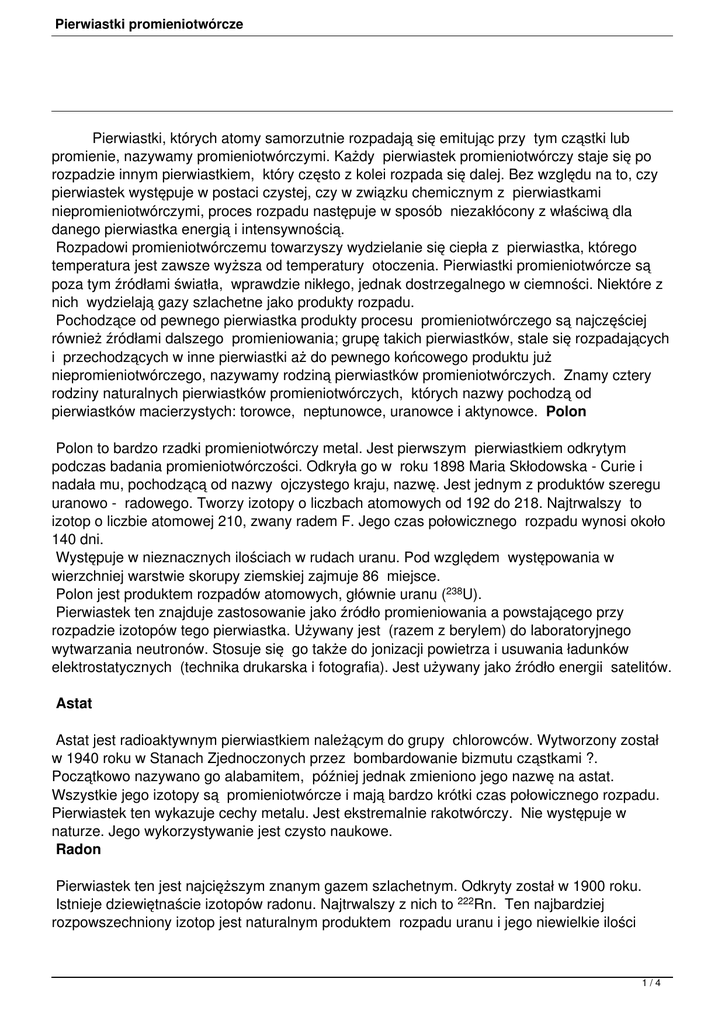 Pierwiastki promieniotwórcze Pierwiastki, których atomy samorzutnie rozpadają się emitując przy tym cząstki lub promienie, nazywamy promieniotwórczymi. Każdy pierwiastek promieniotwórczy staje się po rozpadzie innym pierwiastkiem, który często z kolei rozpada się dalej. Bez względu na to, czy pierwiastek występuje w postaci czystej, czy w związku chemicznym z pierwiastkami niepromieniotwórczymi, proces rozpadu następuje w sposób niezakłócony z właściwą dla danego pierwiastka energią i intensywnością. Rozpadowi promieniotwórczemu towarzyszy wydzielanie się ciepła z pierwiastka, którego temperatura jest zawsze wyższa od temperatury otoczenia. Pierwiastki promieniotwórcze są poza tym źródłami światła, wprawdzie nikłego, jednak dostrzegalnego w ciemności. Niektóre z nich wydzielają gazy szlachetne jako produkty rozpadu. Pochodzące od pewnego pierwiastka produkty procesu promieniotwórczego są najczęściej również źródłami dalszego promieniowania; grupę takich pierwiastków, stale się rozpadających i przechodzących w inne pierwiastki aż do pewnego końcowego produktu już niepromieniotwórczego, nazywamy rodziną pierwiastków promieniotwórczych. Znamy cztery rodziny naturalnych pierwiastków promieniotwórczych, których nazwy pochodzą od pierwiastków macierzystych: torowce, neptunowce, uranowce i aktynowce. Polon Polon to bardzo rzadki promieniotwórczy metal. Jest pierwszym pierwiastkiem odkrytym podczas badania promieniotwórczości. Odkryła go w roku 1898 Maria Skłodowska - Curie i nadała mu, pochodzącą od nazwy ojczystego kraju, nazwę. Jest jednym z produktów szeregu uranowo - radowego. Tworzy izotopy o liczbach atomowych od 192 do 218. Najtrwalszy to izotop o liczbie atomowej 210, zwany radem F. Jego czas połowicznego rozpadu wynosi około 140 dni. Występuje w nieznacznych ilościach w rudach uranu. Pod względem występowania w wierzchniej warstwie skorupy ziemskiej zajmuje 86 miejsce. Polon jest produktem rozpadów atomowych, głównie uranu (238U). Pierwiastek ten znajduje zastosowanie jako źródło promieniowania a powstającego przy rozpadzie izotopów tego pierwiastka. Używany jest (razem z berylem) do laboratoryjnego wytwarzania neutronów. Stosuje się go także do jonizacji powietrza i usuwania ładunków elektrostatycznych (technika drukarska i fotografia). Jest używany jako źródło energii satelitów. Astat Astat jest radioaktywnym pierwiastkiem należącym do grupy chlorowców. Wytworzony został w 1940 roku w Stanach Zjednoczonych przez bombardowanie bizmutu cząstkami ?. Początkowo nazywano go alabamitem, później jednak zmieniono jego nazwę na astat. Wszystkie jego izotopy są promieniotwórcze i mają bardzo krótki czas połowicznego rozpadu. Pierwiastek ten wykazuje cechy metalu. Jest ekstremalnie rakotwórczy. Nie występuje w naturze. Jego wykorzystywanie jest czysto naukowe. Radon Pierwiastek ten jest najcięższym znanym gazem szlachetnym. Odkryty został w 1900 roku. Istnieje dziewiętnaście izotopów radonu. Najtrwalszy z nich to 222Rn. Ten najbardziej rozpowszechniony izotop jest naturalnym produktem rozpadu uranu i jego niewielkie ilości 1/4 Pierwiastki promieniotwórcze występują w glebie i skałach. Istnieje podejrzenie, że koncentracje tego izotopu mogą powodować raka płuc. Radon jest też produktem rozpadu radu - stąd pochodzi jego nazwa. Izotop radonu o masie atomowej 222 znalazł zastosowanie w leczeniu ciężkich przypadków raka. Niewielką ilość tego promieniotwórczego gazu, zamkniętą w szklanym pojemniku wszczepia się do chorej tkanki (tkanka nowotworowa jest bardziej wrażliwa na promieniowanie). Frans Jest najcięższym ze znanych metali alkalicznych. Odkryty został w 1939 roku we Francji. Frans, nazwany na cześć Francji, swoimi właściwościami chemicznymi jest podobny do cezu. Jest najbardziej elektrododatni ze wszystkich pierwiastków. Występuje w naturze w rudach uranowych. Jest produktem rozpadu aktynu (rozpad a). Wszystkie jego izotopy są radioaktywne i bardzo nietrwałe. Rad Jest srebrzystym, promieniotwórczym metalem. Odkryty został w smółce uranowej (głównej rudzie uranu) w 1898 roku przez Piotra i Marię Curie. Uczeni zauważyli, że zanieczyszczenia tej rudy są bardziej promieniotwórcze od czystej rudy. W procesie separacji chemicznej otrzymali kilka frakcji. Dwie z nich okazały się nowymi pierwiastkami promieniotwórczymi: polonem i radem. Wszystkie izotopy tego pierwiastka są promieniotwórcze. Ich masy atomowe należą do zakresu od 206 do 232. Najtrwalszym izotopem jest 226Ra. Jego czas połowicznego rozpadu wynosi 1620 lat. Jako naturalny produkt rozpadu uranu towarzyszy jego rudom. Pod względem występowania w wierzchniej warstwie skorupy ziemskiej zajmuje 84 miejsce. Promieniotwórczość radu wykorzystuje się do leczenia zaawansowanego i rozległego raka. Promieniowanie niszczy komórki nowotworu, które są bardziej wrażliwe niż zdrowa tkanka. Określoną porcję chlorku lub bromku radu zamyka się w szklanym pojemniku i umieszcza w chorej tkance. Niewielkie ilości radu wykorzystywane są również do wytwarzania farb świecących w ciemności. Emitowane promieniowanie a pobudza niektóre substancje (np. siarczek cynku) do emitowania światła. Aktyn Aktyn jest metalicznym, radioaktywnym pierwiastkiem rozpoczynającym serię pierwiastków zwanych aktynowcami. Odkryty został w 1899 roku. 2/4 Pierwiastki promieniotwórcze Pierwiastek ten występuje naturalnie w rudach uranu. Masy atomowe jego izotopów należą do przedziału od 209 do 234. Aktyn wraz z produktami jego rozpadu, jest silnym źródłem promieniowania a i neutronowego. Pod względem występowania w wierzchniej warstwie skorupy ziemskiej zajmuje 87 miejsce. Tor Jest radioaktywnym metalem o jasnym zabarwieniu. Pierwiastek ten należy do serii aktynowców. Znane są jego dwie odmiany alotropowe. Zanieczyszczony tor reaguje powoli na powietrzu i zmienia zabar