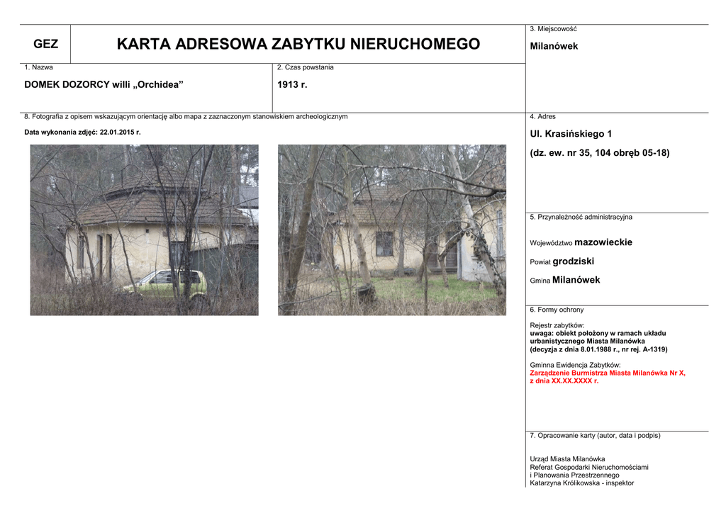 3. Miejscowość GEZ KARTA ADRESOWA ZABYTKU NIERUCHOMEGO 1. Nazwa 2. Czas powstania DOMEK DOZORCY willi „Orchidea” 1913 r. Milanówek 8. Fotografia z opisem wskazującym orientację albo mapa z zaznaczonym stanowiskiem archeologicznym 4. Adres Data wykonania zdjęć: 22.01.2015 r. Ul. Krasińskiego 1 (dz. ew. nr 35, 104 obręb 05-18) 5. Przynależność administracyjna Województwo mazowieckie Powiat grodziski Gmina Milanówek 6. Formy ochrony Rejestr zabytków: uwaga: obiekt położony w ramach układu urbanistycznego Miasta Milanówka (decyzja z dnia 8.01.1988 r., nr rej. A-1319) Gminna Ewidencja Zabytków: Zarządzenie Burmistrza Miasta Milanówka Nr X, z dnia XX.XX.XXXX r. 7. Opracowanie karty (autor, data i podpis) Urząd Miasta Milanówka Referat Gospodarki Nieruchomościami i Planowania Przestrzennego Katarzyna Królikowska - inspektor