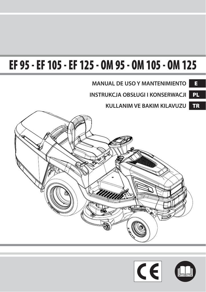 EF 95 - EF 105 - EF 125 - OM 95 - OM 105 - OM 125 MANUAL DE USO Y MANTENIMIENTO E INSTRUKCJA OBSŁUGI I KONSERWACJI PL KULLANIM VE BAKIM KILAVUZU TR 햲 1 햳 햴 햶 햷 max 10° (17%) 햵 햽 햿 2014 햺 햸 햹 Via E. Fermi, - 42011 Bagnolo in Piano (RE) Italy 27 OM 125/23 H 68079020 GARDEN TRACTOR 13,5 kW - 275 kg 707 XXX 0001 105 햾 햻 2 16 14 10 1A 1 3 2 8 11 4 9 15 13 5 6 12 2 7 17 3 b d 4 e a a b c d f 1 0 n 5 m l k j i h g f e 6 a b a b 7 8 a a b c 9 10 1 0 3 11 12 a c „Click“ a 13 14 a b „Click“ 15 16 2 1 17 2 18 1 2 1 4 a b 19 20 a a 21 22 c b a 23 24 25 26 5 E TRADUCCIÓN DE LAS INSTRUCCIONES ÍNDICE ORIGINALES 1. N O R M A S D E S E G U R I D A D (indicaciones para utilizar la máquina de modo seguro) INTRODUCCIÓN 2. EXPLICACIÓN DE LOS SÍMBOLOS Para utilizar correctamente la máquina y Y ADVERTENCIAS DE SEGURIDAD (identificación de la máquina y evitar accidentes, lea con atención este significado de los símbolos) manual antes de comenzar el trabajo. El 3. COMPONENTES PRINCIPALES manual contiene explicaciones sobre el (ubicación de los elementos funcionamiento de los distintos principales de la máquina) 4. ENSAMBLAJE (instrucciones para componentes, además de instrucciones para quitar el embalaje y montar las realizar los controles y el mantenimiento piezas sueltas) necesarios. 5. MANDOS E INSTRUMENTOS DE Nota. Las descripciones e ilustraciones CONTROL (ubicación y función de todos los mandos) contenidas en el presente manual no son 6. NORMAS DE USO (indicaciones vinculantes. El fabricante se reserva el para trabajar de modo correcto y derecho a modificar los productos sin seguro) hacer los cambios correspondientes en el - 6.1 Operaciones preliminares material impreso. - 6.2 Uso de la máquina Además de las instrucciones de uso y - 6.3 Corte del césped mantenimiento, este manual contiene otras - 6.4 Transporte informaciones que requieren una especial 7. MANTENIMIENTO (instrucciones para mantener la máquina en buen atención. Dichas informaciones están estado de funcionamiento) señaladas con los siguientes símbolos: 7.1 Recomendaciones de seguridad ATENCIÓN: indica riesgo de accidentes, 7.2 Acceso a los órganos mecánicos lesiones personales –incluso mortales– o - 7.3 Mantenimiento ordinario daños materiales importantes. PRECAUCIÓN: indica riesgo de que se - 7.4 Operaciones en la máquina 8. PROTECCIÓN DEL AMBIENTE dañen la máquina o sus componentes. (consejos para utilizar la máquina en Los tractores con descarga posterior se armonía con la naturaleza) fabrican en distintas versiones. Asegúrese de 9. ACCESORIOS (para ampliar el que estas instrucciones correspondan campo de aplicación de la máquina) específicamente a su modelo de tractor. - 9.1 Accesorios opcionales 10. DATOS TÉCNICOS (características principales de la máquina) ATENCIÓN 11. DECLARACIÓN DE CONFORMIDAD RIESGO DE DAÑO AUDITIVO 12. CERTIFICADO DE GARANTÍA (detalle EN CONDICIONES NORMALES, EL USO DE de las condiciones de garantía) ESTA MÁQUINA PUEDE EXPONER AL CONDUCTOR A UN NIVEL DIARIO DE 13. SOLUCIÓN DE PROBLEMAS (guía para resolver posibles RUIDO IGUAL O SUPERIOR A inconvenientes) 85 dB (A). 6 7 8 9 9 9 12 15 18 20 23 24 24 24 25 28 29 29 29 32 33 34 35 1. NORMAS DE SEGURIDAD ATENCIÓN - La máquina, si se la utiliza correctamente, es un instrumento de trabajo rápido, cómodo y eficaz; pero si se la emplea de modo inapropiado o sin las debidas precauciones puede resultar peligrosa. Para que su trabajo sea siempre agradable y seguro, respete estrictamente las normas de seguridad que se indican a continuación y en el resto del manual. - Las máquinas accionadas por motores de combustión interna transmiten vibraciones. En caso de exposición prolongada a dichas vibraciones, las personas afectadas de problemas circulatorios o edemas anómalos pueden sufrir lesiones en los vasos sanguíneos o en los nervios de los dedos, manos y muñecas. El uso prolongado en climas fríos se ha asociado a lesiones en los vasos sanguíneos de personas sanas. Si aparecen síntomas tales como pérdida de sensibilidad, dolor, pérdida de fuerza, cambio en la textura o el color de la piel, o pérdida de sensibilidad en dedos, manos o muñecas, interrumpa el uso de la máquina y acuda a un médico. - El sistema de encendido de la máquina genera un campo electromagnético de muy baja intensidad. Este campo puede inter ferir con algunos marcapasos. Para disminuir el riesgo de indisposiciones graves e incluso mortales, los portadores de marcapasos deben consultar a su médico y al fabricante del marcapasos antes de utilizar esta máquina. ATENCIÓN: La legislación de algunos países puede limitar el uso de la máquina. 1) Antes de utilizar la máquina, lea este manual con atención hasta que comprenda y sepa poner en práctica todas las reglas de seguridad, precauciones e instrucciones de manejo. 2) Tenga siempre el manual al alcance de la mano. Si este se extravía, pida otro ejemplar. 3) L a m á q u i n a d e b e s e r u t i l i z a d a exclusivamente por personas adultas que puedan comprender y respetar las normas de seguridad, precauciones e instrucciones contenidas en este manual. No permita que los menores utilicen la máquina. 4) No manipule ni utilice la máquina si está cansado, enfermo o inquieto, y tampoco si ha tomado alcohol, drogas o medicamentos. El conductor debe encontrarse en buen estado físico y con la mente alerta. El uso de esta máquina es fatigoso: si tiene algún problema que se pueda agravar a causa de este tipo de trabajo, consulte a su médico antes de utilizar la máquina. Preste mayor atención antes de las pausas de descanso y hacia el final del turno de trabajo. 5) Evite la presencia de personas y animales en un radio de 15 m como mínimo alrededor del lugar de trabajo. No permita que se acerquen personas o animales a la máquina durante el arranque y el uso. 6) Para trabajar con la máquina, póngase siempre ropa de seguridad homologada. No util