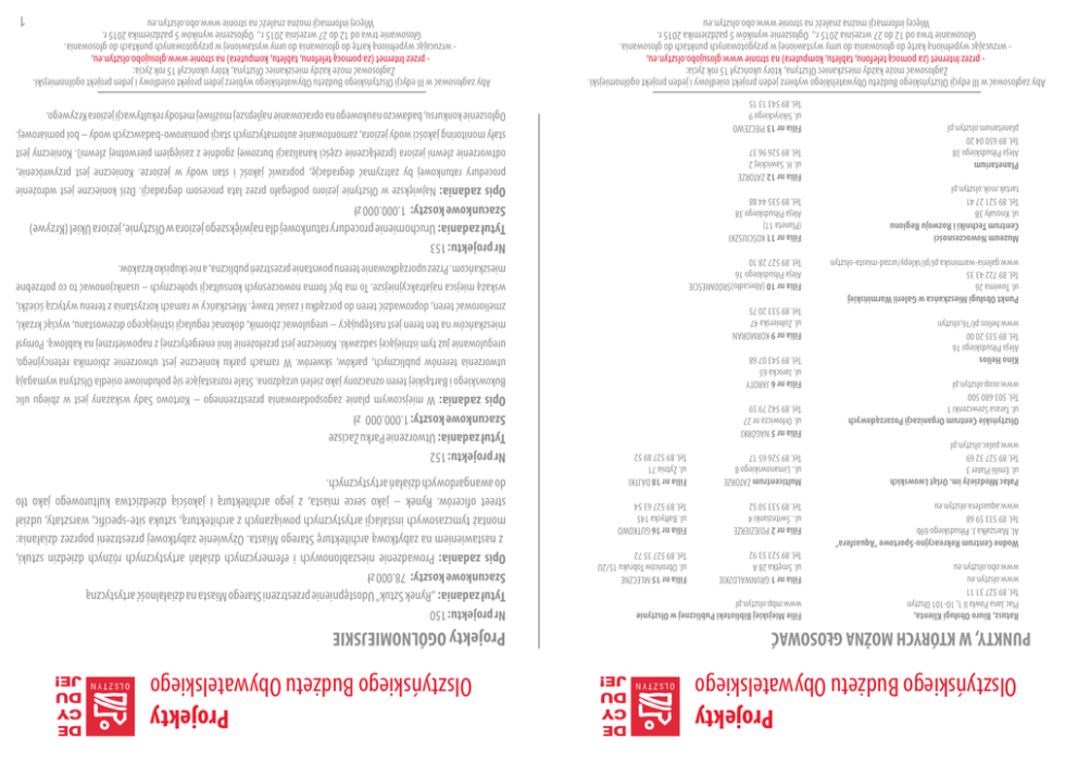 Projekty Olsztyñskiego Bud¿etu Obywatelskiego PUNKTY, W KTÓRYCH MO¯NA G£OSOWAÆ Ratusz, Biuro Obs³ugi Klienta, Plac Jana Paw³a II 1, 10-101 Olsztyn Tel. 89 527 31 11 www.olsztyn.eu www.obo.olsztyn.eu Wodne Centrum Rekreacyjno-Sportowe "Aquasfera” Al. Marsza³ka J. Pi³sudskiego 69b Tel. 89 533 59 68 www.aquasfera.olsztyn.eu Pa³ac M³odzie¿y im. Orl¹t Lwowskich ul. Emilii Plater 3 Tel. 89 527 32 69 www.palac.olsztyn.pl Olsztyñskie Centrum Organizacji Pozarz¹dowych ul. Tarasa Szewczenki 1 Tel. 503 680 500 www.ocop.olsztyn.pl Kino Helios Aleja Pi³sudskiego 16 Tel. 89 535 20 00 www.helios.pl/16,olsztyn Punkt Obs³ugi Mieszkañca w Galerii Warmiñskiej ul. Tuwima 26 Tel. 89 722 43 35 www.galeria-warminska.pl/pl/sklepy/urzad-miasta-olsztyn Muzeum Nowoczesnoœci Centrum Techniki i Rozwoju Regionu ul. Knosa³y 3B Tel. 89 521 27 41 tartak.mok.olsztyn.pl Planetarium Aleja Pi³sudskiego 38 Tel. 89 650 04 20 planetarium.olsztyn.pl Filie Miejskiej Biblioteki Publicznej w Olsztynie www.mbp.olsztyn.pl Filia nr 18 DAJTKI ul. ¯ytnia 71 Tel. 89 527 89 52 Multicentrum ZATORZE ul.. Limanowskiego 8 Tel. 89 526 65 17 Filia nr 16 GUTKOWO ul. Ba³tycka 145 Tel. 89 527 63 54 Filia nr 2 POJEZIERZE ul.. Œwitezianki 4 Tel. 89 533 50 52 Filia nr 15 MLECZNE ul. Obroñców Tobruku 15/2U Tel. 89 527 35 72 Filia nr 1 GRUNWALDZKIE ul. Smêtka 28 A Tel. 89 523 53 92 Filia nr 5 NAGÓRKI ul. Or³owicza nr 27 Tel. 89 542 79 59 Projekty Olsztyñskiego Bud¿etu Obywatelskiego Projekty OGÓLNOMIEJSKIE Nr projektu: 150 Tytu³ zadania: „Rynek Sztuk" Udostêpnienie przestrzeni Starego Miasta na dzia³alnoœæ artystyczn¹ Szacunkowe koszty: 78.000 z³ Opis zadania: Prowadzenie nieszablonowych i efemerycznych dzia³añ artystycznych ró¿nych dziedzin sztuki, z nastawieniem na zabytkow¹ architekturê Starego Miasta. O¿ywienie zabytkowej przestrzeni poprzez dzia³ania: monta¿ tymczasowych instalacji artystycznych powi¹zanych z architektur¹, sztuka site-specific, warsztaty, udzia³ street oficerów. Rynek – jako serce miasta, z jego architektur¹ i jakoœci¹ dziedzictwa kulturowego jako t³o do awangardowych dzia³añ artystycznych. Nr projektu: 152 Tytu³ zadania: Utworzenie Parku Zacisze Szacunkowe koszty: 1.000.000 z³ Opis zadania: W miejscowym planie zagospodarowania przestrzennego – Kortowo Sady wskazany jest w zbiegu ulic Bukowskiego i Bart¹skiej teren oznaczony jako zieleñ urz¹dzona. Stale rozrastaj¹ce siê po³udniowe osiedla Olsztyna wymagaj¹ utworzenia terenów publicznych, parków, skwerów. W ramach parku konieczne jest utworzenie zbiornika retencyjnego, uregulowanie ju¿ tym istniej¹cej sadzawki. Konieczne jest prze³o¿enie linii energetycznej z napowietrznej na kablow¹. Pomys³ mieszkañców na ten teren jest nastêpuj¹cy – uregulowaæ zbiornik, dokonaæ regulacji istniej¹cego drzewostanu, wyci¹æ krzaki, zmeliorowaæ teren, doprowadziæ teren do porz¹dku i zasiaæ trawê. Mieszkañcy w ramach korzystania z terenu wytycz¹ œcie¿ki, wska¿¹ miejsca najatrakcyjniejsze. To ma byæ forma nowoczesnych konsultacji spo³ecznych – usankcjonowaæ to co potrzebne mieszkañcom. Przez uporz¹dkowanie terenu powstanie przestrzeñ publiczna, a nie skupisko krzaków. Filia nr 6 JAROTY ul. Jarocka 65 Tel. 89 543 07 68 Filia nr 9 KORMORAN ul. ¯o³nierska 47 Tel. 89 533 20 75 Filia nr 10 (Abecad³o)ŒRÓDMIEŒCIE Aleja Pi³sudskiego 16 Tel. 89 527 28 10 Nr projektu: 153 Tytu³ zadania: Uruchomienie procedury ratunkowej dla najwiêkszego jeziora w Olsztynie, jeziora Ukiel (Krzywe) Szacunkowe koszty: 1.000.000 z³ Filia nr 11 KOŒCIUSZKI (Planeta 11) Aleja Pi³sudskiego 38 Tel. 89 535 44 88 Opis zadania: Najwiêksze w Olsztynie jezioro podlega³o przez lata procesom degradacji. Dziœ konieczne jest wdro¿enie procedury ratunkowej by zatrzymaæ degradacjê, poprawiæ jakoœæ i stan wody w jeziorze. Konieczne jest przywrócenie, odtworzenie zlewni jeziora (prze³¹czenie czêœci kanalizacji burzowej zgodnie z zasiêgiem pierwotnej zlewni). Konieczny jest sta³y monitoring jakoœci wody jeziora, zamontowanie automatycznych stacji pomiarowo-badawczych wody – boi pomiarowej. Og³oszenie konkursu, badawczo naukowego na opracowanie najlepszej mo¿liwej metody rekultywacji jeziora Krzywego. Filia nr 12 ZATORZE ul. H. Sawickiej 2 Tel. 89 526 96 37 Filia nr 13 PIECZEWO ul. Sikiryckiego 9 Tel. 89 543 13 15 Aby zag³osowaæ w III edycji Olsztyñskiego Bud¿etu Obywatelskiego wybierz jeden projekt osiedlowy i jeden projekt ogólnomiejski. Zag³osowaæ mo¿e ka¿dy mieszkaniec Olsztyna, który ukoñczy³ 15 rok ¿ycia: - przez Internet (za pomoc¹ telefonu, tabletu, komputera) na stronie www.glosujobo.olsztyn.eu, - wrzucaj¹c wype³nion¹ kartê do g³osowania do urny wystawionej w przygotowanych punktach do g³osowania. G³osowanie trwa od 12 do 27 wrzeœnia 2015 r., Og³oszenie wyników 5 paŸdziernika 2015 r. Wiêcej informacji mo¿na znaleŸæ na stronie www.obo.olsztyn.eu Aby zag³osowaæ w III edycji Olsztyñskiego Bud¿etu Obywatelskiego wybierz jeden projekt osiedlowy i jeden projekt ogólnomiejski. Zag³osowaæ mo¿e ka¿dy mieszkaniec Olsztyna, który ukoñczy³ 15 rok ¿ycia: - przez Internet (za pomoc¹ telefonu, tabletu, komputera) na stronie www.glosujobo.olsztyn.eu, - wrzucaj¹c wype³nion¹ kartê do g³osowania do urny wystawionej w przygotowanych punktach do g³osowania. G³osowanie trwa od 12 do 27 wrzeœnia 2015 r., Og³oszenie wyników 5 paŸdziernika 2015 r. Wiêcej informacji mo¿na znaleŸæ na stronie www.obo.olsztyn.eu 1 Projekty Olsztyñskiego Bud¿etu Obywatelskiego Projekty OGÓLNOMIEJSKIE Nr projektu: 157 Tytu³ zadania: Aplikacja na urz¹dzenia mobilne: Olsztyn Dzisiaj Szacunkowe koszty: 38.000 z³ Opis zadania: Aplikacja na najpopularniejsze systemy operacyjne urz¹dzeñ mobilnych (iOS, Android, Windows Phone, Android Wear, watchOS), która codziennie o 9:00 zawiadamia u¿ytkownika o wszystkich wydarzeniach kulturalnych, sportowych i innych (np. festynach), które dzie