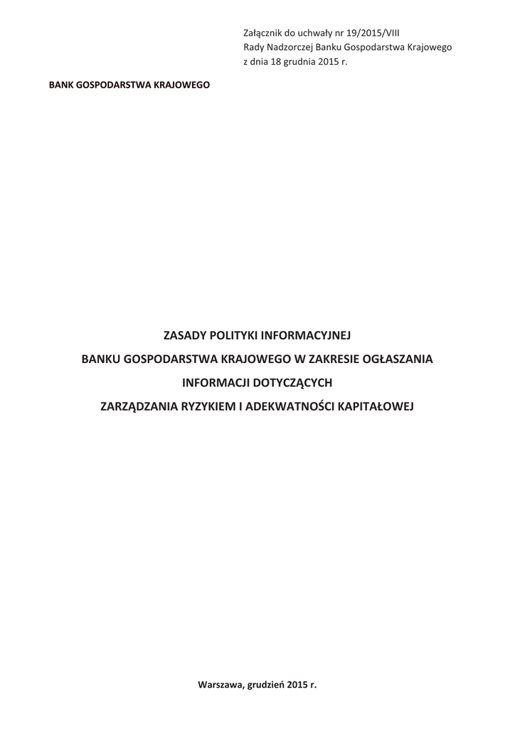 Załącznik do uchwały nr 19/2015/VIII Rady Nadzorczej Banku Gospodarstwa Krajowego z dnia 18 grudnia 2015 r. BANK GOSPODARSTWA KRAJOWEGO ZASADY POLITYKI INFORMACYJNEJ BANKU GOSPODARSTWA KRAJOWEGO W ZAKRESIE OGŁASZANIA INFORMACJI DOTYCZĄCYCH ZARZĄDZANIA RYZYKIEM I ADEKWATNOŚCI KAPITAŁOWEJ Warszawa, grudzień 2015 r. I. Podstawa prawna § 1. Zgodnie z art. 3 ust. 1a pkt 2 lit. g ustawy z dnia 14 marca 2003 r. o Banku Gospodarstwa Krajowego (Dz. U. z 2014 r. poz. 510, z późn. zm.), Bank Gospodarstwa Krajowego, zwany dalej „Bankiem” lub „BGK”, udostępnia informacje o charakterze jakościowym i ilościowym dotyczące zarządzania ryzykiem i adekwatności kapitałowej w formie sprawozdania w zakresie zarządzania ryzykiem i adekwatności kapitałowej Banku, na zasadach określonych w art. 431 - 455 rozporządzenia Parlamentu Europejskiego i Rady (UE) nr 575/2013 z dnia 26 czerwca 2013 r. w sprawie wymogów ostrożnościowych dla instytucji kredytowych i firm inwestycyjnych, zmieniającego rozporządzenie (UE) nr 648/2012 (Dz. U. UE L 176 z dnia 27 czerwca 2013 r., s. 1, z późn. zm.) zwanego dalej „CRR”. II. Informacje ogólne § 2. 1. „Zasady polityki informacyjnej Banku Gospodarstwa Krajowego w zakresie ogłaszania informacji dotyczących zarządzania ryzykiem i adekwatności kapitałowej”, zwane dalej „Zasadami polityki informacyjnej” ustala i zmienia Zarząd Banku, a zatwierdza Rada Nadzorcza Banku. 2. Zasady polityki informacyjnej są publikowane na stronie internetowej Banku www.bgk.pl w języku polskim. 3. Zasady polityki informacyjnej podlegają przeglądowi, nie rzadziej niż raz w roku, a ich weryfikacja przeprowadzana jest przez komórkę organizacyjną centrali Banku odpowiedzialną za zarządzanie adekwatnością kapitałową. 4. Weryfikacja Zasad polityki informacyjnej uwzględnia w szczególności zgodność z przepisami powszechnie obowiązującymi i wewnętrznymi aktami normatywnymi Banku oraz rynkowe praktyki dotyczące ogłaszania informacji w zakresie zarządzania ryzykiem i adekwatności kapitałowej. 5. Bank zamieszcza informację na temat dostępu do Zasad polityki informacyjnej w miejscu wykonywania czynności bankowych. III. Zakres ogłaszanych informacji § 3. 1. Bank ogłasza informacje na podstawie danych jednostkowych, z uwagi na brak konieczności dokonywania konsolidacji ostrożnościowej zgodnie z zasadami określonymi w CRR. W przypadku objęcia podmiotu zależnego Banku obowiązkiem konsolidacji ostrożnościowej, Bank dokona weryfikacji Zasad polityki informacyjnej. 2. Bank ogłasza informacje, w szczególności w zakresie: 1) celów i zasad polityki zarządzania poszczególnymi rodzajami ryzyka; 2) funduszy własnych Banku; 3) wymogów kapitałowych; 4) ryzyka kredytowego i ryzyka kredytowego kontrahenta; 5) wykorzystania ocen zewnętrznych instytucji oceny wiarygodności kredytowej; 6) stosowanych przez Bank metod ograniczania ryzyka kredytowego; 7) ryzyka rynkowego; 8) ryzyka operacyjnego; 9) ryzyka stopy procentowej pozycji zakwalifikowanych do portfela bankowego; 10) ekspozycji kapitałowych nieuwzględnionych w portfelu handlowym; 11) polityki w zakresie wynagrodzeń pracowników, których działalność zawodowa ma istotny wpływ na profil ryzyka Banku; 12) dźwigni finansowej; 13) aktywów wolnych od obciążeń. 3. W ramach informacji, o których mowa w ust. 2, Bank publikuje także oświadczenie Zarządu Banku o adekwatności ustaleń dotyczących zarządzania ryzykiem oraz ogólnym profilu ryzyka Banku. 4. W zakresie ryzyka operacyjnego Bank ogłasza informacje, uwzględniając wytyczne określone przez Komisję Nadzoru Finansowego w Rekomendacji M dotyczącej zarządzania ryzykiem operacyjnym w bankach, stanowiącej załącznik do uchwały nr 8/2013 KNF z dnia 8 stycznia 2013 r. (Dz. Urz. KNF poz. 6). 5. W zakresie ryzyka płynności Bank ogłasza informacje, uwzględniając wytyczne określone przez Komisję Nadzoru Finansowego w Rekomendacji P dotyczącej zarządzania ryzykiem płynności finansowej banków, stanowiącej załącznik do uchwały nr 59/2015 KNF z dnia 10 marca 2015 r. (Dz. Urz. KNF poz. 14). 6. Bank, w ramach sprawozdania w zakresie zarządzania ryzykiem i adekwatności kapitałowej, nie ujawnia: 1) informacji (z wyjątkiem ujawnień określonych w art. 435 ust. 2 lit. c, art. 437 i art. 450 CRR), których pominięcie lub zniekształcenie nie może zmienić oceny lub decyzji osoby wykorzystującej takie informacje przy podejmowaniu decyzji ekonomicznych, albo wpłynąć na taką ocenę lub decyzję (informacje nieistotne); 2) informacji, których ujawnienie może mieć niekorzystny wpływ na pozycję Banku na rynku właściwym w rozumieniu przepisów o ochronie konkurencji i konsumentów; 3) informacji zastrzeżonych i poufnych, z wyjątkiem ujawnień określonych w art. 437 i 450 CRR. 7. W przypadku odstąpienia od ogłoszenia informacji, o których mowa w ust. 6 pkt 2 i 3, Bank podaje przyczyny odstąpienia oraz ujawnia ogólne dane z tego zakresu, o ile nie są to informacje, o których mowa w ust. 6 pkt 2 i 3. 8. Bank dokonuje oceny, czy ogłaszane informacje są wyczerpujące z uwagi na profil ryzyka Banku. W przypadku gdy taka ocena jest negatywna Bank ogłasza także niezbędne informacje dodatkowe. IV. Częstotliwość, termin i miejsce ogłaszania informacji § 4. 1. Sprawozdanie w zakresie zarządzania ryzykiem i adekwatności kapitałowej Banku jest ogłaszane raz w roku, z zastrzeżeniem ust. 2 i 3, na stronie internetowej Banku www.bgk.pl, w języku polskim, w terminie publikacji sprawozdania finansowego i sprawozdania z działalności Banku, według stanu na koniec roku kalendarzowego. Sprawozdanie jest dodatkowo publikowane w języku angielskim. 3/4 2. Raz na kwartał Bank ogłasza informacje dotyczące wysokości i struktury funduszy własnych, wysokości wymogów kapitałowych oraz współczynników kapitałowych i wskaźnika dźwigni. 3. Bank dopuszcza możliwość ogłaszania infor