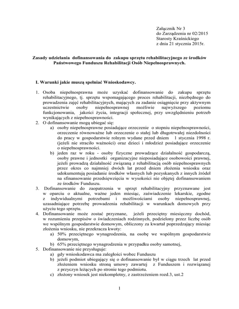 Załącznik Nr 3 do Zarządzenia nr 02/2015 Starosty Kraśnickiego z dnia 21 stycznia 2015r. Zasady udzielania dofinansowania do zakupu sprzętu rehabilitacyjnego ze środków Państwowego Funduszu Rehabilitacji Osób Niepełnosprawnych. I. Warunki jakie muszą spełniać Wnioskodawcy. 1. Osoba niepełnosprawna może uzyskać dofinansowanie do zakupu sprzętu rehabilitacyjnego, tj. sprzętu wspomagającego proces rehabilitacji, niezbędnego do prowadzenia zajęć rehabilitacyjnych, mających za zadanie osiągnięcie przy aktywnym uczestnictwie osoby niepełnosprawnej możliwie najwyższego poziomu funkcjonowania, jakości życia, integracji społecznej, przy uwzględnieniu potrzeb wynikających z niepełnosprawności. 2. O dofinansowanie mogą ubiegać się: a) osoby niepełnosprawne posiadające orzeczenie o stopniu niepełnosprawności, orzeczenie równoważne lub orzeczenie o stałej lub długotrwałej niezdolności do pracy w gospodarstwie rolnym wydane przed dniem 1 stycznia 1998 r. (jeżeli nie straciło ważności) oraz dzieci i młodzież posiadające orzeczenie o niepełnosprawności. b) jeden raz w roku - osoby fizyczne prowadzące działalność gospodarczą, osoby prawne i jednostki organizacyjne nieposiadające osobowości prawnej, jeżeli prowadzą działalność związaną z rehabilitacją osób niepełnosprawnych przez okres co najmniej dwóch lat przed dniem złożenia wniosku oraz udokumentują posiadanie środków własnych lub pozyskanych z innych źródeł na sfinansowanie przedsięwzięcia w wysokości nie objętej dofinansowaniem ze środków Funduszu. 3. Dofinansowanie do zaopatrzenia w sprzęt rehabilitacyjny przyznawane jest w oparciu o aktualne, ważne jeden miesiąc, zaświadczenie lekarskie, zgodne z indywidualnymi potrzebami i możliwościami osoby niepełnosprawnej, uzasadniające potrzebę prowadzenia rehabilitacji w warunkach domowych przy użyciu tego sprzętu. 4. Dofinansowanie może zostać przyznane, jeżeli przeciętny miesięczny dochód, w rozumieniu przepisów o świadczeniach rodzinnych, podzielony przez liczbę osób we wspólnym gospodarstwie domowym, obliczony za kwartał poprzedzający miesiąc złożenia wniosku, nie przekracza kwoty: a) 50% przeciętnego wynagrodzenia, na osobę we wspólnym gospodarstwie domowym, b) 65% przeciętnego wynagrodzenia w przypadku osoby samotnej, 5. Dofinansowanie nie przysługuje: a) gdy wnioskodawca ma zaległości wobec Funduszu b) jeżeli podmiot ubiegający się o dofinansowanie był w ciągu trzech lat przed złożeniem wniosku stroną umowy zawartej z Funduszem i rozwiązanej z przyczyn leżących po stronie tego podmiotu. c) złożony wniosek jest niekompletny, z zastrzeżeniem rozd.3, ust.2 1 d) jeżeli dane zawarte we wniosku lub załącznikach są niezgodne z prawdą. 6. Do wniosku należy dołączyć : a) kopię orzeczenia, lub kopię wypisu z treści orzeczenia , o którym mowa w art. 1 lub art.62 ustawy, a w przypadku osoby , o której mowa w art. 62 ust. 3 ustawy, kopie orzeczenia o stałej albo długotrwałej niezdolności do pracy w gospodarstwie rolnym wydanego przed dniem 1 stycznia 1998r. (jeśli orzeczenie to nie utraciło swojej ważności). b) aktualne zaświadczenie lekarskie. c) aktualną ofertę cenową d) pełnomocnictwo lub postanowienie sądu (jeżeli ustanowiono pełnomocnika lub opiekuna prawnego) 7. Wnioskodawca sam dokonuje wyboru sprzedawcy, dostawcy, urządzenia i ponosi za to pełną odpowiedzialność. 8. O zaistniałych zmianach po złożeniu wniosku Wnioskodawca zobowiązany jest poinformować PCPR w ciągu 14 dni od zaistniałego zdarzenia. II. Wysokość dofinansowania . 1. Wysokość dofinansowania wynosi do 80% kosztów sprzętu, nie więcej jednak niż do wysokości pięciokrotnego przeciętnego wynagrodzenia. 2. Przekroczenie kosztów ponad wysokość przyznanego dofinansowania Wnioskodawca pokrywa ze środków własnych lub pozyskanych z innych źródeł. 3. Ustala się limit dofinansowania do zakupu: a) roweru rehabilitacyjnego stacjonarnego – do wysokości 400,00zł b) trenażera eliptycznego – do kwoty 500,00 zł c) ergometru - do kwoty 600,00 zł d) łóżka ortopedycznego (rehabilitacyjnego) – do kwoty 1700,00 zł e) bieżni elektrycznej – do kwoty 600,00 zł 4. Dofinansowanie nie może obejmować kosztów realizacji zadania poniesionych przed przyznaniem środków finansowych i zawarciem umowy o dofinansowanie. III. Zasady rozpatrywania i realizacji wniosków o udzielenie dofinansowania do sprzętu rehabilitacyjnego. 1. Wnioski przyjmowane są w ciągu całego roku kalendarzowego. 2. Wnioski niekompletne podlegają uzupełnieniu w terminie wyznaczonym przez PCPR. Nie uzupełnienie wniosku w wyznaczonym terminie wyklucza wniosek z realizacji w danym roku kalendarzowym. 3. Wnioski rozpatrywane są w miarę posiadanych środków finansowych, po zatwierdzeniu przez Radę Powiatu w drodze uchwały zadań, na które przeznacza się w danym roku środki finansowe. 4. W wyjątkowych i szczególnych przypadkach istnieje możliwość rozpatrzenia wniosku w trybie wcześniejszym pod warunkiem otrzymania z PFRON zaliczki, umożliwiającej bieżące finansowanie zadania. 2 5. Wnioski rozpatrywane są według kolejności ich złożenia. W uzasadnionych przypadkach istnieje możliwość rozpatrzenia wniosku poza kolejnością, o czym każdorazowo będzie podejmował decyzję Dyrektor PCPR. 6. Dofinansowaniem ze środków finansowych Funduszu może być objęty zakup urządzeń zawartych w katalogu (pkt.IV). 7. W przypadku złożenia wniosku o dofinansowanie sprzętu rehabilitacyjnego, który nie jest zawarty w katalogu (pkt.IV), a jego zakup jest uzasadniony potrzebami wynikającymi z niepełnosprawności i jest to potwierdzone zaświadczeniem lekarskim stwierdzającym zasadność ubiegania się o dofinansowanie, każdorazowo decyzję będzie podejmował Dyrektor PCPR. 8. PCPR zastrzega sobie możliwość dowolnego wyboru przedstawionej oferty. 9. Decyzję o przyznan
