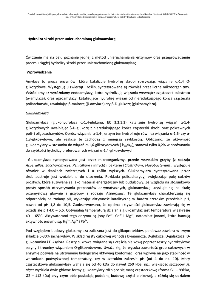 Przedruk materiałów dydaktycznych w całości lub w części możliwy w celu przygotowania do ćwiczeń z biochemii realizowanych w Katedrze Biochemii, WRiB SGGW w Warszawie. Inne wykorzystanie tych materiałów bez zgody pracowników Katedry Biochemii jest zabronione. Hydroliza skrobi przez unieruchomioną glukoamylazę Ćwiczenie ma na celu poznanie jednej z metod unieruchamiania enzymów oraz przeprowadzenie procesu ciągłej hydrolizy skrobi przez unieruchomioną glukoamylazę. Wprowadzenie Amylazy to grupa enzymów, która katalizuje hydrolizę skrobi rozrywając wiązanie α-1,4 Oglikozydowe. Występują u zwierząt i roślin, syntetyzowane są również przez liczne mikroorganizmy. Wśród amylaz wyróżniamy endoamylazy, które hydrolizują wiązania wewnątrz cząsteczek substratu (α-amylaza), oraz egzoamylazy, katalizujące hydrolizę wiązań od nieredukującego końca cząsteczki polisacharydu, uwalniając β-maltozę (β-amylaza) czy β-D-glukozę (glukoamylaza). Glukoamylaza Glukoamylaza (glukohydrolaza α-1,4-glukanu, EC 3.2.1.3) katalizuje hydrolizę wiązań α-1,4glikozydowych uwalniając β-D-glukozę z nieredukującego końca cząsteczki skrobi oraz pokrewnych poli- i oligosacharydów. Oprócz wiązania α-1,4-, enzym ten hydrolizuje również wiązania α-1,6- czy α1,3-glikozydowe, ale reakcje te zachodzą z mniejszą szybkością. Obliczono, że aktywność glukoamylazy w stosunku do wiązań α-1,6-glikozydowych ( kcat/Km), stanowi tylko 0,2% w porównaniu do szybkości hydrolizy preferowanych wiązań α-1,4-glikozydowych. Glukoamylaza syntetyzowana jest przez mikroorganizmy, przede wszystkim grzyby (z rodzaju Aspergillus, Saccharomyces, Penicillium i innych) i bakterie (Clostridium, Flavobacterium), występuje również w tkankach zwierzęcych i u roślin wyższych. Glukoamylaza syntetyzowana przez drobnoustroje jest wydzielana do otoczenia. Rozkłada polisacharydy, zwiększając pulę cukrów prostych, które zużywane są jako materiał energetyczny lub budulcowy. Ze względu na stosunkowo prosty sposób otrzymywania preparatów enzymatycznych, glukoamylazę uzyskuje się na skalę przemysłową głównie z grzybów z rodzaju Aspergillus. Te glukoamylazy charakteryzują się odpornością na zmiany pH, wykazując aktywność katalityczną w bardzo szerokim przedziale pH, nawet od pH 1,8 do 10,5. Zaobserwowano, że optima aktywności glukoamylaz zawierają się w przedziale pH 4,0 – 5,6. Optymalną temperaturą działania glukoamylaz jest temperatura w zakresie 40 – 65°C. Aktywatorami tego enzymu są jony Fe 2+, Co2+ i Mg2+, natomiast jonami, które hamują aktywność enzymu są: Hg2+, Ag2+ i Pb2+. Pod względem budowy glukoamylaza zaliczana jest do glikoproteidów, ponieważ zawiera w swym składzie 6-30% sacharydów. W skład reszty cukrowej wchodzą D-mannoza, D-glukoza, D-galaktoza, Dglukozamina i D-ksyloza. Reszty cukrowe związane są z częścią białkową poprzez reszty hydroksylowe seryny i treoniny wiązaniem O-glikozydowym. Uważa się, że wysoka zawartość grup cukrowych w enzymie pozwala na utrzymanie biologicznie aktywnej konformacji oraz wpływa na jego stabilność w warunkach podwyższonej temperatury, czy w szerokim zakresie pH (od 4 do ok. 10). Masy cząsteczkowe glukoamylazy wahają się od 40 kDa do nawet 250 kDa, np.: większość szczepów A. niger wydziela dwie główne formy glukoamylazy różniące się masą cząsteczkową (forma G1 – 99kDa, G2 – 112 kDa) przy czym obie posiadają podobną budowę części białkowej, a różnią się udziałem Przedruk materiałów dydaktycznych w całości lub w części możliwy w celu przygotowania do ćwiczeń z biochemii realizowanych w Katedrze Biochemii, WRiB SGGW w Warszawie. Inne wykorzystanie tych materiałów bez zgody pracowników Katedry Biochemii jest zabronione. części cukrowej (we frakcji cięższej udział reszt cukrowych jest dwa razy większy). Część białkowa składa się z dwóch domen, domeny katalitycznej i domeny wiążącej skrobię. Domena katalityczna składa się z 13 α-helis, z czego 12 tworzy kształt podobny do beczki [(α/α)6-barrel]. Wewnątrz niej znajduje się centrum aktywne, utworzone przez 6 wysoce konserwatywnych odcinków α→α. Tu znajdują się kluczowe dla reakcji hydrolizy aminokwasy kontaktowe (A. awamori – Glu 179 i Glu400). Do C-terminalnej części domeny katalitycznej przyłączona jest, poprzez giętki łącznik, domena wiążąca skrobię. Po przeciwległych jej stronach znajdują się dwa regiony odpowiedzialne za przyłączanie substratu. Domena ta wiąże skrobię rozrywając jej zbitą strukturę, co wydatnie ułatwia jej hydrolizę przez domenę katalityczną. Glukoamylaza katalizuje hydrolizę wiązań glikozydowych z inwersją konfiguracji przy anomerycznym atomie węgla uwalnianego produktu. Zjawisko to zostało nazwane przegrupowaniem Waldena. Wynika ono z mechanizmu katalizowanej przez enzym reakcji. Mechanizm katalizy obejmuje przeniesienie protonu na glikozydowy atom tlenu przecinanego wiązania. Proton ten pochodzi z głównego katalizatora kwasowego jakim jest Glu 179 w glukoamylazie z A. niger. Drugi etap to nukleofilowy atak cząsteczki wody z udziałem głównego katalizatora zasadowego (Glu 400). Atak cząsteczki wody przebiega od strony głównego katalizatora zasadowego i w konfiguracji β przecinanego wiązania glikozydowego, stąd też uwolniona cząsteczka glukozy jest anomerem β. Zastosowanie glukoamylazy w przemyśle Skrobia jest głównym materiałem zapasowym roślin. Znanych jest kilka procesów, w trakcie których skrobia jest hydrolizowana. Na skalę techniczną stosuje się kwaśną hydrolizę lub też metody enzymatyczne. Wydajność procesu kwaśnej hydrolizy skrobi nie przekracza 80% w wyniku rewersji lub też rozkładu glukozy. Dlatego też metoda ta jest coraz rzadziej wykorzystywana i zastępowana tańszą i wydajniejszą o 5 – 12% metodą hydrolizy enzymatycznej. Otrzymuje się w ten