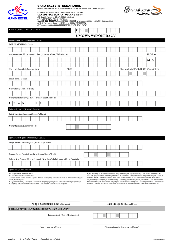 GANO EXCEL INTERNATIONAL Level 6, Menara BDB, No 88, Lebuhraya Darulaman, 05100 Alor Star, Kedah. Malaysia. REPREZENTOWANA PRZEZ PEŁNOMOCNIKA - SPÓŁKĘ GANODERMA NATURA POLSKA Sp.z o.o. ul.1 Dywizji Pancernej 45 , 43-300 Bielsko-Biała NIP: 5472078147 REGON: 240759868 tel. (+48) 033- 4985900 , fax. (+48) 033- 4985901, www.ganoexcel.pl, email:[email protected] PKO BP SA, numer konta : 23 1020 1390 0000 650202156784 IBAN: PL23102013900000650202156784, SWIFT: BPKOPLPW NUMER UCZESTNIKA SIECI (Code) P L UMOWA WSPÓŁPRACY 1) DANE OSOBISTE (Personal Details) IMIĘ I NAZWISKO (Name) Adres (Address), Ulica, Nr.domu, Kod pocztowy, Miasto, Województwo Płeć (Sex) M K Numer telefonu (Telephone number) PESEL Data urodzenia DD-MM-RRRR (Date of Birth) Email (Email address) Nazwa banku (Name of Bank) Numer konta bankowego IBAN (Bank Account Number) I B A N P L 2) Dane Sponsora (Sponsor's Details) Imię i Nazwisko Sponsora (Sponsor's Name) Numer Sponsora (Sponsor's Code) 3) Dane Beneficjenta (Beneficiary's Details) Imię i Nazwisko Beneficjenta (Beneficiary's Name) Data urodzenia Beneficjenta (Beneficiary's Date of Birth) Relacje Beneficjenta i Uczestnika sieci (Distributor's Relationship with the Beneficiary) 4) Deklaracja (Declaration) Swoim podpisem potwierdzam że: 1.Wszystkie ww.dane są prawdziwe. 2.Doręczono mi kodeks etyczny, Ogólne Warunki Współpracy zrozumiałem/łam ich treść i zobowiązuję się do ich przestrzegania. 3. Zapoznałem/am się z ogólnymi Zasadami Współpracy opisanymi na tylnej stronie niniejszej Umowy Współpracy, zrozumiałem/am ich treść oraz i zobowiązuję się do ich przestrzegania. Podpis Uczestnika sieci (Signature) Wyrażam zgodę na przetwarzanie moich danych osobowych w systemie firmy Ganoderma Natura Polska Sp.z o.o. będąca administratorem tych danych w rozumieniu ustawy o ochronie danych osobowych z dnia 29 sierpnia 1997 r. Dane przetwarzane będą przez administratora w celu prowadzenia działań marketingu bezpośredniego własnych produktów i usług. Dane mogą być przekazywane firmie Gano Excel International. Podanie danych jest dobrowolne. Przysługuje Państwu prawo do wglądu i zmianę tych danych. Jednocześnie wyrażam zgodę na przesyłanie informacji handlowych na wymienione adresy pocztowe i elektroniczne. Data i miejsce (Date and Place) Firmowe uwagi (wypełnia firma) (Office Use Only) Data rejestracji (Date of Registration) Imię i Nazwisko (Name) oryginał – firma (biała) / kopia – Uczestnik sieci (żółta) Pieczątka i podpis (Signature and Stamp) Verze: 01.02.2010 Zasady WSPÓŁPRACY 1.Postanowienia ogólne – zasady Uczestnik sieci – to osoba, która podpisała Umowę współpracy w celu nabywania produktów GANO EXCEL INTERNATIONAL do konsumpcji własnej lub odsprzedaży. GANO EXCEL INTERNATIONAL (zwana dalej „GE“), przez wzgląd na cele i wartości realizowane w ramach prowadzonej działalności z zakresu marketingu bezpośredniego, stworzyła Kodeks Etyczny, którego przestrzeganie stanowi podstawę współpracy Uczestnika sieci i GE. Naruszenie któregokolwiek z postanowień Kodeksu Etycznego, stanowi podstawę do rozwiązania umowy współpracy przez GE ze skutkiem natychmiastowym. Jeżeli w umowie nie jest inaczej wskazane, to wszelkie zobowiązania i uprawnienia GE dotyczą tylko i wyłącznie GANO EXCEL INTERNATIONAL. Ganoderma Natura Polska Sp. z o.o. (zwana dalej „GN PL”) jest podmiotem praw i obowiązków tylko w przypadku wyraźnego wskazania w umowie. Pojęcia użyte w niniejszej umowie powinny być interpretowane wyłącznie w sposób wynikający z treści i celów niniejszej umowy. Uczestnik sieci zobowiązuje się do zachowania w tajemnicy wszystkich informacji – w formie pisemnej, ustnej i elektronicznej – uzyskanych bezpośrednio lub pośrednio w związku lub przy okazji współpracy z GE. Dotyczy to w szczególności danych dotyczących struktury organizacyjnej, strategii, wszelkich aspektów działalności oraz innych szczegółów dotyczących GE. Obowiązek zachowania tajemnicy trwa również przez okres dwóch lat od dnia rozwiązania umowy. 2. Zasady Kodeksu Etycznego: Uczestnik sieci wykonując czynności związane z realizacją niniejszej umowy zobowiązany jest zachować należytą staranność i rzetelność. Uczestnik sieci nie może udzielać żadnych informacji na temat działalności i produktów GE, poza informacjami udzielanymi w związku z prezentacją planu marketingowego, osobom trzecim bez pisemnej zgody osób upoważnionych (wskazaną przez firmę GN PL). Uczestnikowi nie wolno wyrażać publicznie opinii i zajmować stanowisk sprzecznych ze stanowiskiem GE. Prezentacja planu marketingowego powinna opierać się wyłącznie o materiały firmowe i być przeprowadzona zgodnie z ogólnymi wytycznymi GE. Uczestnikowi sieci nie wolno wyrażać żadnych opinii na temat produktów lub sposobów działania firm konkurencyjnych. Uczestnikowi sieci nie wolno podejmować żadnych czynności zmierzających bezpośrednio lub pośrednio do wyrządzenia szkody GE lub innemu niezależnemu Uczestnikowi. Zakazane jest wykorzystywanie wszelkich informacji handlowych, a w szczególności informacji na temat działalności GE, materiałów szkoleniowych, dokumentów i akcesoriów ze znakiem towarowym GE itp., do prowadzenia innej działalności gospodarczej. Uczestnik sieci powinien dołożyć wszelkich możliwych starań, aby obsługa klientów wykonywana była według najwyższych standardów. 3. Warunki podjęcia i realizowania współpracy. Uczestnikami sieci mogą być osoby, które ukończyły 18 lat i posiadają pełną zdolność do czynności prawnych. Uczestnicy sieci nabywają towary do konsumpcji własnej lub w celu ich dalszej odsprzedaży. Osoba ubiegająca się o status Uczestnika sieci, przed podpisaniem umowy musi zostać zarekomendowana przez aktualnego Uczestnika sieci GE, który z momentem podpisania umowy przez osobę ubiegającą się, staje się jej „Sponsorem”. 
