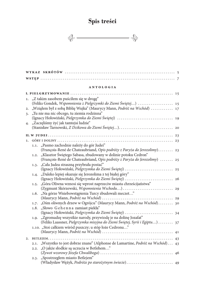 Spis treści w ykaz sk rótów . . . . . . . . . . . . . . . . . . . . . . . . . . . . . . . . . . . . . . . . . . . . . . . . . . . . . . . . . . . . 5 wst ęp . . . . . . . . . . . . . . . . . . . . . . . . . . . . . . . . . . . . . . . . . . . . . . . . . . . . . . . . . . . . . . . . . . . . . . . . . 7 antologia i. pi el g r z ymowa n ie . . . . . . . . . . . . . . . . . . . . . . . . . . . . . . . . . . . . . . . . . . . . . . . . . . . . . . . . 1. „Z takim zasobem puściłem się w drogę” (Feliks Gondek, Wspomnienia z Pielgrzymki do Ziemi Świętej…) . . . . . . . . . . . . . . . . . . . . 2. „Wziąłem był z sobą Biblię Wujka” (Maurycy Mann, Podróż na Wschód) . . . . . . . . . . . . . 3. „Tu nie ma nic obcego, tu ziemia rodzinna” (Ignacy Hołowiński, Pielgrzymka do Ziemi Świętej) . . . . . . . . . . . . . . . . . . . . . . . . . . . . . . . 4. „Zaczęliśmy żyć jak tamtejsi ludzie” (Stanisław Tarnowski, Z Dzikowa do Ziemi Świętej…). . . . . . . . . . . . . . . . . . . . . . . . . . . . . . 15 ii. w j u dei. . . . . . . . . . . . . . . . . . . . . . . . . . . . . . . . . . . . . . . . . . . . . . . . . . . . . . . . . . . . . . . . . . . . 1. góry i doliny. . . . . . . . . . . . . . . . . . . . . . . . . . . . . . . . . . . . . . . . . . . . . . . . . . . . . . . . . . . . . . . 1.1. „Pasmo zachodnie należy do gór Judei” (François-René de Chateaubriand, Opis podróży z Paryża do Jerozolimy). . . . . . . . . 1.2. „Klasztor Świętego Sabasa, zbudowany w dolinie potoku Cedron” (François-René de Chateaubriand, Opis podróży z Paryża do Jerozolimy) . . . . . . . . 1.3. „Cała Judea straszną przybrała postać” (Ignacy Hołowiński, Pielgrzymka do Ziemi Świętej) . . . . . . . . . . . . . . . . . . . . . . . . . . . 1.4. „Daleko lepiej okazuje się Jerozolima z tej białej góry” (Ignacy Hołowiński, Pielgrzymka do Ziemi Świętej). . . . . . . . . . . . . . . . . . . . . . . . . . . 1.5. „Góra Oliwna wznosi się wprost naprzeciw miasta chrześcijaństwa” (Zygmunt Skórzewski, Wspomnienia Wschodu…). . . . . . . . . . . . . . . . . . . . . . . . . . . . 1.6. „Na górze Wniebowstąpienia Turcy zbudowali meczet…” (Maurycy Mann, Podróż na Wschód). . . . . . . . . . . . . . . . . . . . . . . . . . . . . . . . . . . . . . . 1.7. „Ośm oliwnych drzew w Ogrójcu” (Maurycy Mann, Podróż na Wschód). . . . . . . . . 1.8. „Słowo G e h e n n a zamiast piekła” (Ignacy Hołowiński, Pielgrzymka do Ziemi Świętej). . . . . . . . . . . . . . . . . . . . . . . . . . . 1.9. „Zgromadzę wszystkie narody, przywiodę je na dolinę Jozafat” (Feliks Laassner, Pielgrzymka misyjna do Ziemi Świętej, Syrii i Egiptu…). . . . . . . . . 1.10. „Stoi całkiem wśród puszczy; u stóp łoże Cedronu…” (Maurycy Mann, Podróż na Wschód). . . . . . . . . . . . . . . . . . . . . . . . . . . . . . . . . . . . . . . 23 23 15 17 19 20 23 25 25 26 29 29 30 34 37 41 2. betlejem. . . . . . . . . . . . . . . . . . . . . . . . . . . . . . . . . . . . . . . . . . . . . . . . . . . . . . . . . . . . . . . . . . . . 43 2.1. „Wszystko to jest dobrze znane” (Alphonse de Lamartine, Podróż na Wschód). . . . 43 2.2. „O jakże słodkie są uczucia w Betlehem…” (Żywot wzorowy Józefa Chwaliboga). . . . . . . . . . . . . . . . . . . . . . . . . . . . . . . . . . . . . . . . 46 2.3. „Spostrzegłem miasto Betlejem” (Władysław Wężyk, Podróże po starożytnym świecie). . . . . . . . . . . . . . . . . . . . . . . . . . 49 218 spis treści 2.4. „Witaj Betlehem, domie chleba…” (Ignacy Hołowiński, Pielgrzymka do Ziemi Świętej). . . . . . . . . . . . . . . . . . . . . . . . . . . 2.5. „Pójść do Groty Narodzenia…” (Stanisław Tarnowski, Z Dzikowa do Ziemi Świętej…). . . . . . . . . . . . . . . . . . . . . . . . . 2.6. „Miasto Dawida […], a w Biblii tak często sławione” (Feliks Laassner, Pielgrzymka misyjna do Ziemi Świętej, Syrii i Egiptu…). . . . . . . . . 2.7. „Hic de Virgine Maria Jesus Christus natus est” (Maurycy Mann, Podróż na Wschód). . . . . . . . . . . . . . . . . . . . . . . . . . . . . . . . . . . . . . . 3. jerozolima . . . . . . . . . . . . . . . . . . . . . . . . . . . . . . . . . . . . . . . . . . . . . . . . . . . . . . . . . . . . . . . . . 3.1. „To tylko piękna zjawa miasta Dawida i Salomona” (Alphonse de Lamartine, Podróż na Wschód). . . . . . . . . . . . . . . . . . . . . . . . . . . . . . . . 3.2. „Meczet Omara wystawiony na równinie…” (Marie-Joseph Geramb, Trzyletnia pielgrzymka do Jerozolimy, Egiptu i na górę Synaj) . . . . . . . . . . . . . . . . . . . 3.3. „Miasto świętych i cudów” (Maurycy Mann, Podróż na Wschód). . . . . . . . . . . . . . . 3.4. „Bardzośmy byli ciekawi widzieć wnętrze meczetu Omara” (Zygmunt Skórzewski, Wspomnienia Wschodu…). . . . . . . . . . . . . . . . . . . . . . . . . . . . 3.5. „Wieczernik Pański” (Ignacy Hołowiński, Pielgrzymka do Ziemi Świętej). . . . . . . . . 3.6. „W Wielką Sobotę” (Andriej Nikołajewicz Murawiew, Podróż do miejsc świętych w 1830 roku) . . . . . . . . . . . . . . . . . . . . . . . . . . . . . . . . . . . . . 3.7. „Noc u Grobu Chrystusa” (Juliusz Słowacki, Listy do matki) . . . . . . . . . . . . . . . . . . . 3.8. „Spędziłem noc w kościele Świętego Grobu…” (Zygmunt Skórzewski, Wspomnienia Wschodu…). . . . . . . . . . . . . . . . . . . . . . . . . . . . 3.9. „Smutne zwracałem oczy do źródła miłości…” (Ignacy Hołowiński, Pielgrzymka do Ziemi Świętej). . . . . . . . . . . . . . . . . . . . . . . . . . . 3.10.„Chciano tu umieścić centrum świata” (Zygmunt Skórzewski, Wspomnienia Wschodu…). . . . . . . . . . . . . . . . . . . . . . . . . . . . 3.11.„Środek ziemi” (Maurycy Mann, Podróż na Wschód) . . . . . . . . . . . . . . . . . . . . . . . . . 3.12.„La tomba d‘Adamo” (Maurycy Mann, Podróż na Wschó